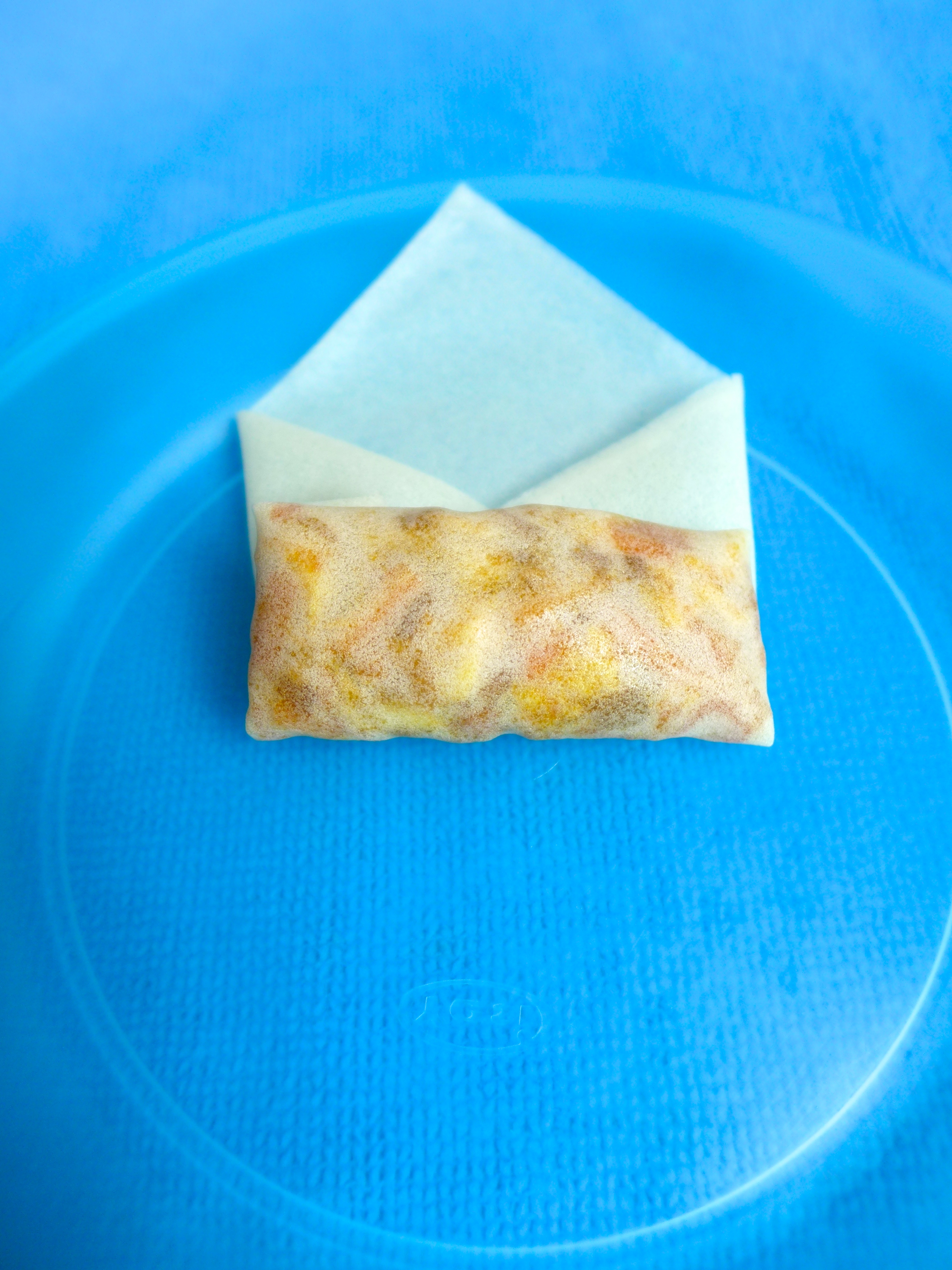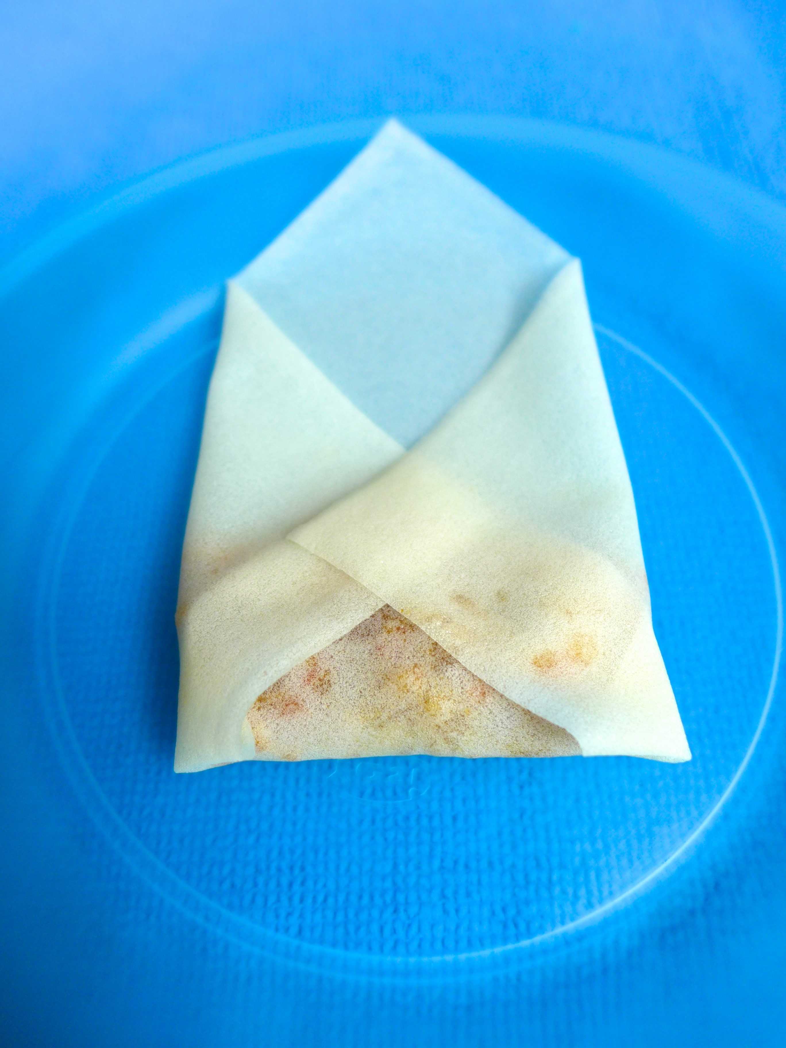 Relleno las láminas de pasta formando rollitos.