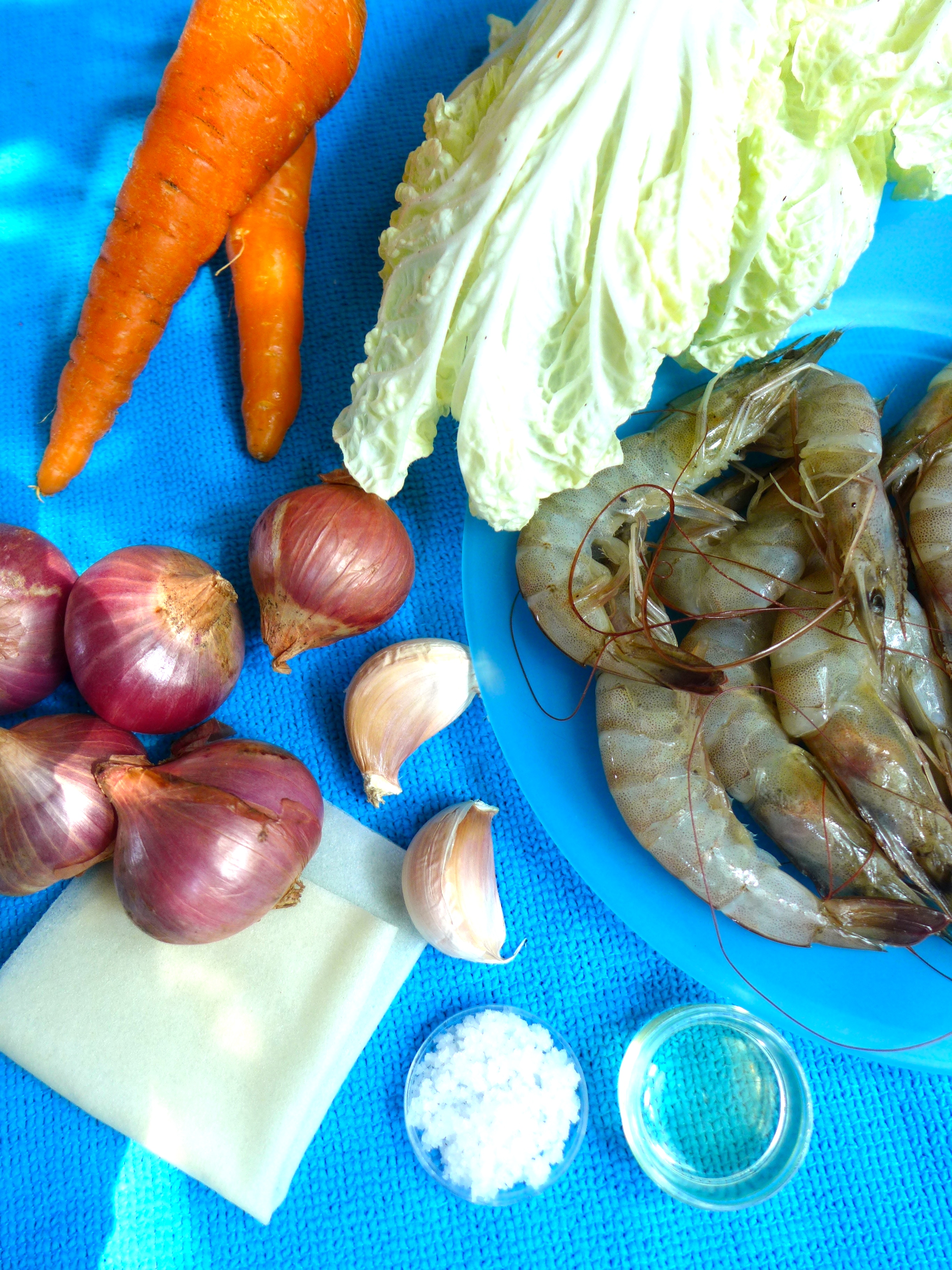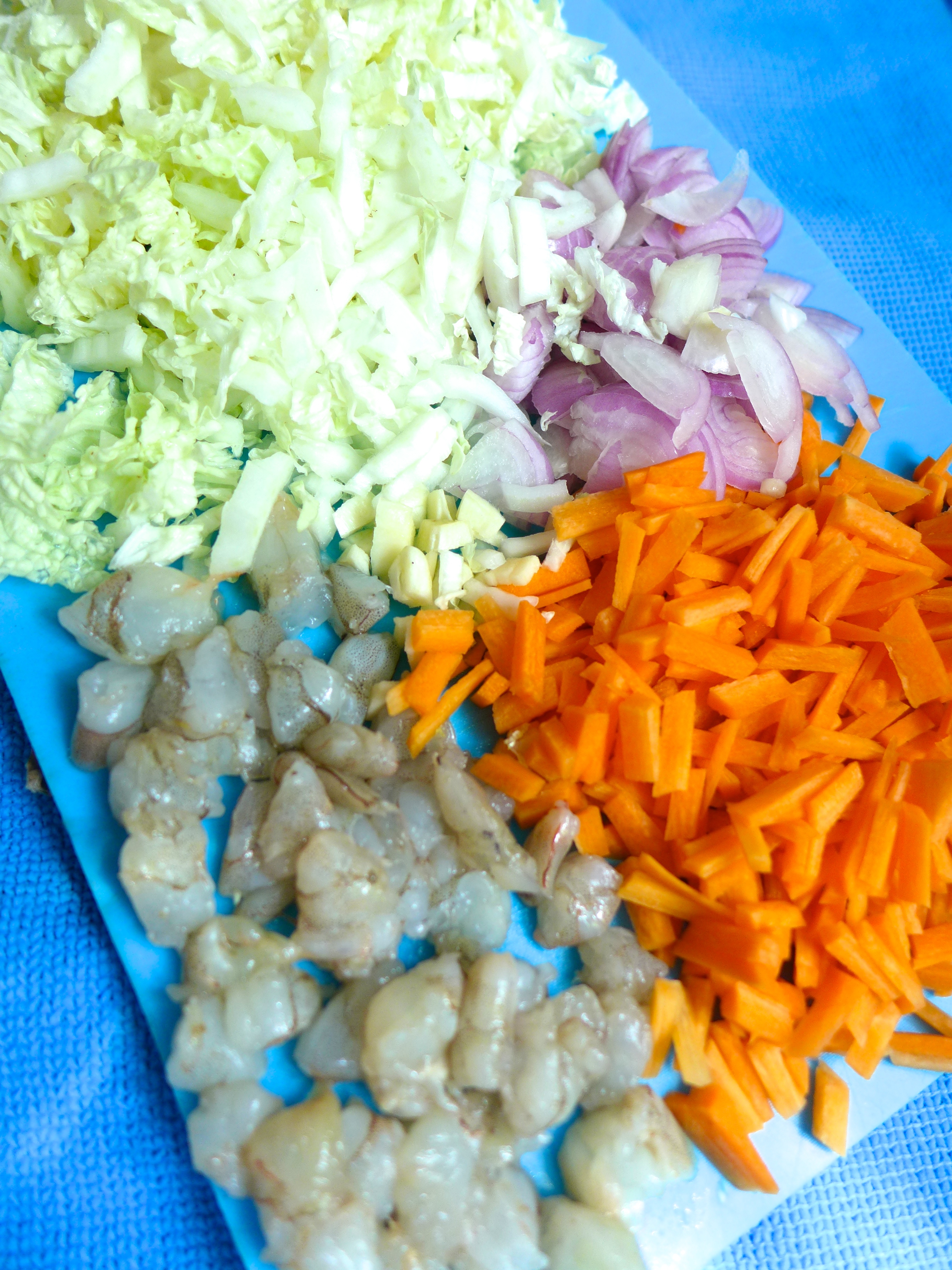 Lavo la col china, la escurro y la troceo junto con la zanahoria, los chalotes, el ajo y las gambas.