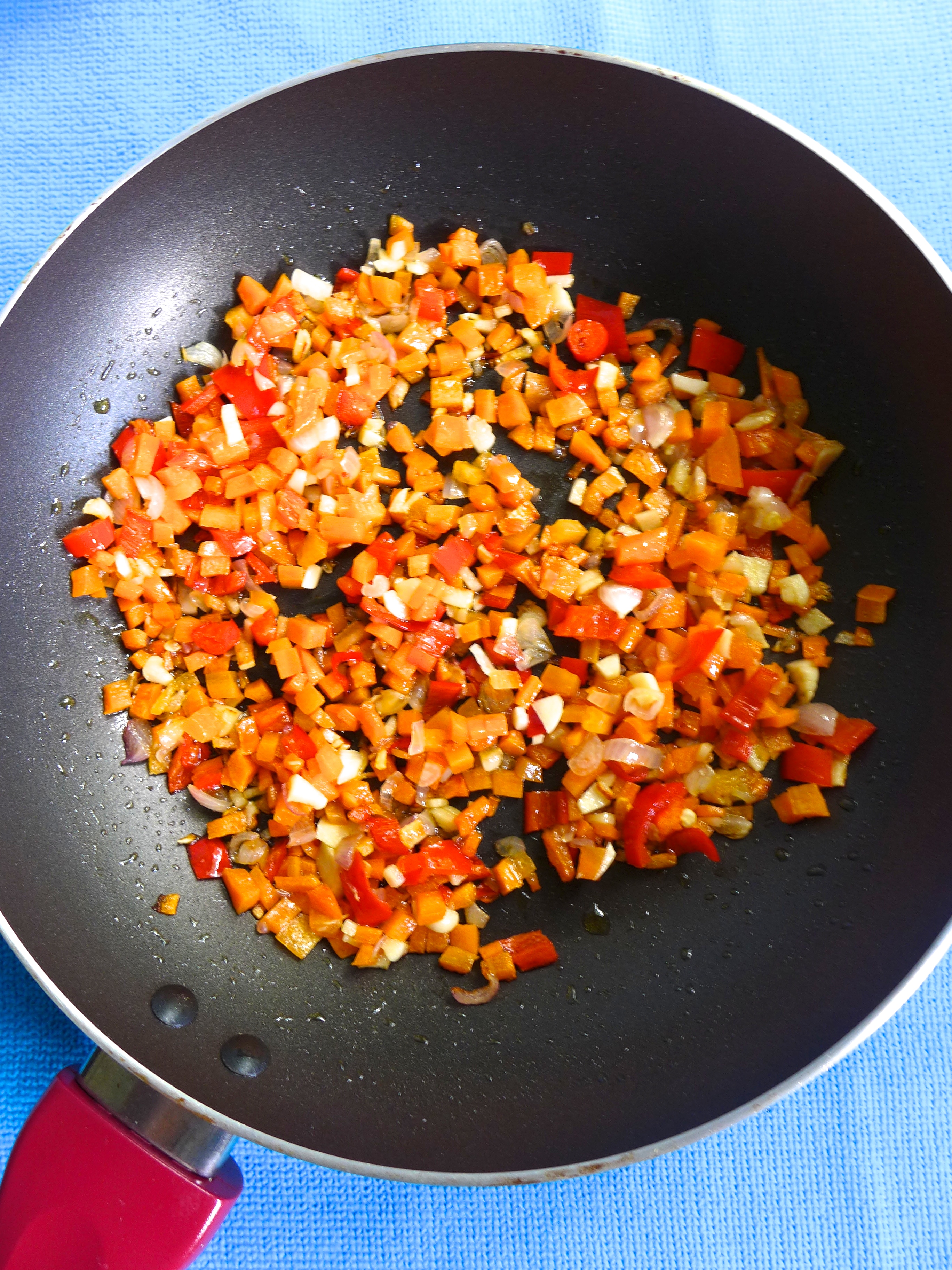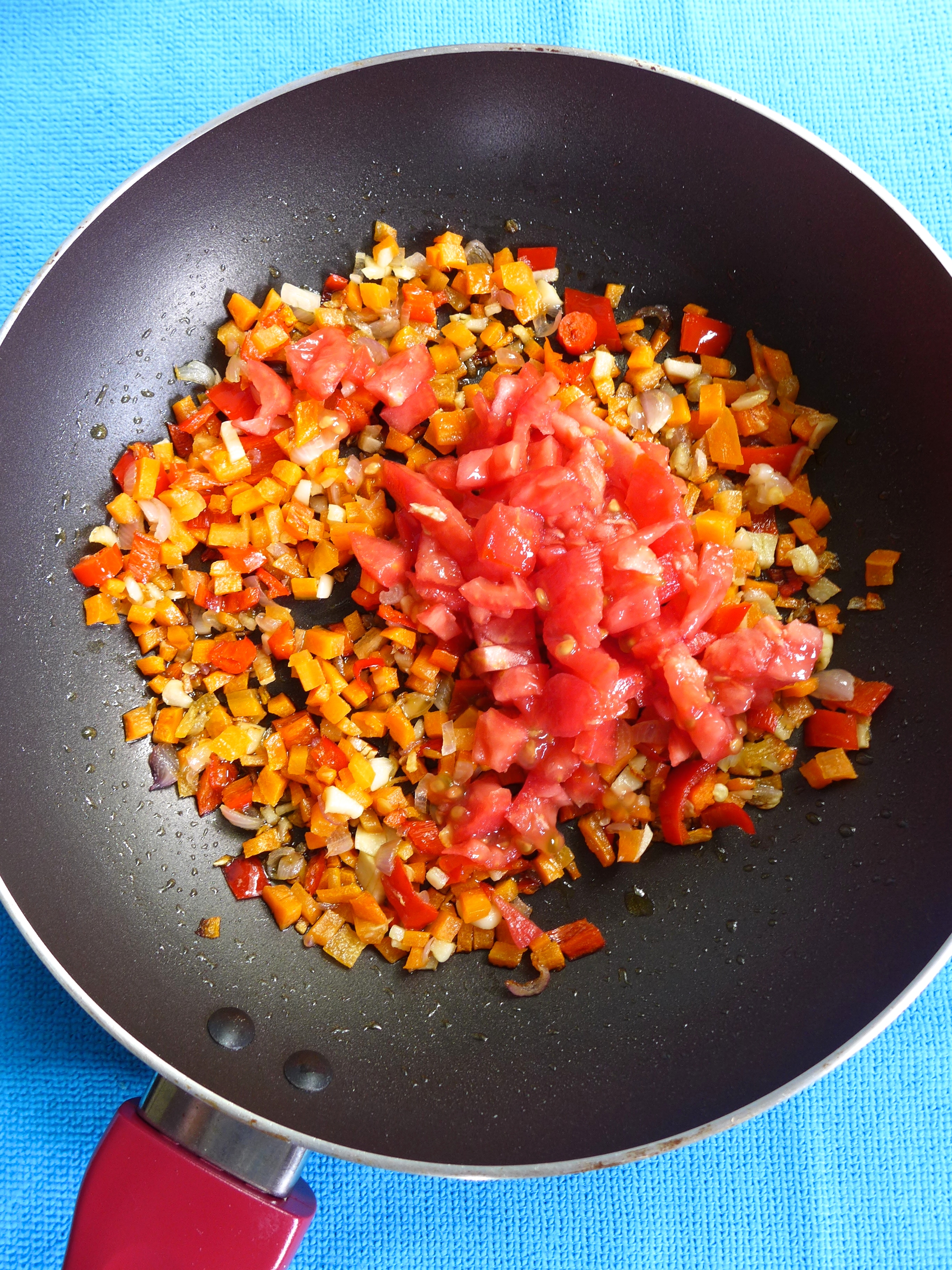 Pico la zanahoria, la guindilla, la cebolla y el ajo, y los salteo en una sartén con un poco de aceite a fuego medio-alto durante un par de minutos. Entonces, añado una pizca de sal y el tomate troceado.