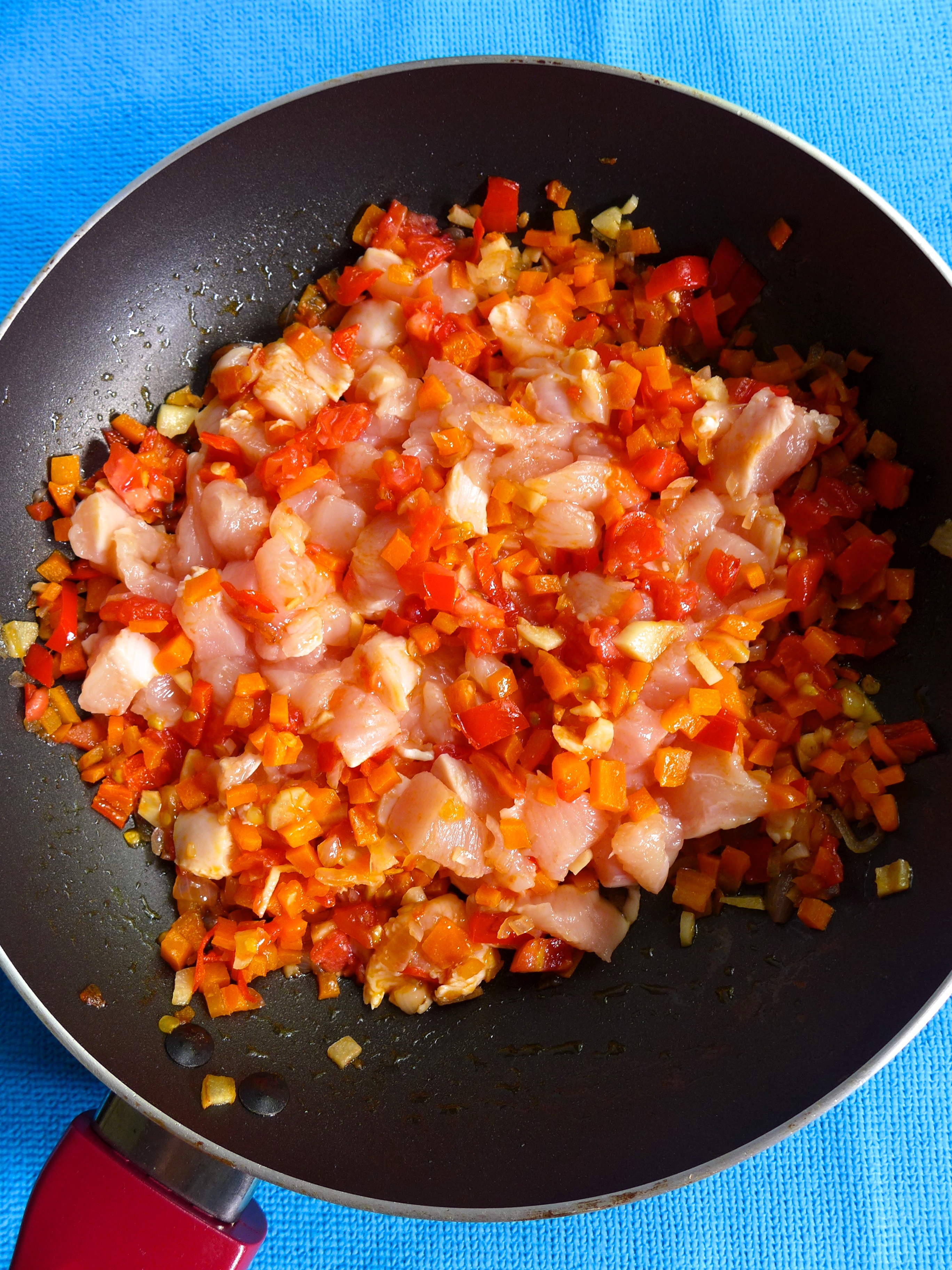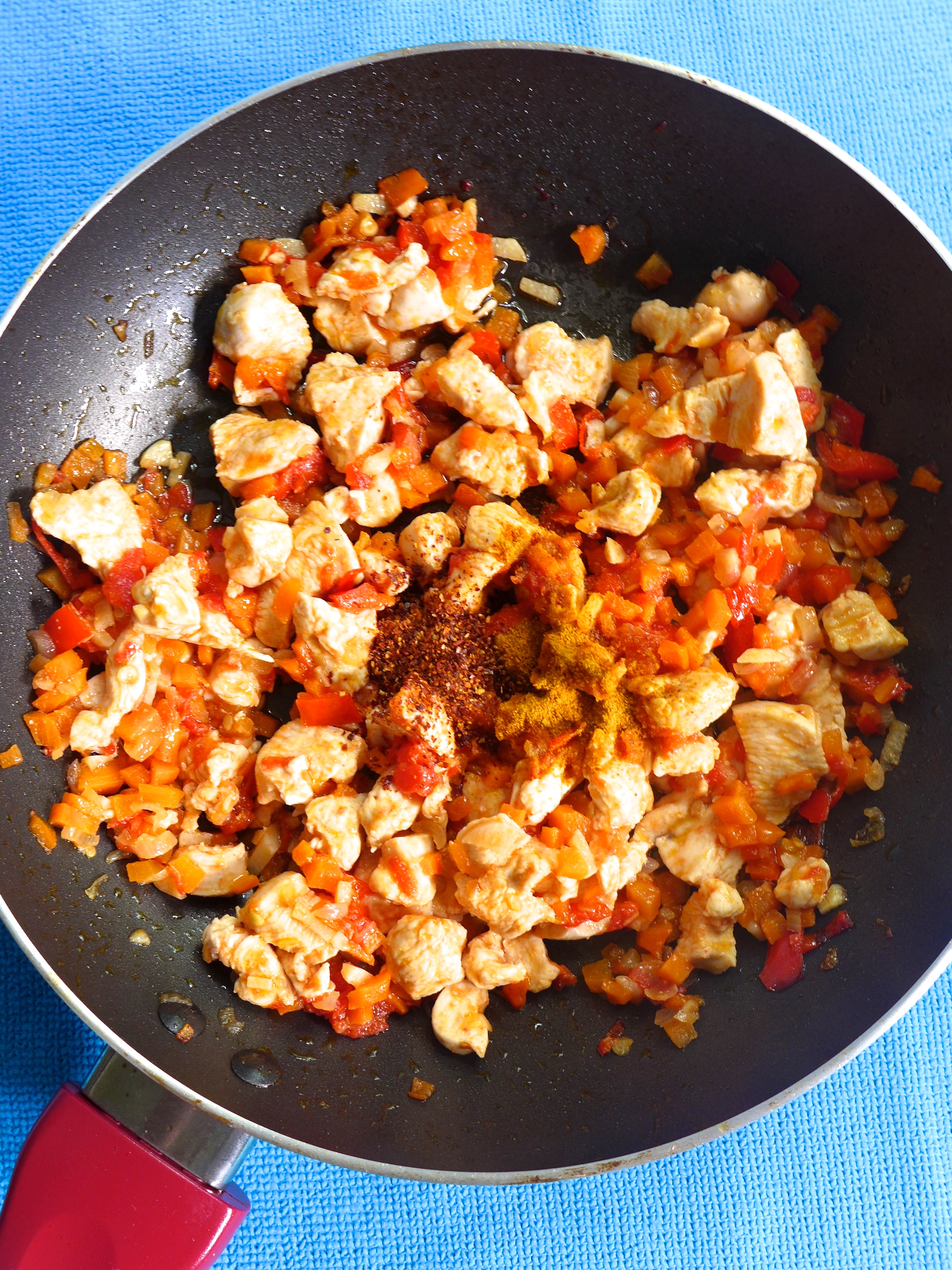 Parto el pollo en dados, lo añado a la sartén y lo rehogo durante otro par de minutos. Echo un chorro generoso de salsa, la cúrcuma y la guindilla en polvo.