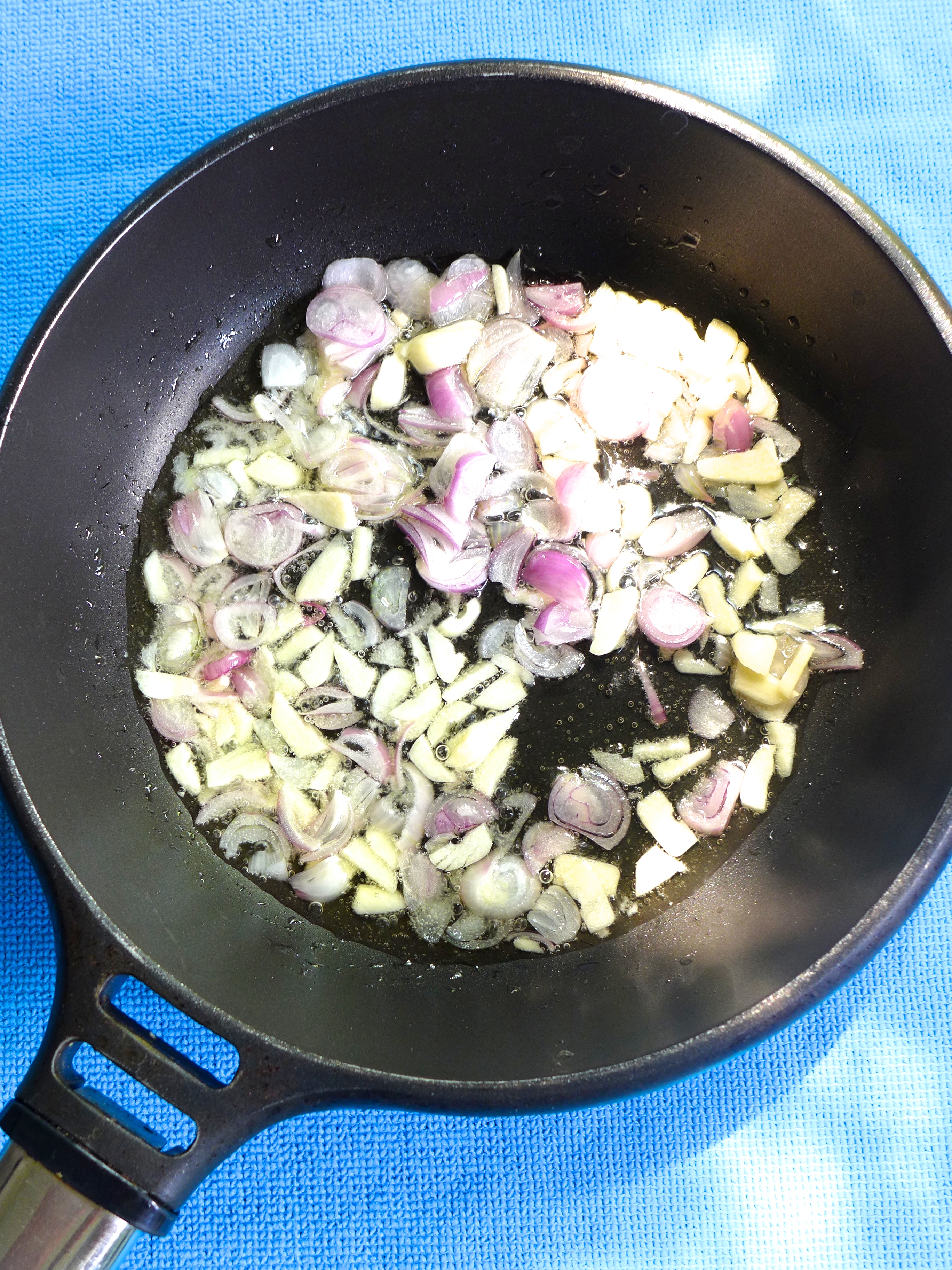 Mientras, lamino la mitad de los ajo y los chalotes, y los frío hasta que quedan dorados.