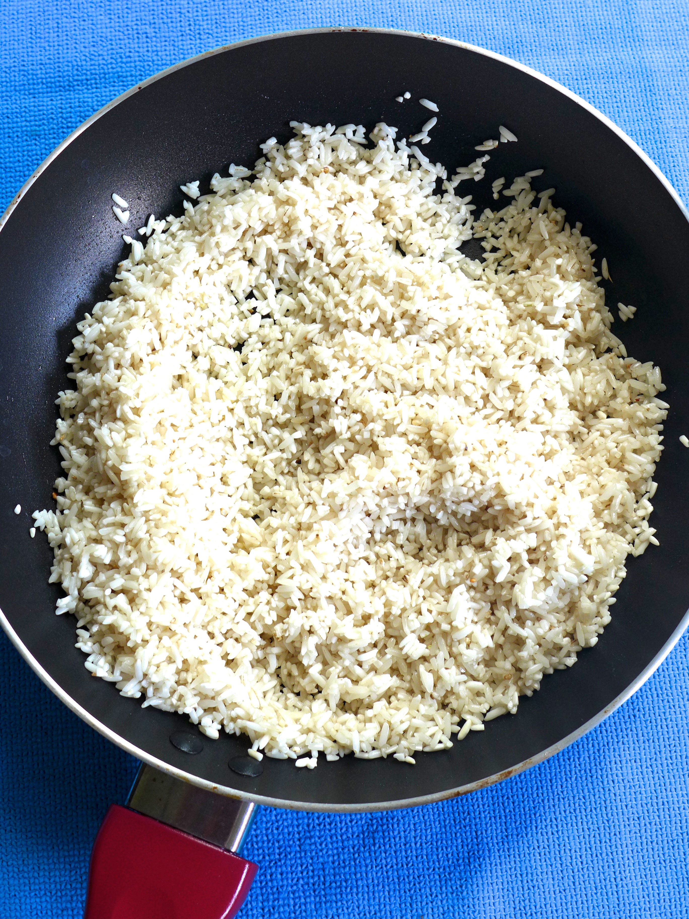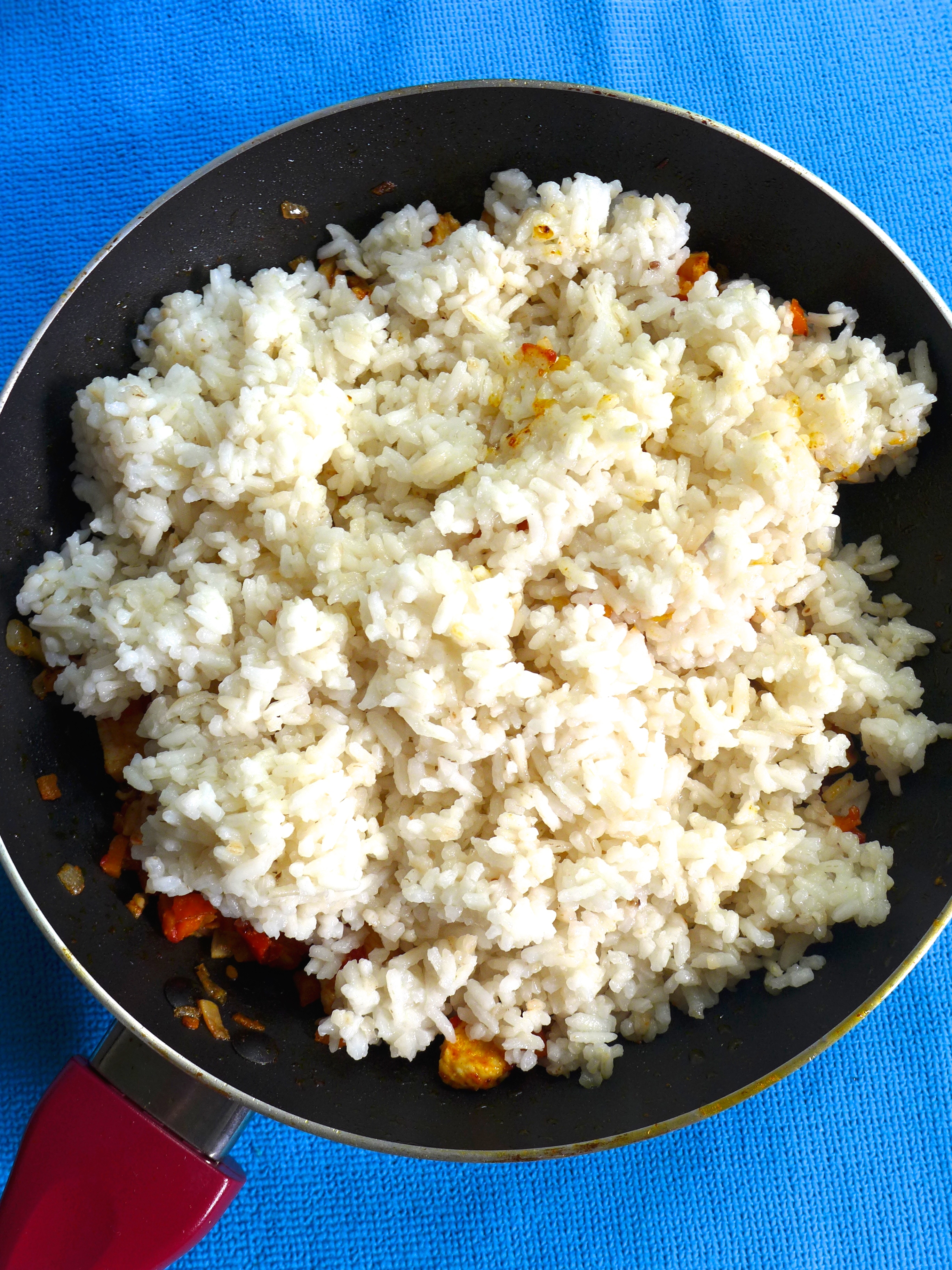 Rehogo el arroz en una sartén con un poco de aceite. Añado un poco de sal y el doble más uno de agua caliente (unos 3 vasos). Le doy una vuelta y lo dejo cocer a fuego bajo-medio durante unos 20 minutos.