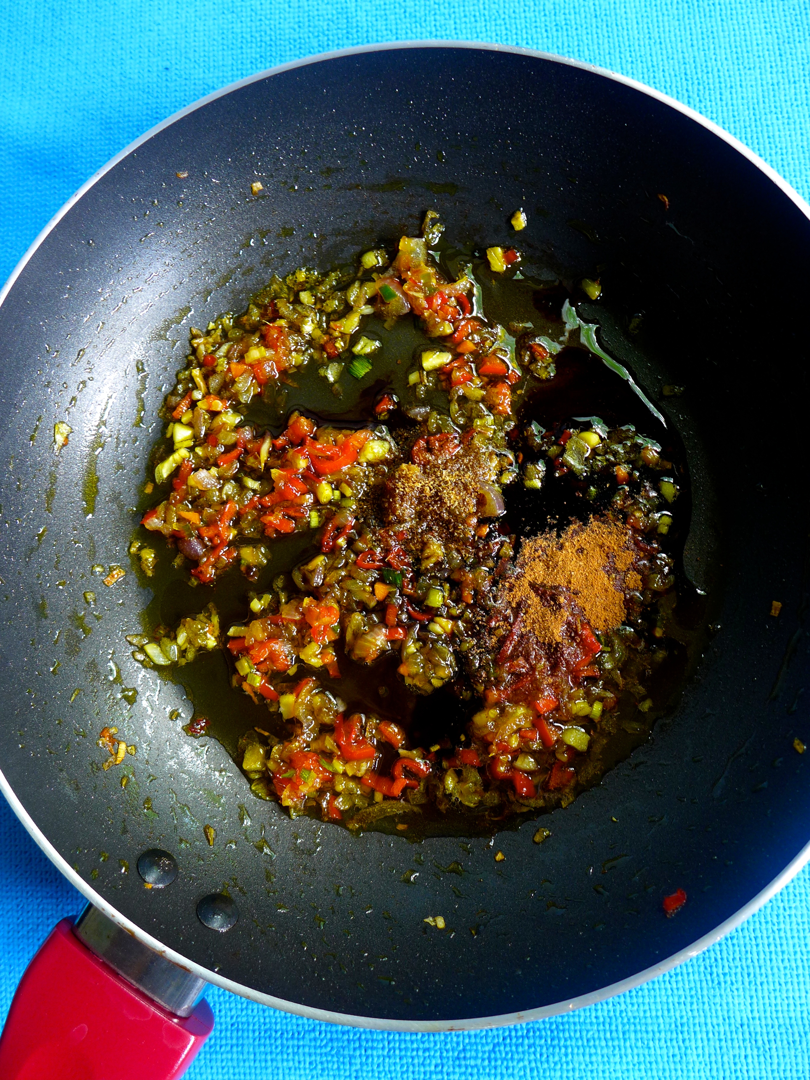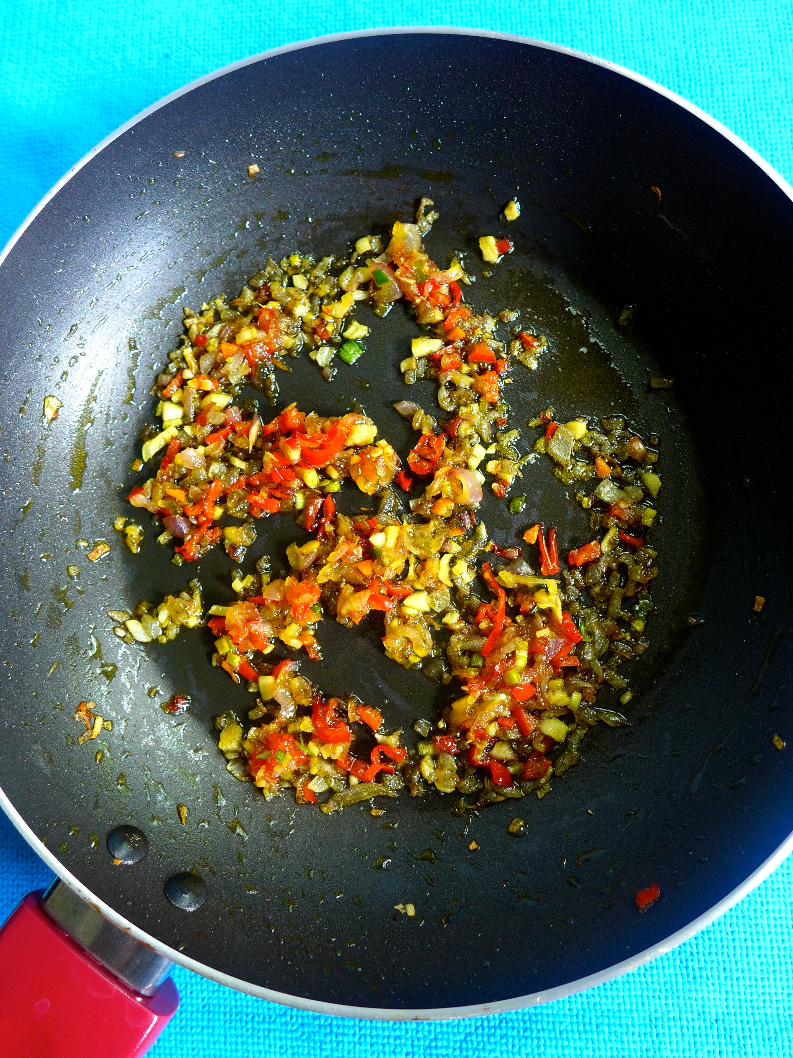 Empiezo picando los ingredientes para hacer la salsa: hierbalimón, chalotes, ajo, jengibre, cúrcuma y guindilla, y los sofrío en una sartén con un poco de aceite a fuego medio-alto durante un par de minutos. Añado el resto de los ingredientes (menos la leche de coco): miel, kecap manis, kecap ikan, comino y canela. Lo remuevo durante un minuto. Lo pruebo y echo más kecap ikan si no está suficientemente salado, o más guindilla si no está muy picante, o más miel o kecap manis si está salado. Retiro del fuego esta salsa y la reservo.