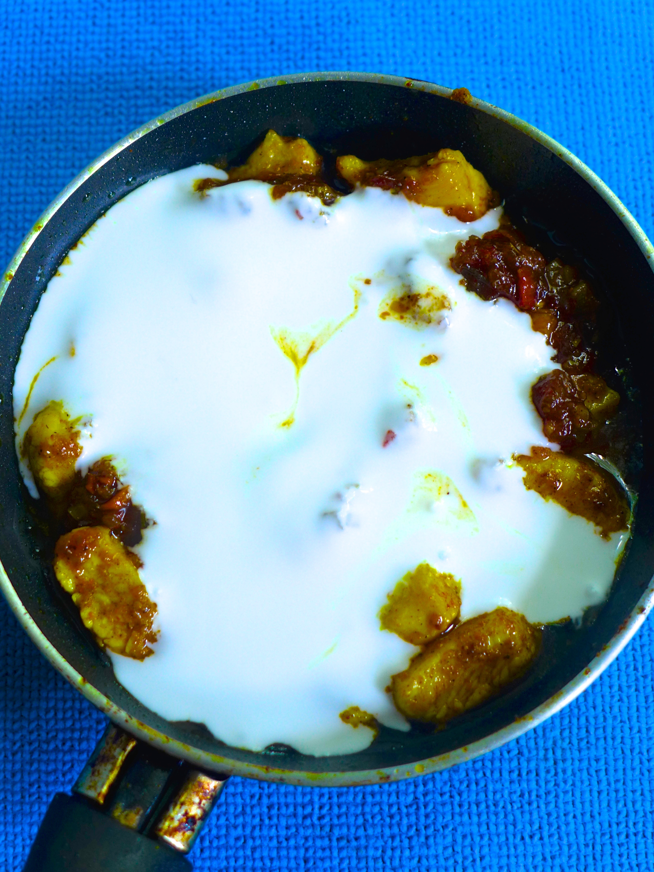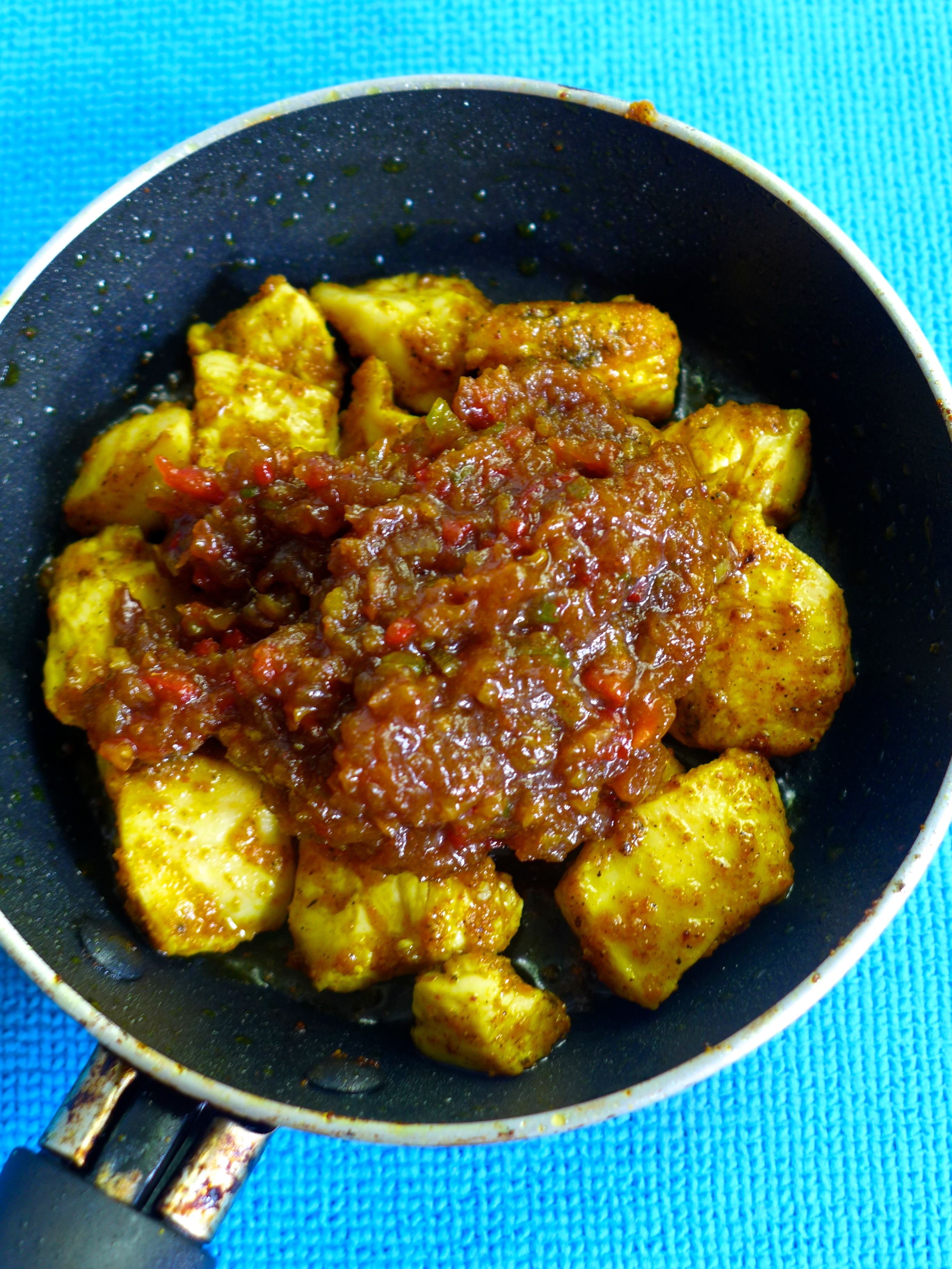 Troceo el pollo, lo salpimiento, le añado el curry y lo frío durante un par de minutos en una sartén con un poco de aceite a fuego medio-alto. Luego añado la salsa y la leche de coco. Bajo el fuego y lo dejo cociendo durante 3 ó 4 minutos, removiendo con frecuencia.