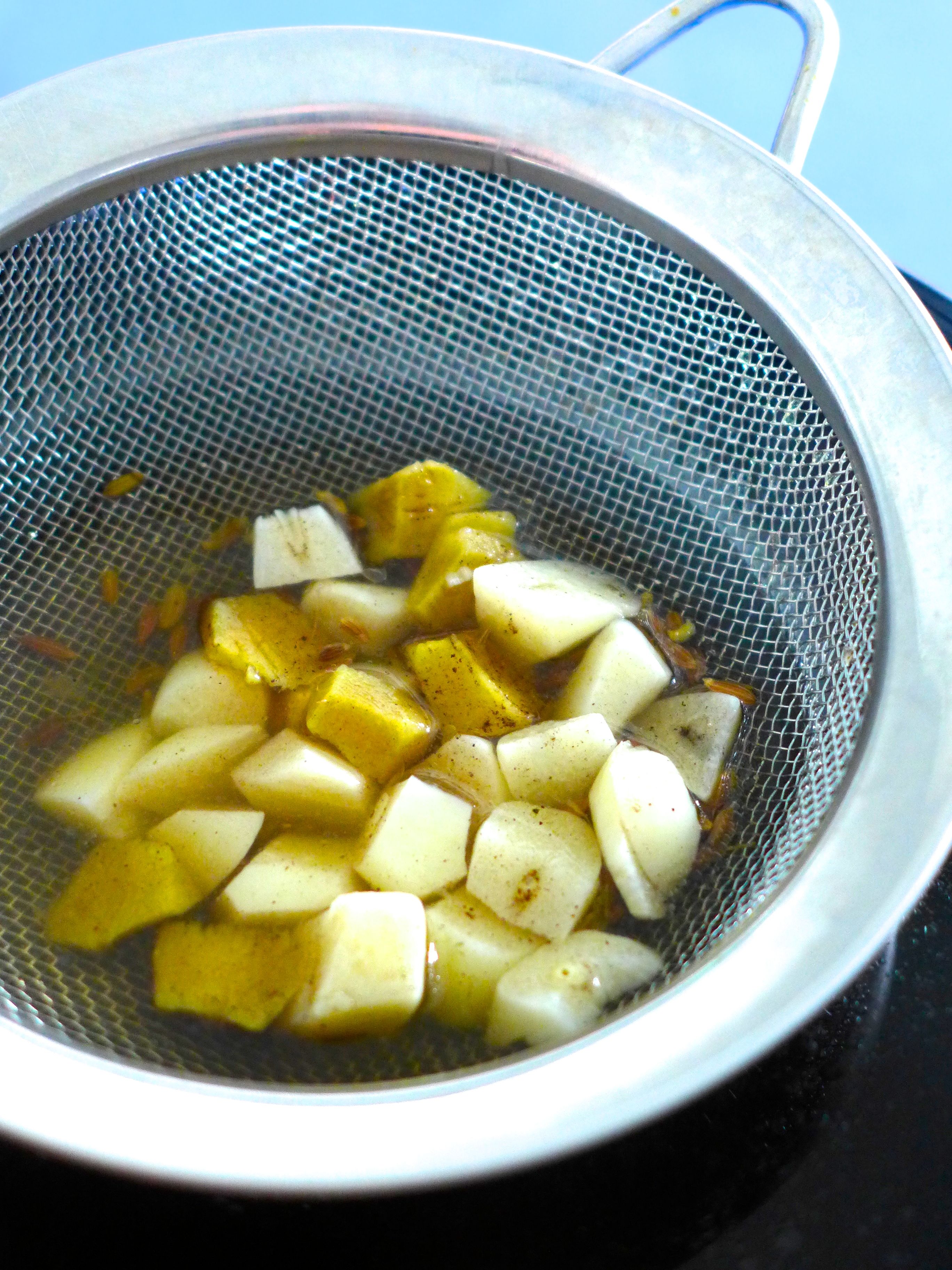Limpio y troceo el ajo y el jengibre. Caliento el agua en una cazuela junto con las semillas de hinojo, el comino, la pimienta negra, el ajo y el jengibre. Cuando rompe a hervir, lo retiro del fuego y lo cuelo.