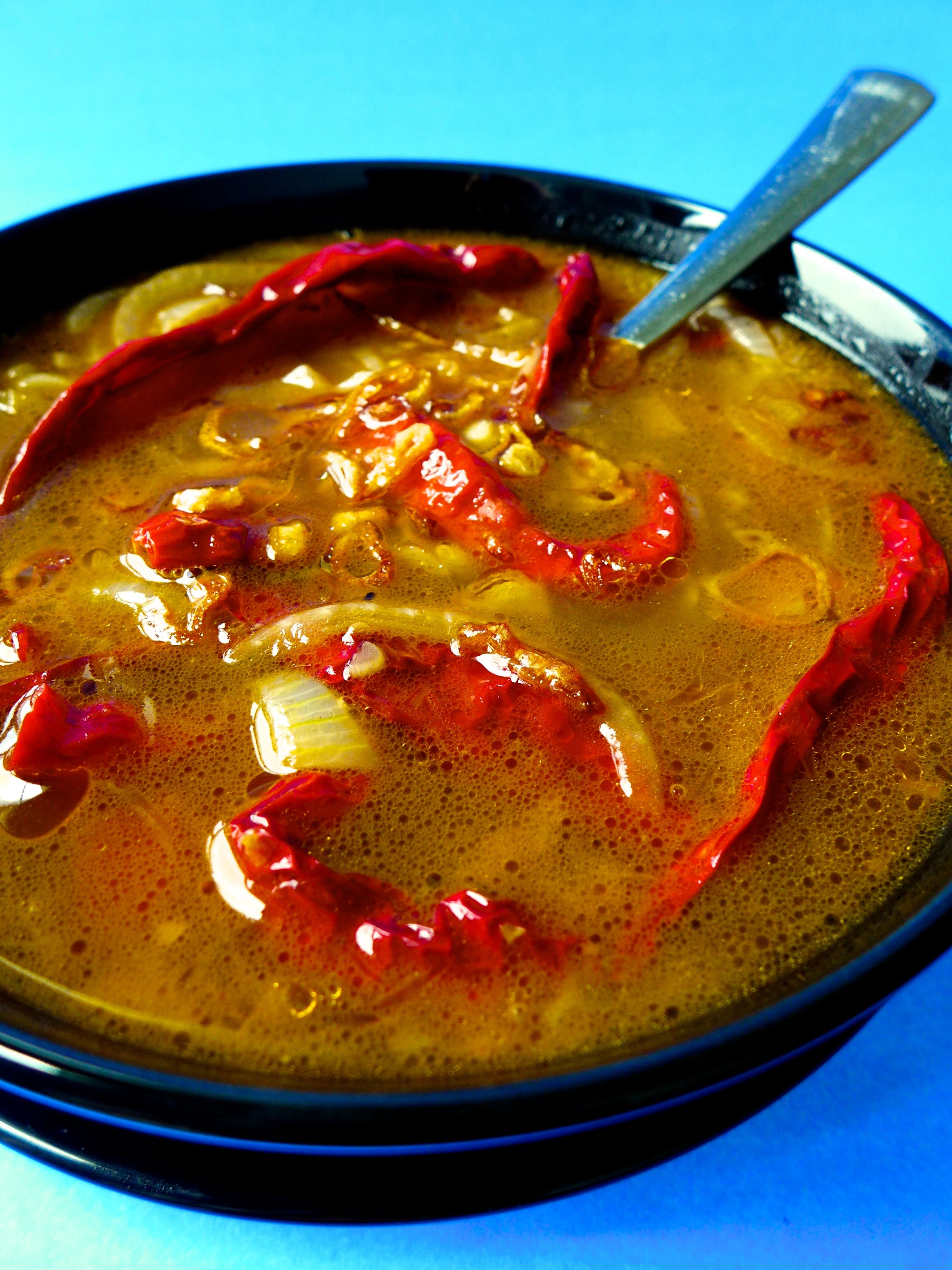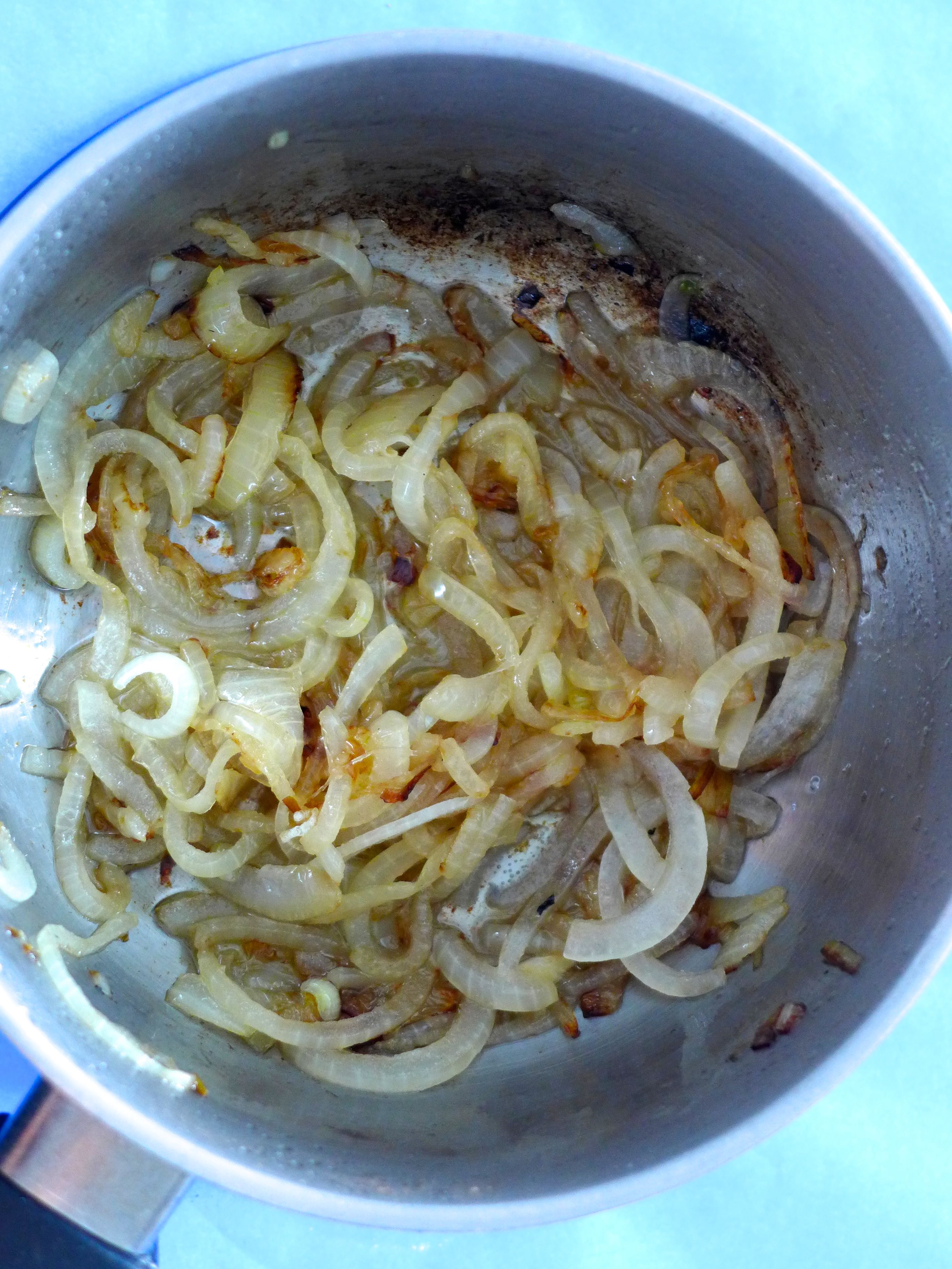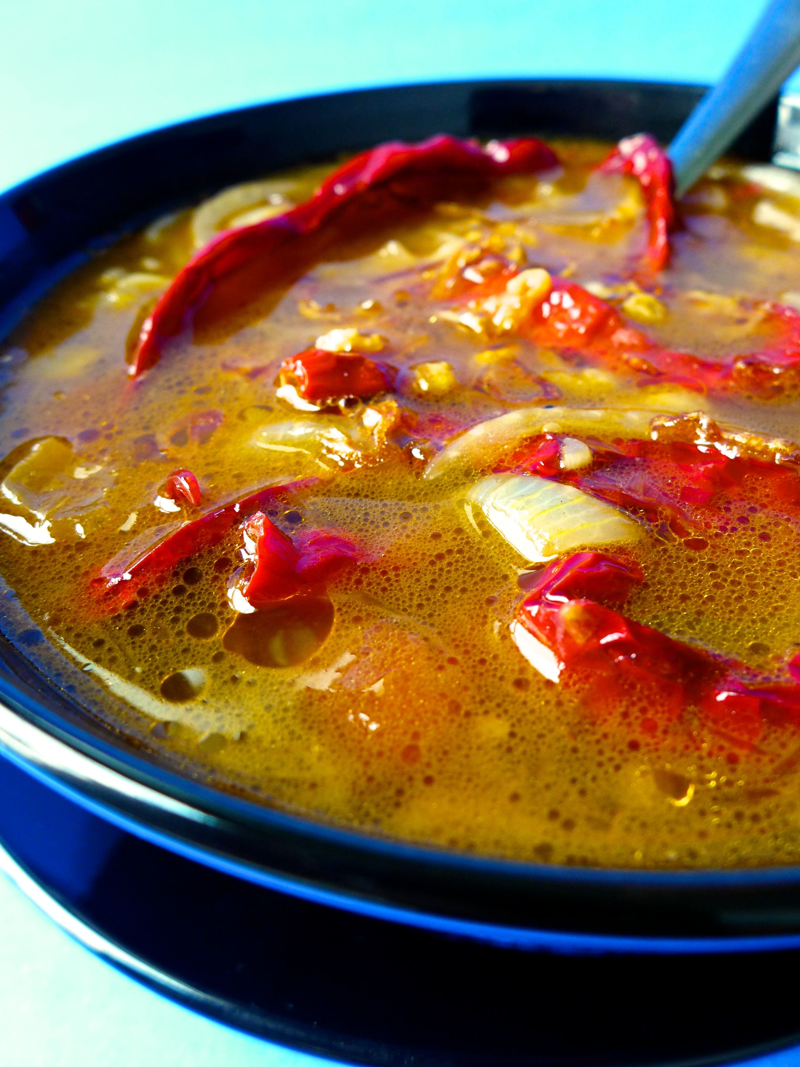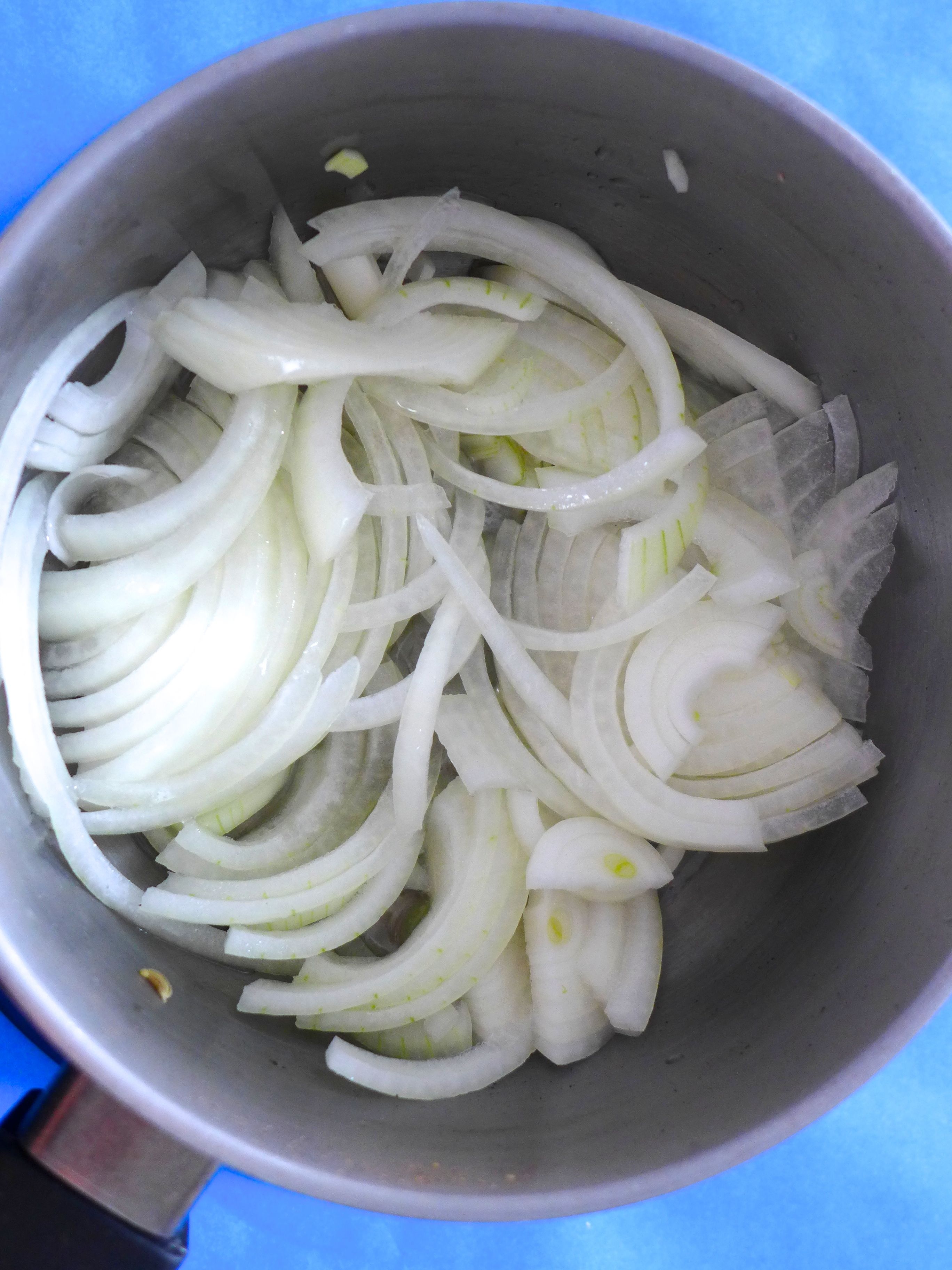 Parto la cebolla en juliana y la rehogo en una cazuela con un poco de aceite hasta que empieza a dorarse. Entonces, añado el caldo colado y las guindillas.