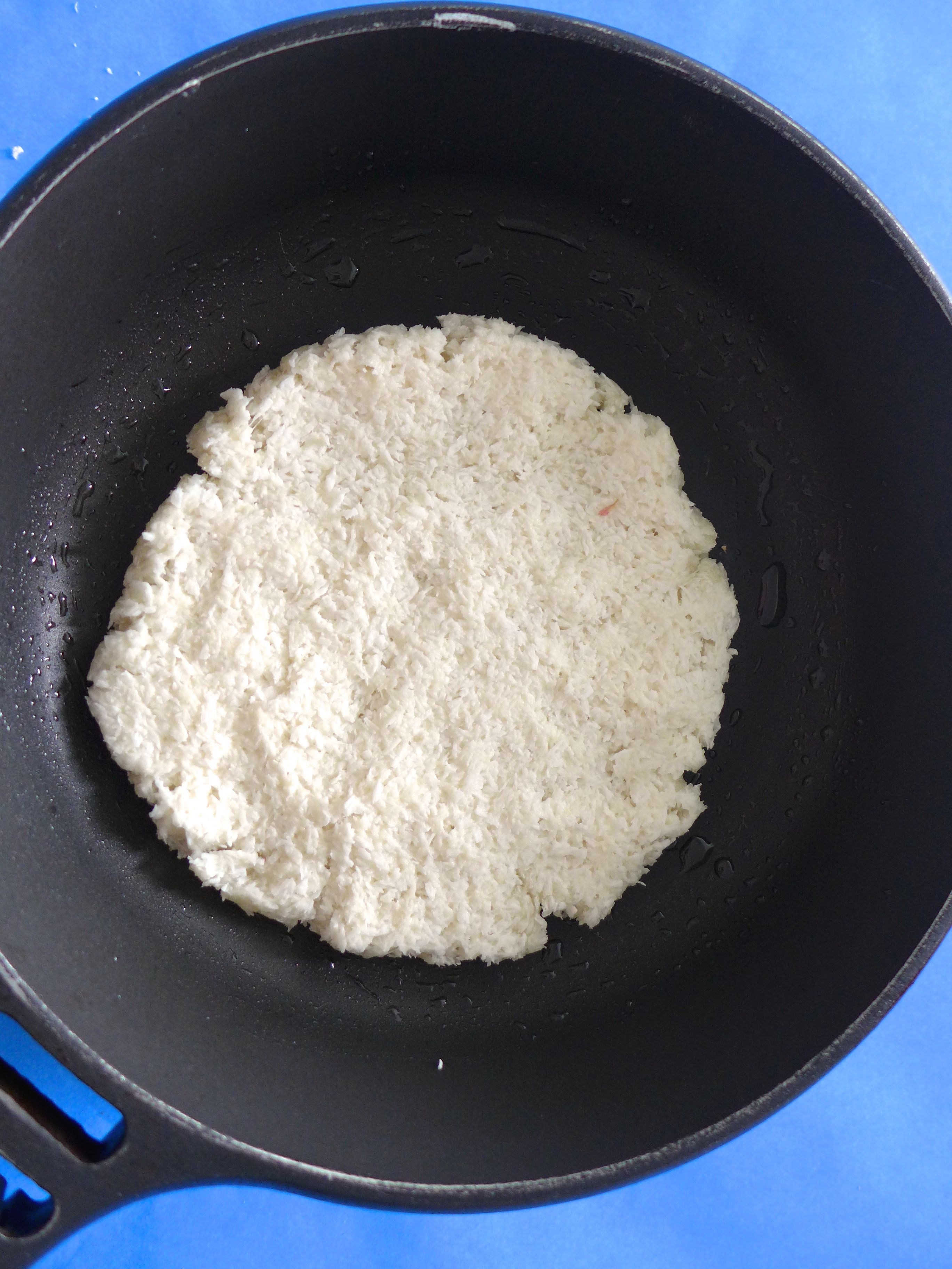 Engraso una sartén y la pongo al fuego. Doy forma a la tortita y la cocino en la sartén a fuego medio-bajo durante 3 ó 4 minutos por cada lado.