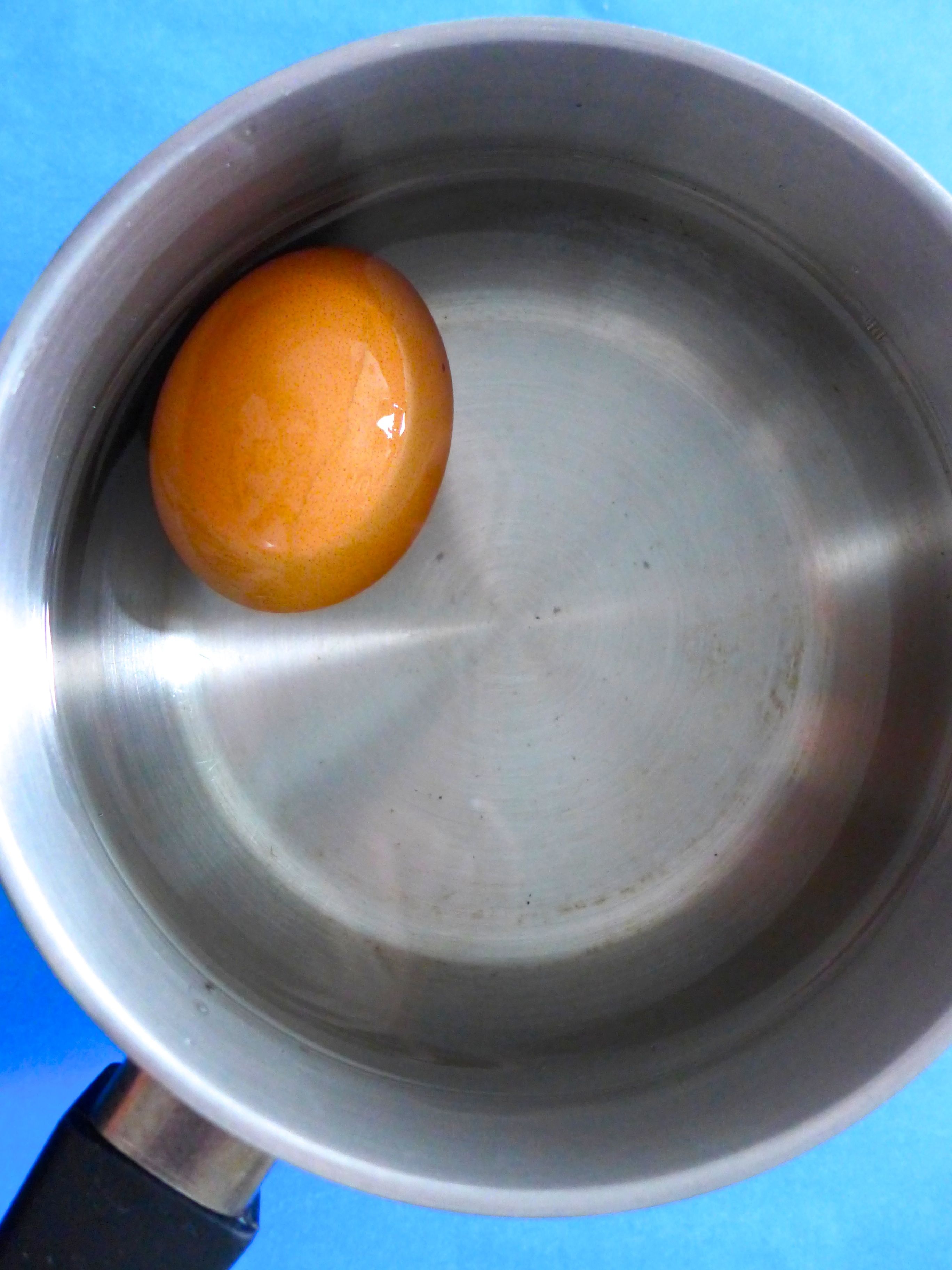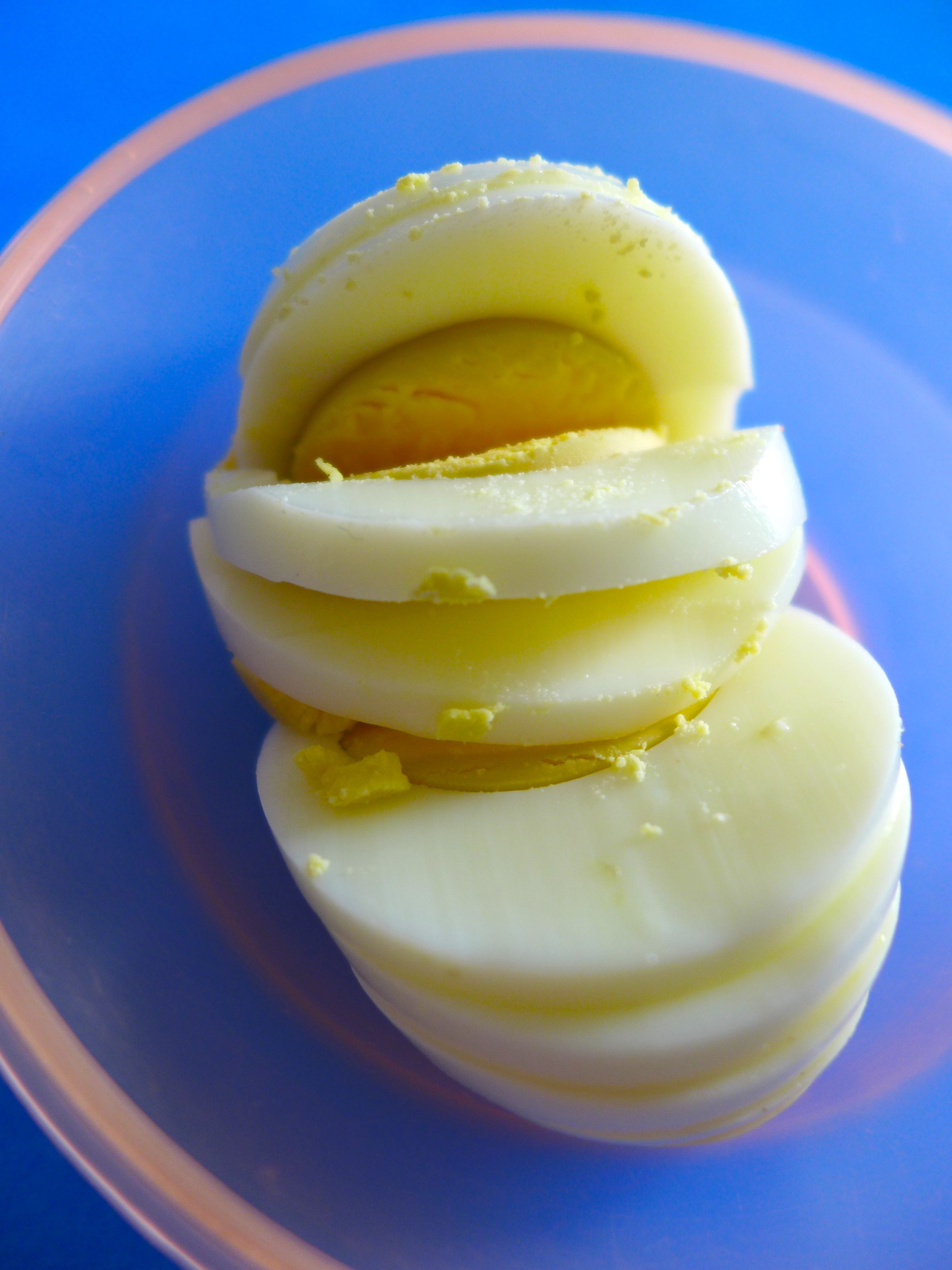 Igualmente, pongo al fuego el huevo en agua fría con sal y cuento 10 minutos desde que el agua rompa a hervir. Lo quito del agua y lo dejo enfriar. Luego lo parto en láminas.