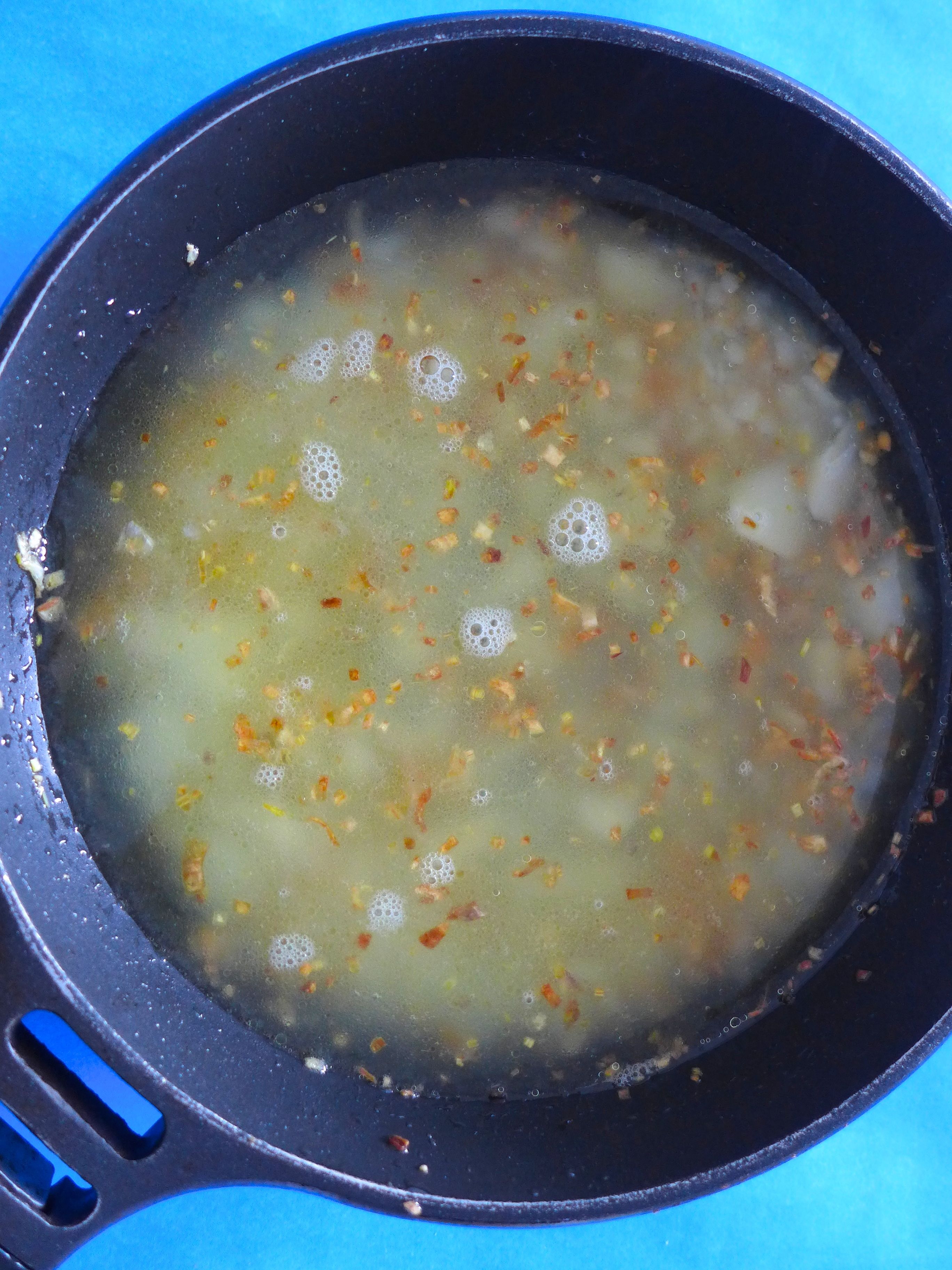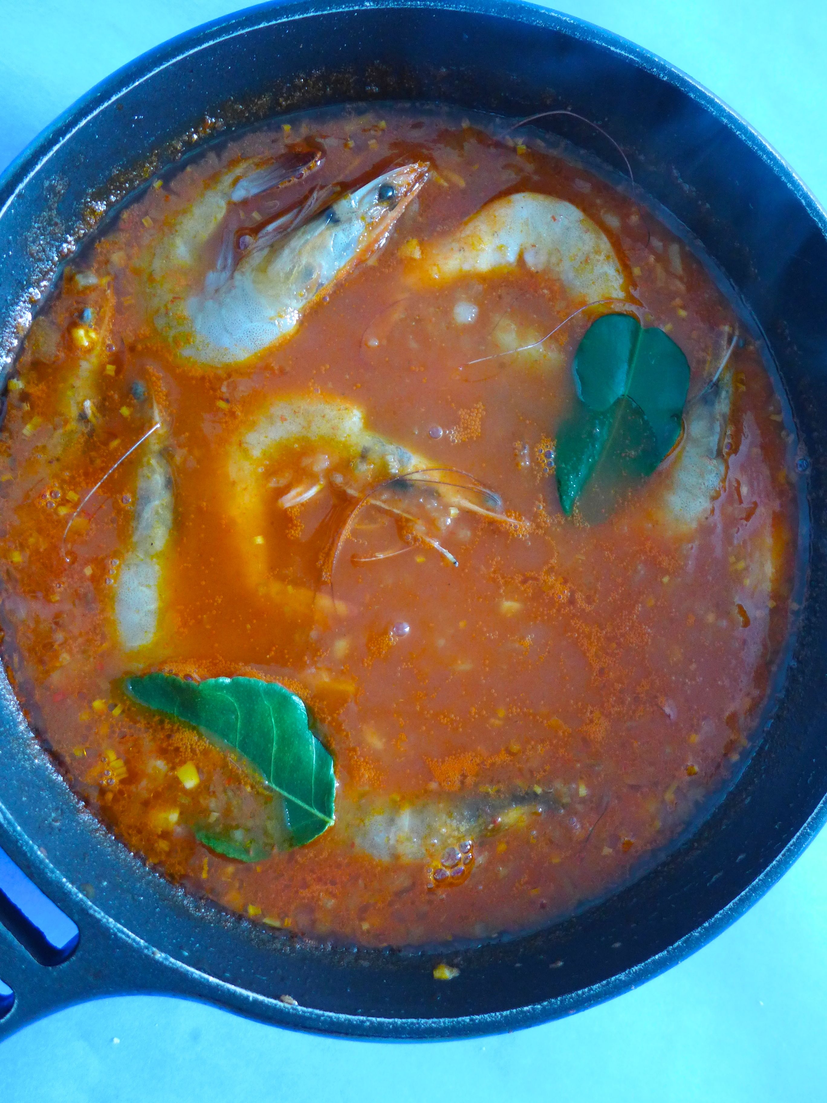 Remuevo y lo dejo cocer unos 5 minutos. Luego añado los langostinos y las hojas de limón. Lo dejo cocer otros 5 minutos.