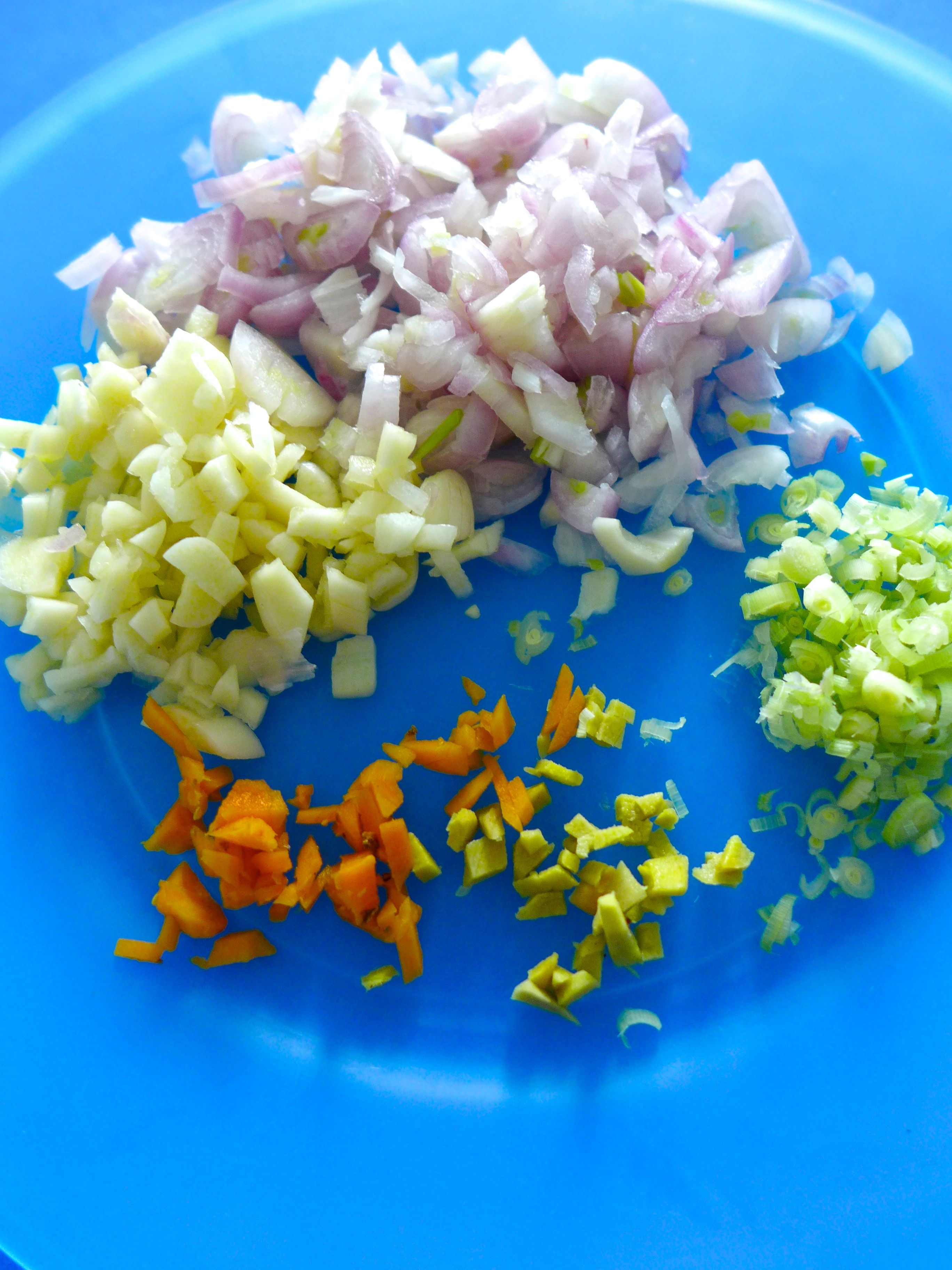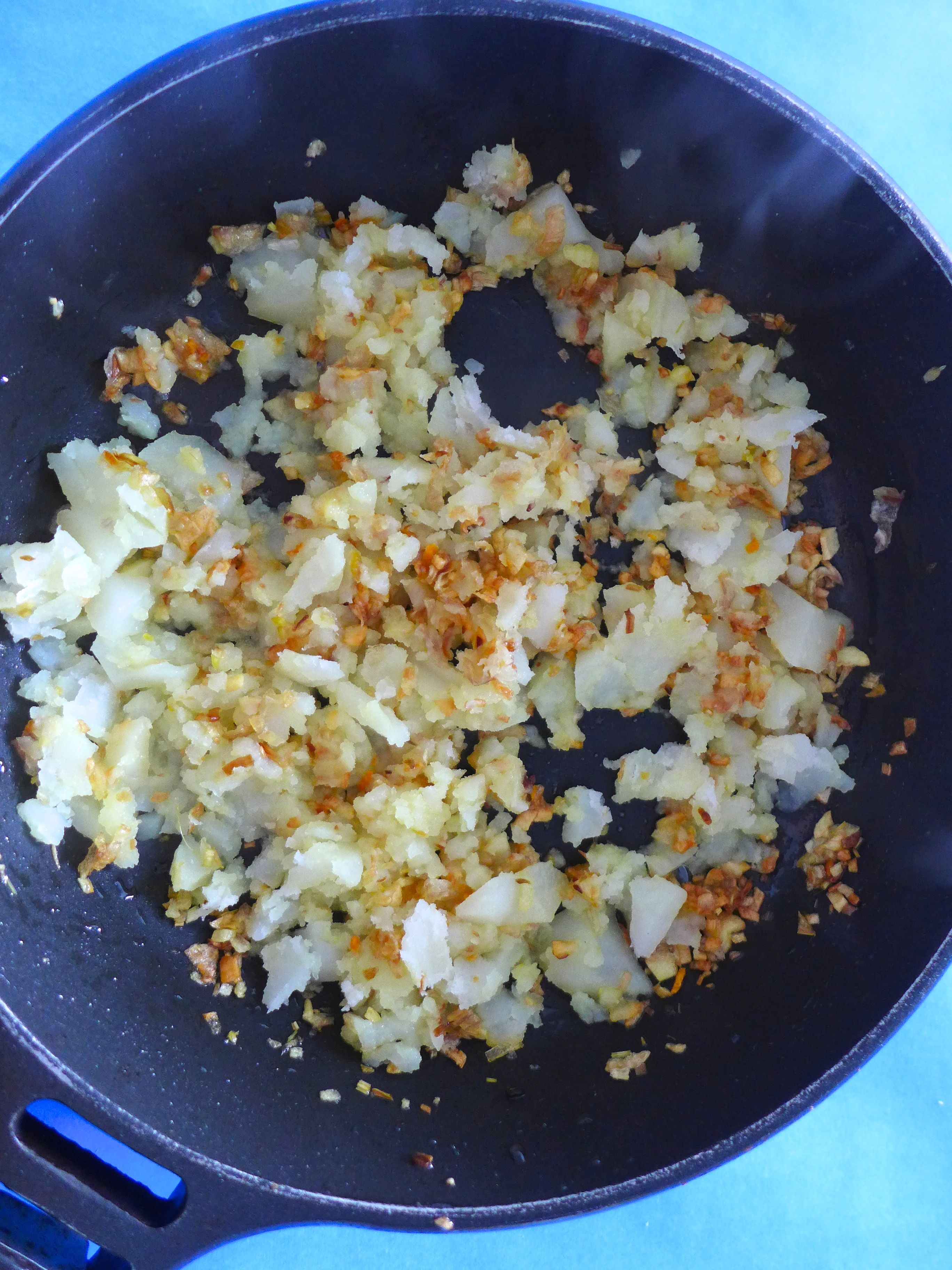 Pico el jengibre, la cúrcuma, la hierbalimón, el ajo y los chalotes, y los rehogo en una cazuela con aceite a fuego medio. Entonces, añado la patata hervida y la aplasto.