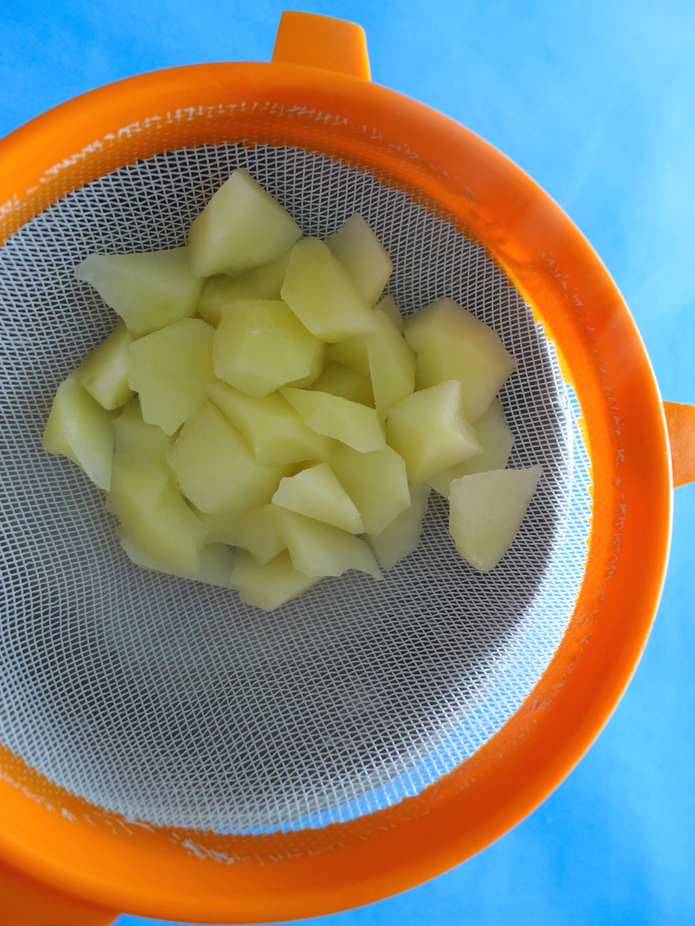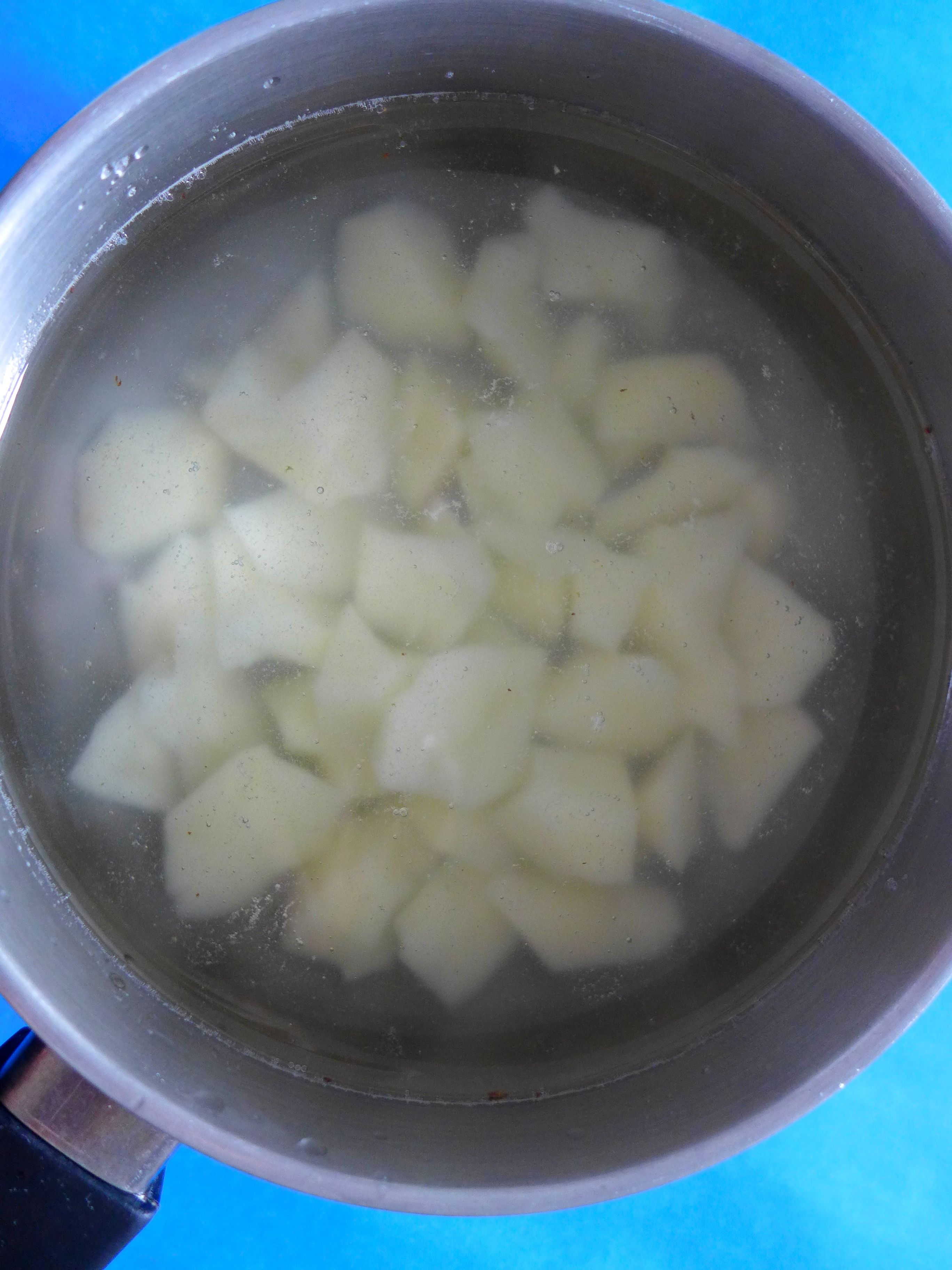 Pelo y troceo la patata, y la echo en una cazuela llena de agua fría con sal. La pongo al fuego y la dejo cociendo hasta que se ablande. La escurro y espero a que se enfríe.
