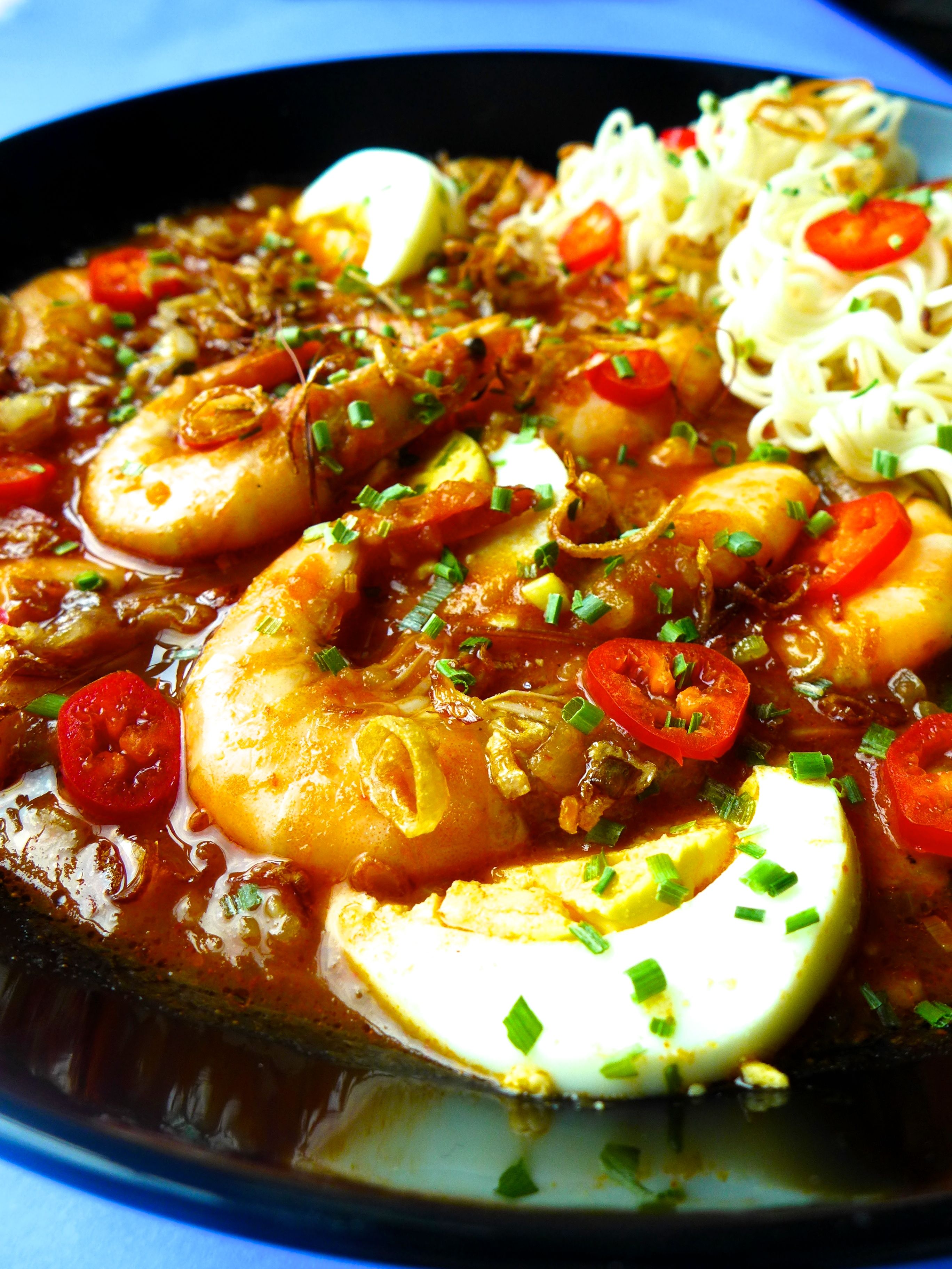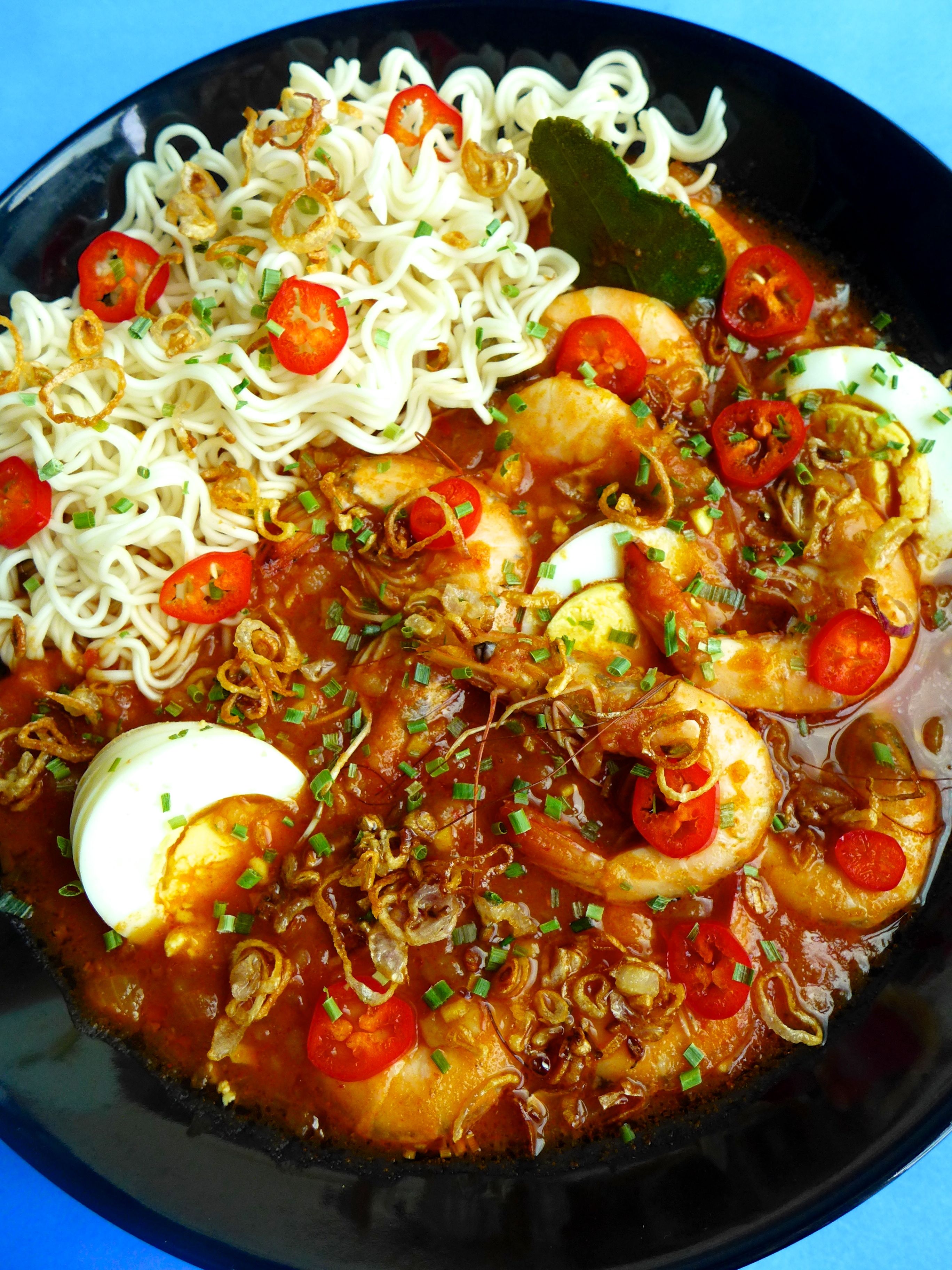 En el plato, coloco los langostinos con un poco de sopa, noodles, huevo duro, chalotes dorados, chile rojo y cebollino picado.