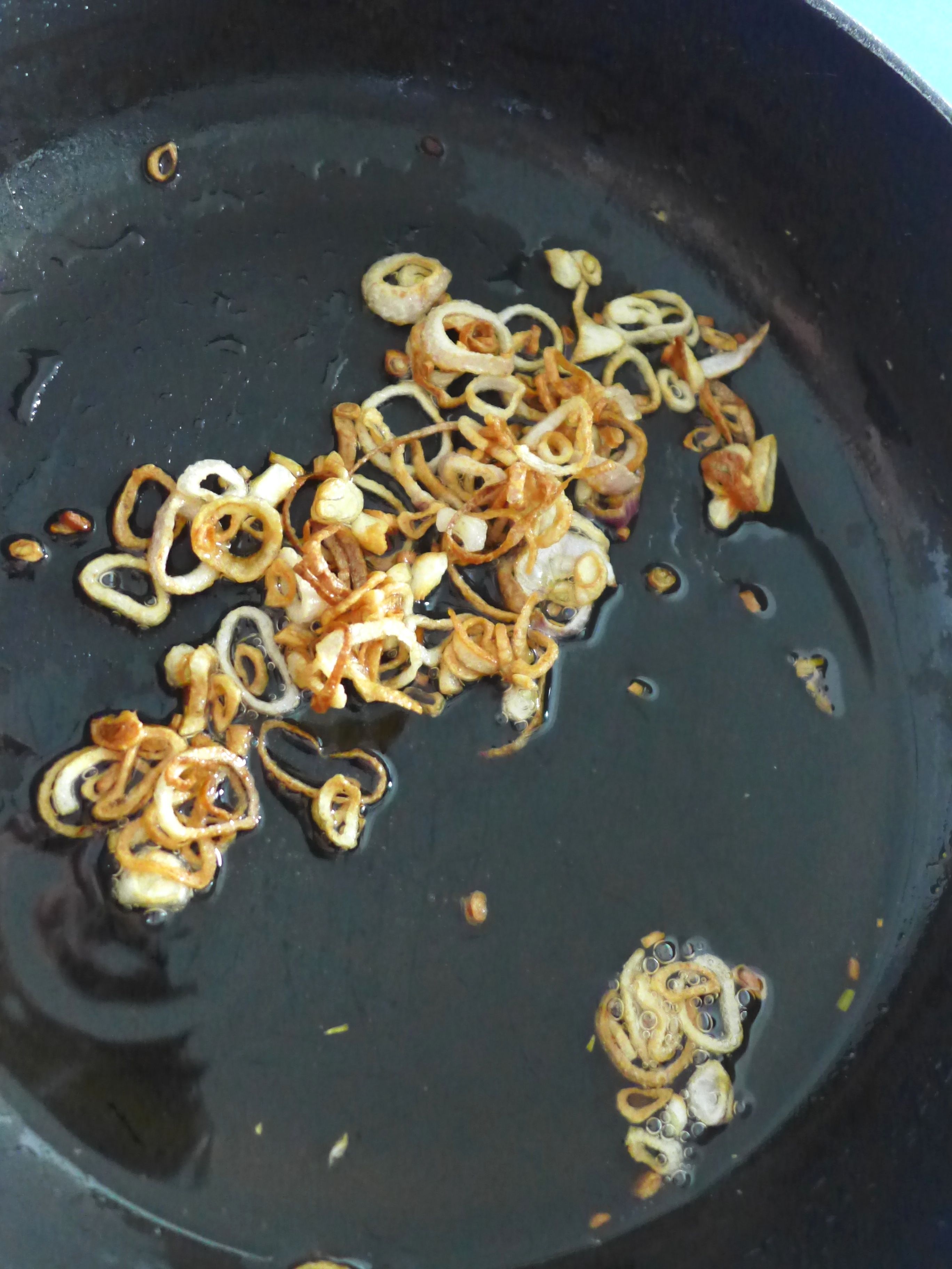 Mientras, lamino y rehogo 3 chalotes. Cuando están dorados, los escurro y reservo.