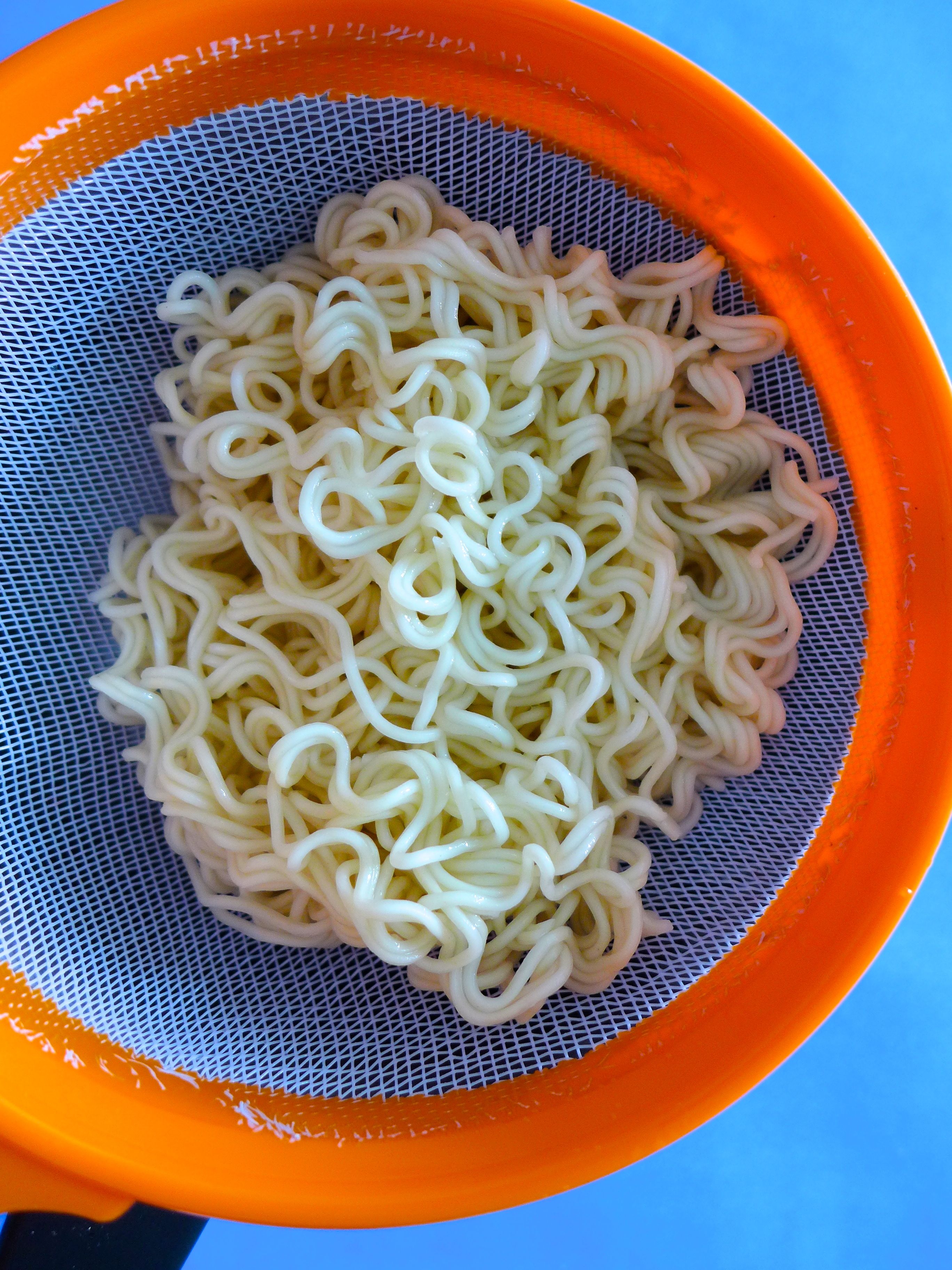 Caliento agua en un cazo. Cuando rompa a hervir, apago el fuego y echo los noodles. Dejo que repose un par de minutos y remuevo para que se suelten. Los escurro y reservo.
