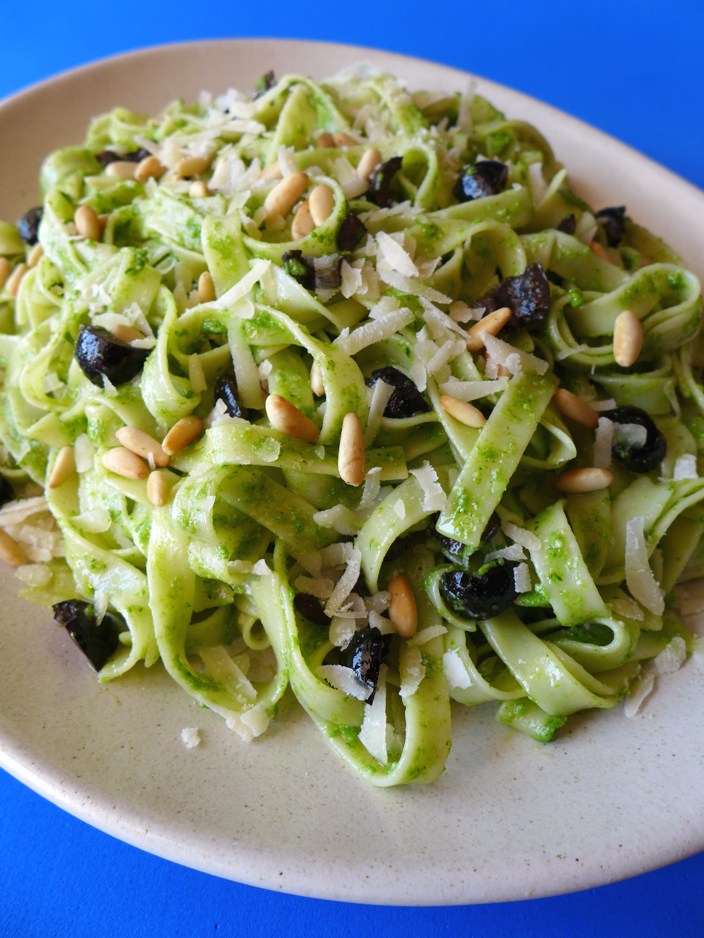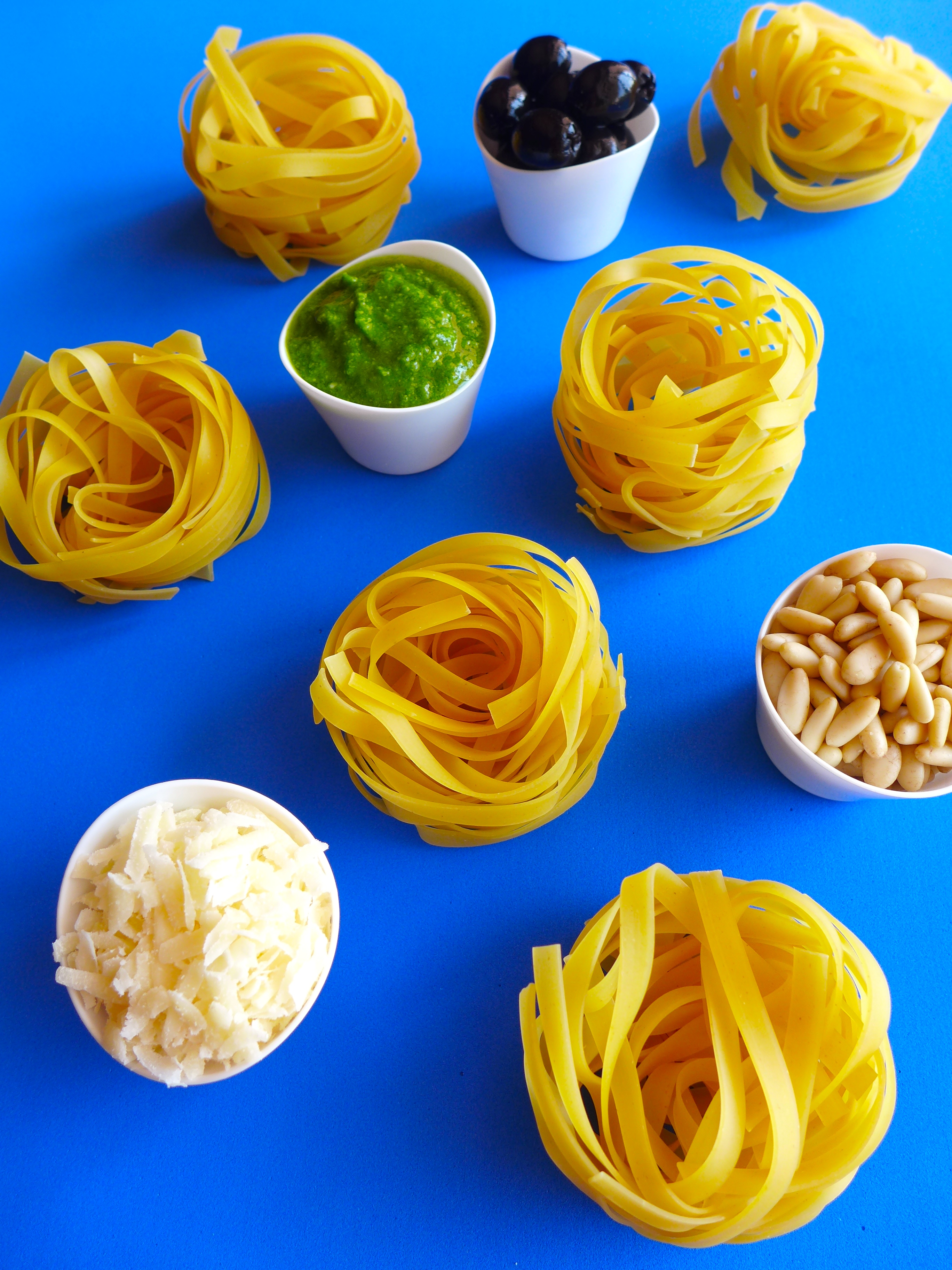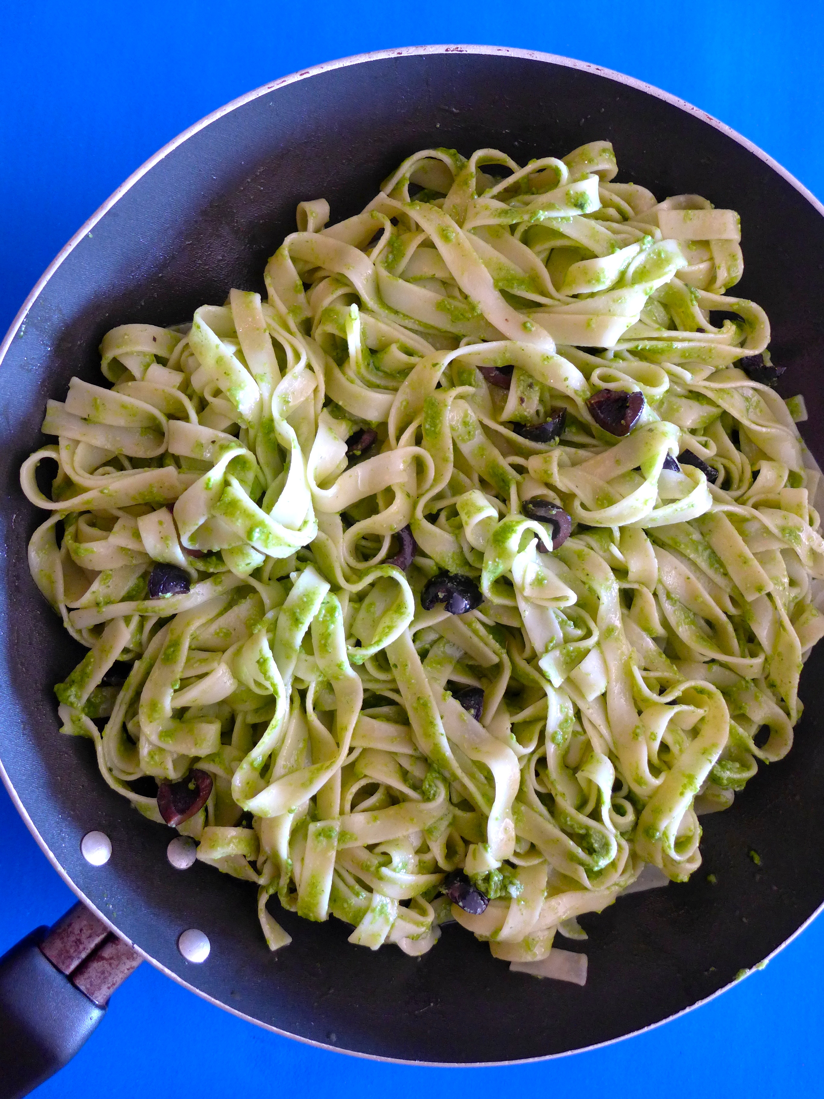 Tuesto los piñones en una sartén. Cuando están tostados, añado la pasta y la salsa pesto.