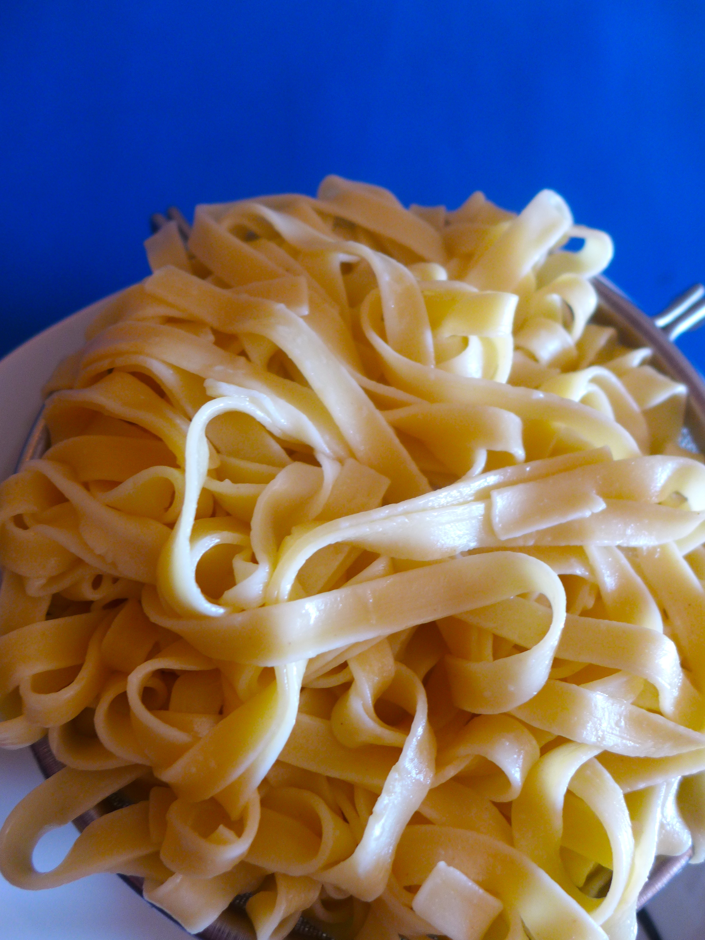 Pongo una cazuela con abundante agua a fuego alto y echo un poco de sal. Una vez rompe a hervir, añado la pasta y remuevo para evitar que se pegue. Cuando está hecha, la dejo escurrir y le añado unas gotas de aceite de oliva. Remuevo.