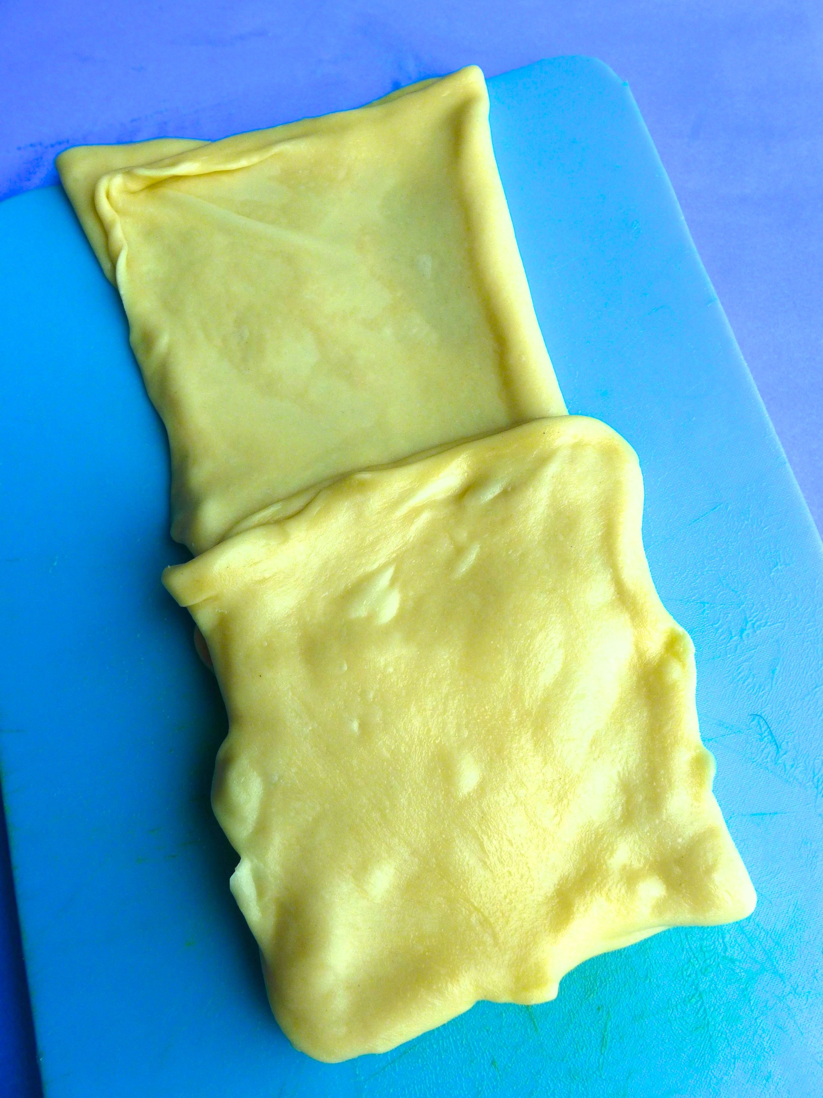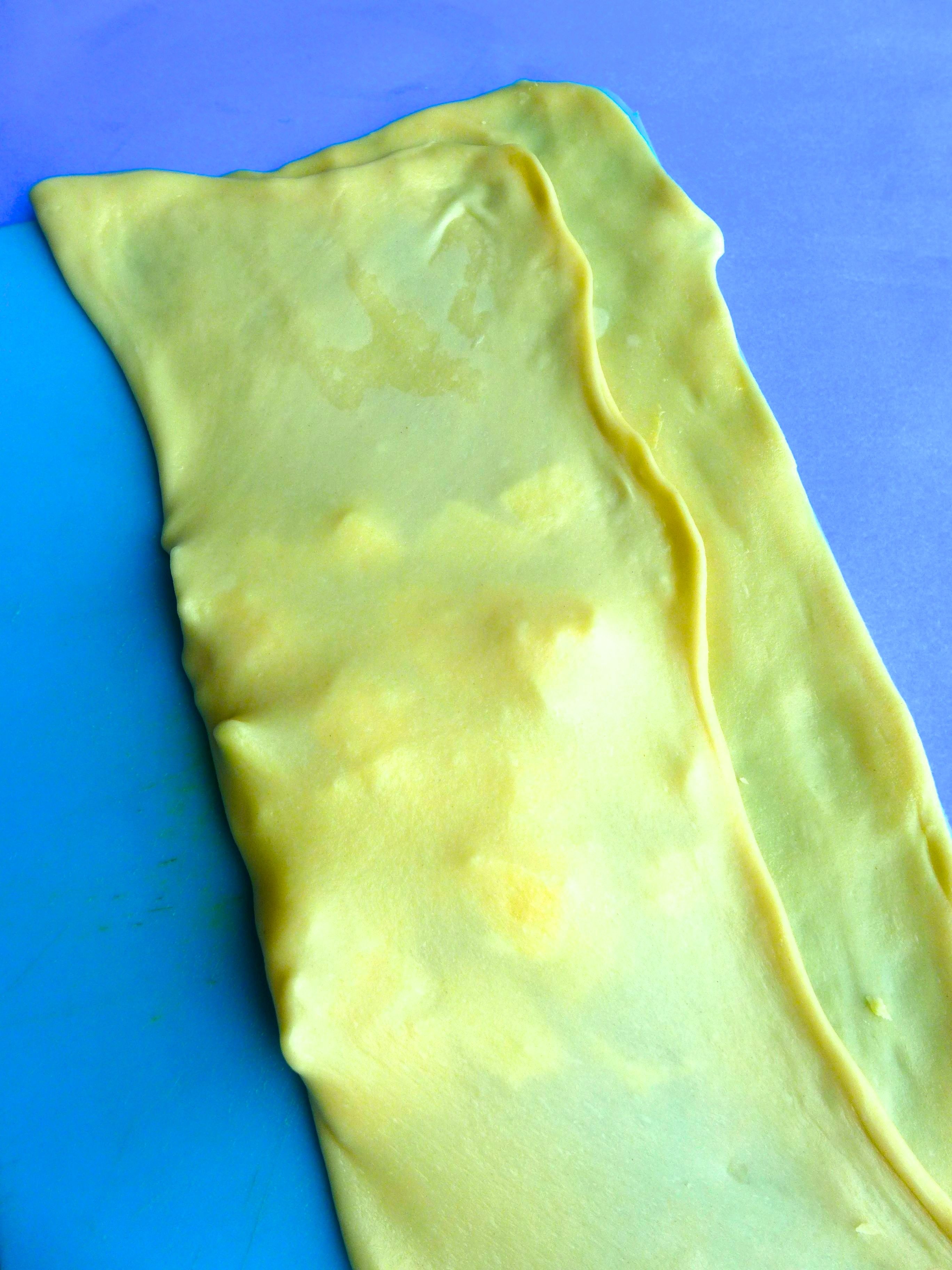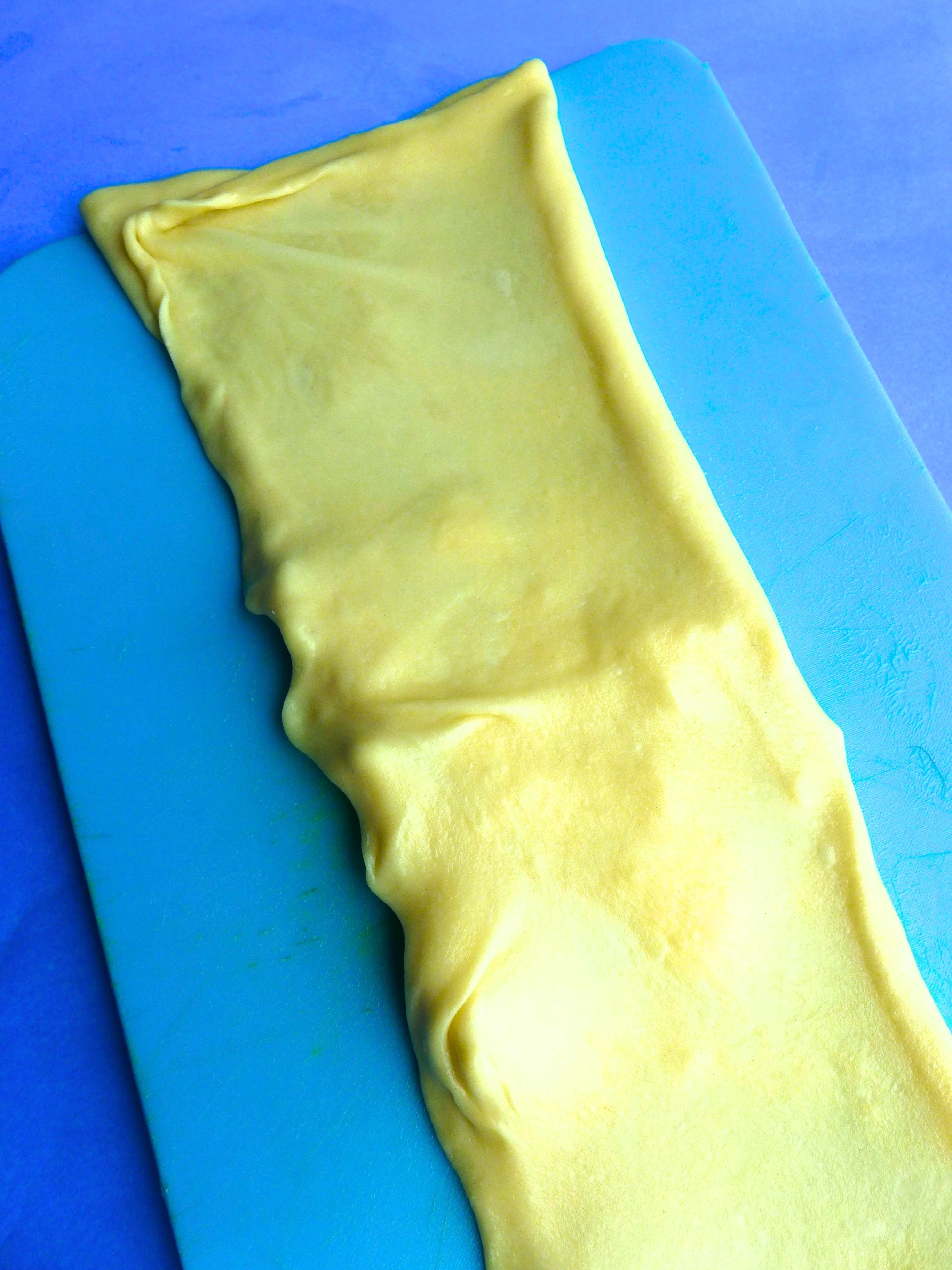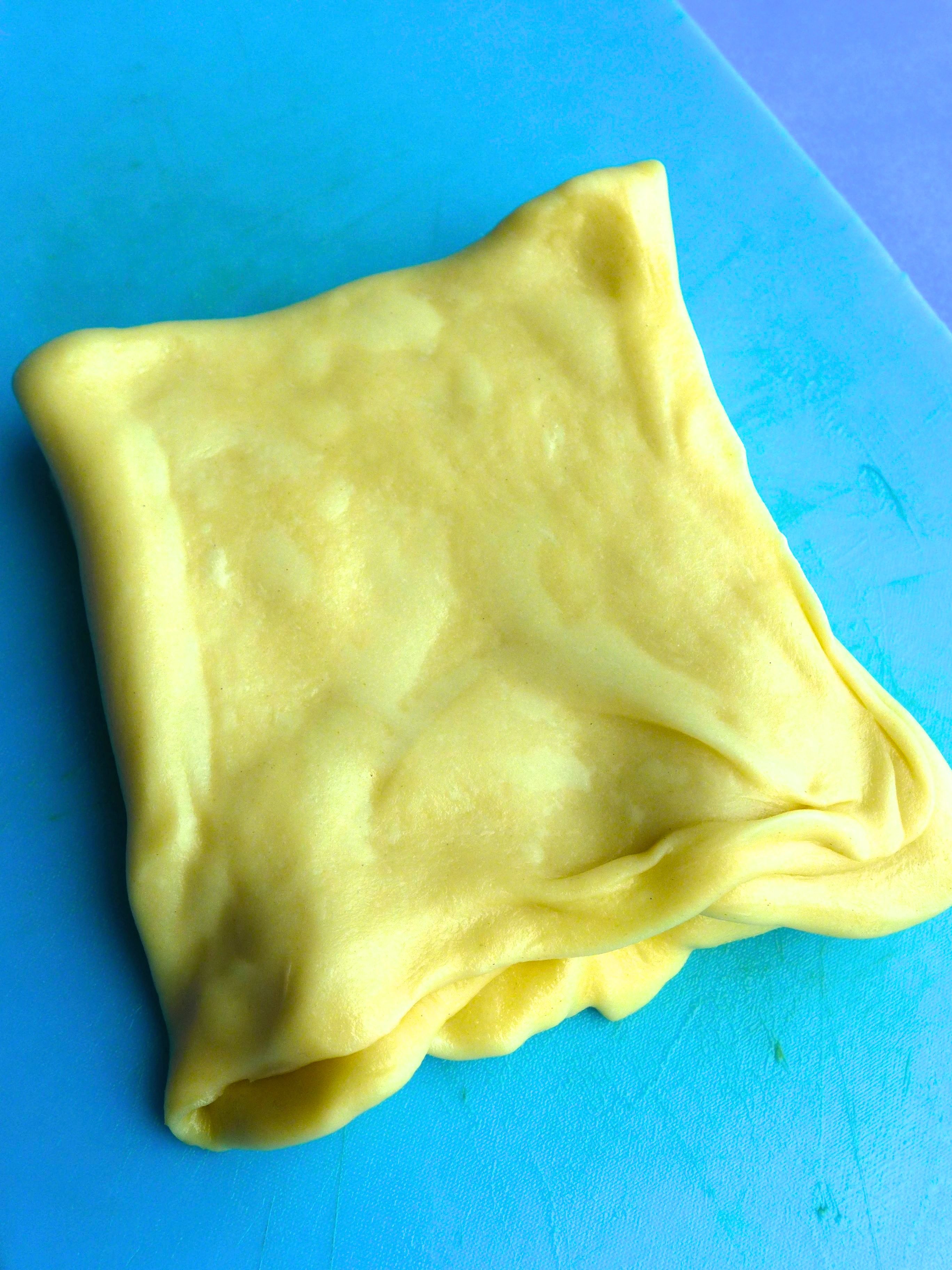 Doblo uno de los lados más largos hacia el centro, hasta tapar el queso. Doblo el otro lado por encima. Luego, doble el tercio inferior hacia el centro y, por último, el tercio superior por encima. Aplano ligeramente el roti.