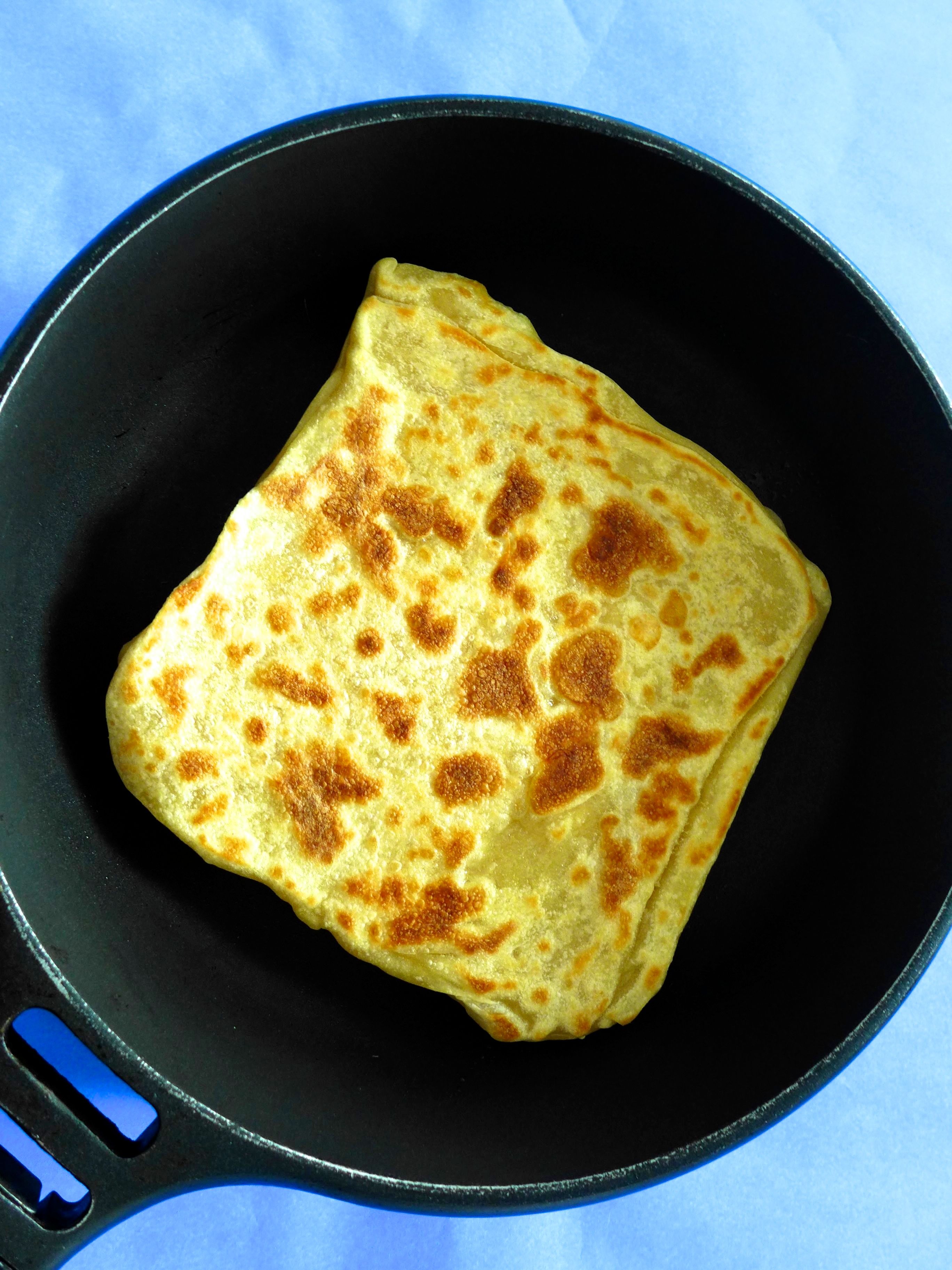 Engraso ligeramente una plancha y cocino el roti a fuego medio-bajo durante 5 minutos. Le doy la vuelta y lo cocino unos 5 minutos más por el otro lado hasta que el roti queda crujiente y de un color dorado.