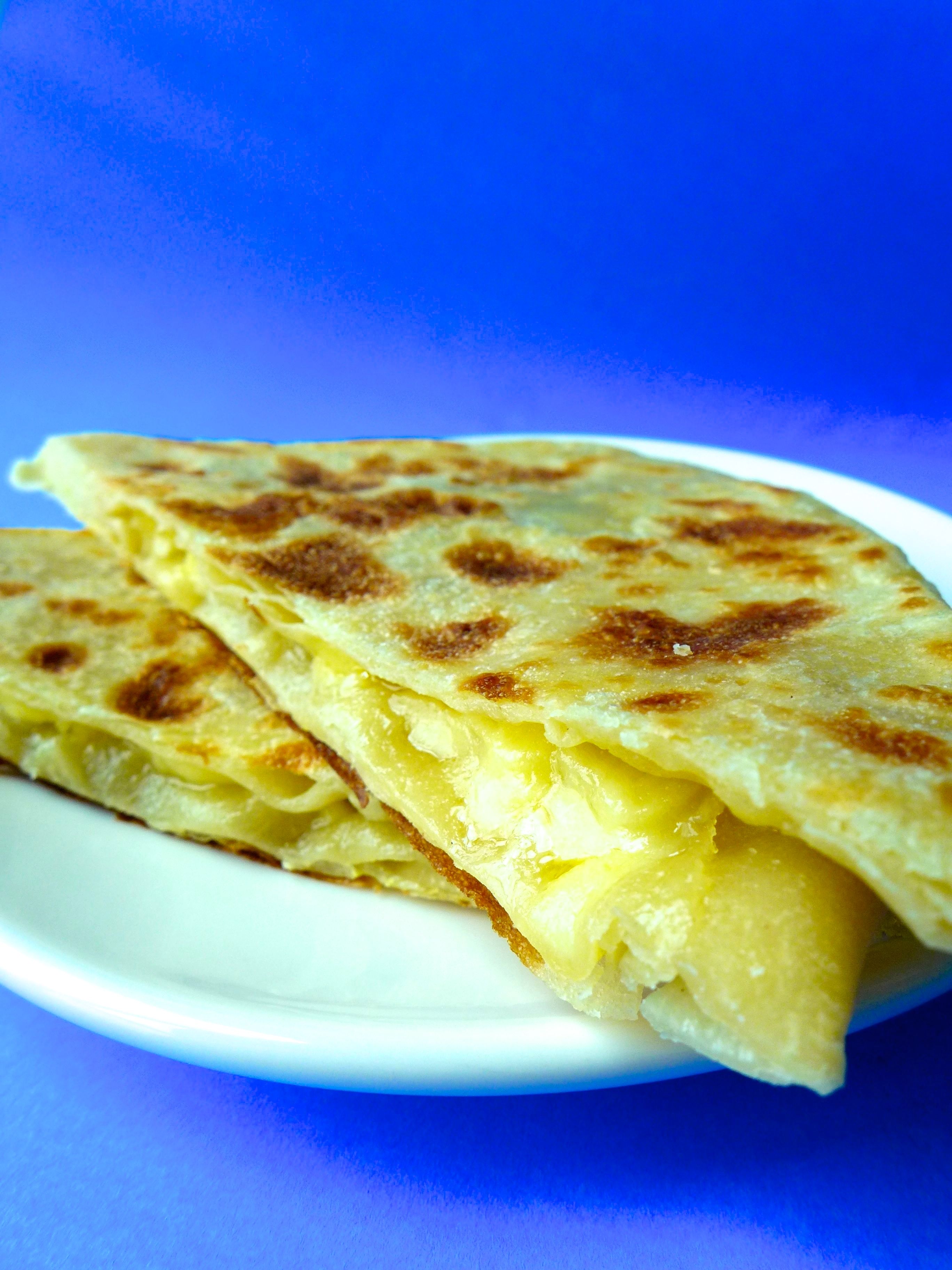 Una a una, las estiro hasta convertirlas en láminas rectangulares y casi transparentes. Troceo el queso y pongo unos 80 gr en el centro del roti.