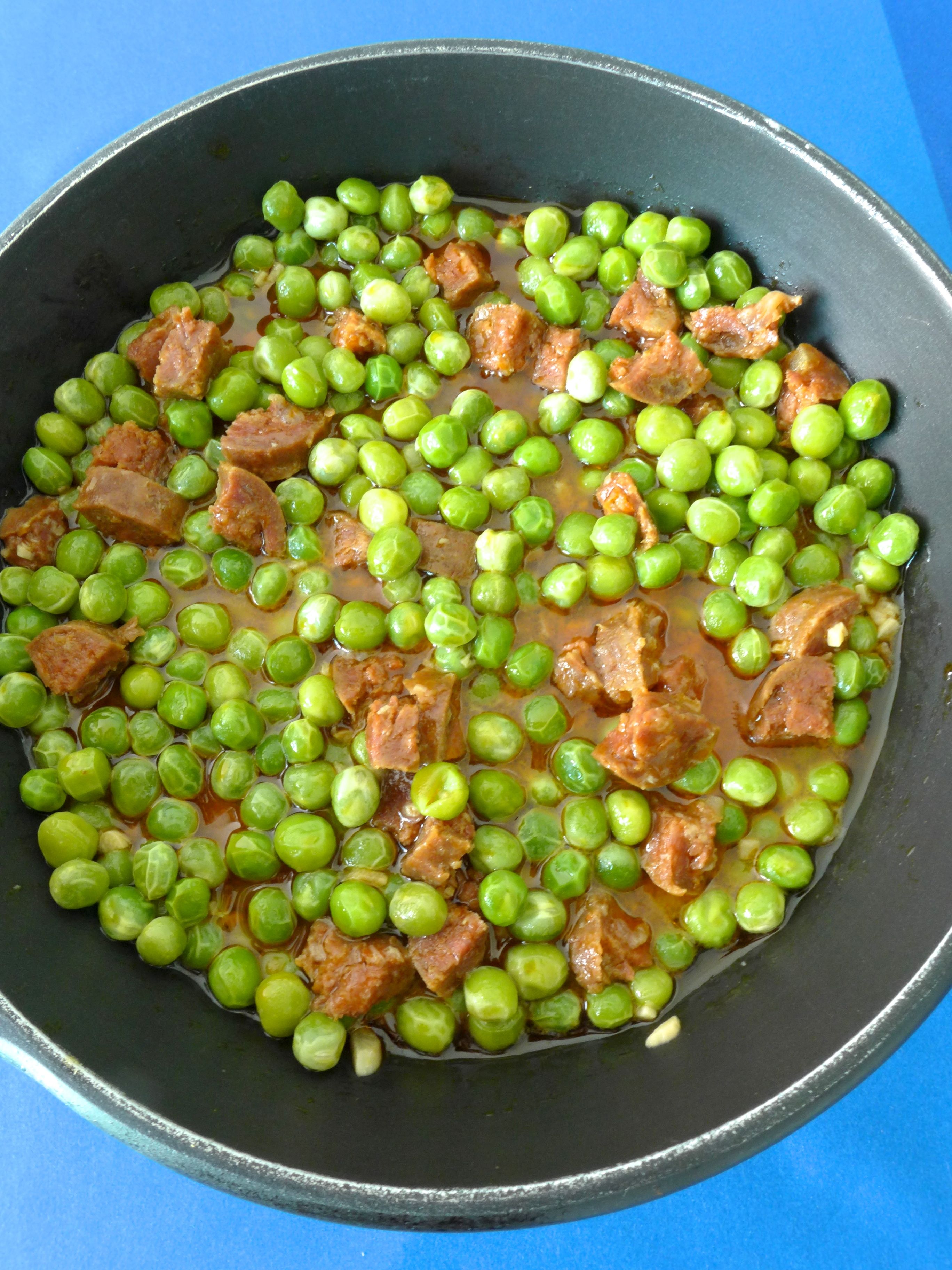 Pongo a hervir agua con sal. Cuando rompe a hervir, echo los guisantes y los dejo cocer a fuego medio-bajo hasta que se ablandan (una media hora).