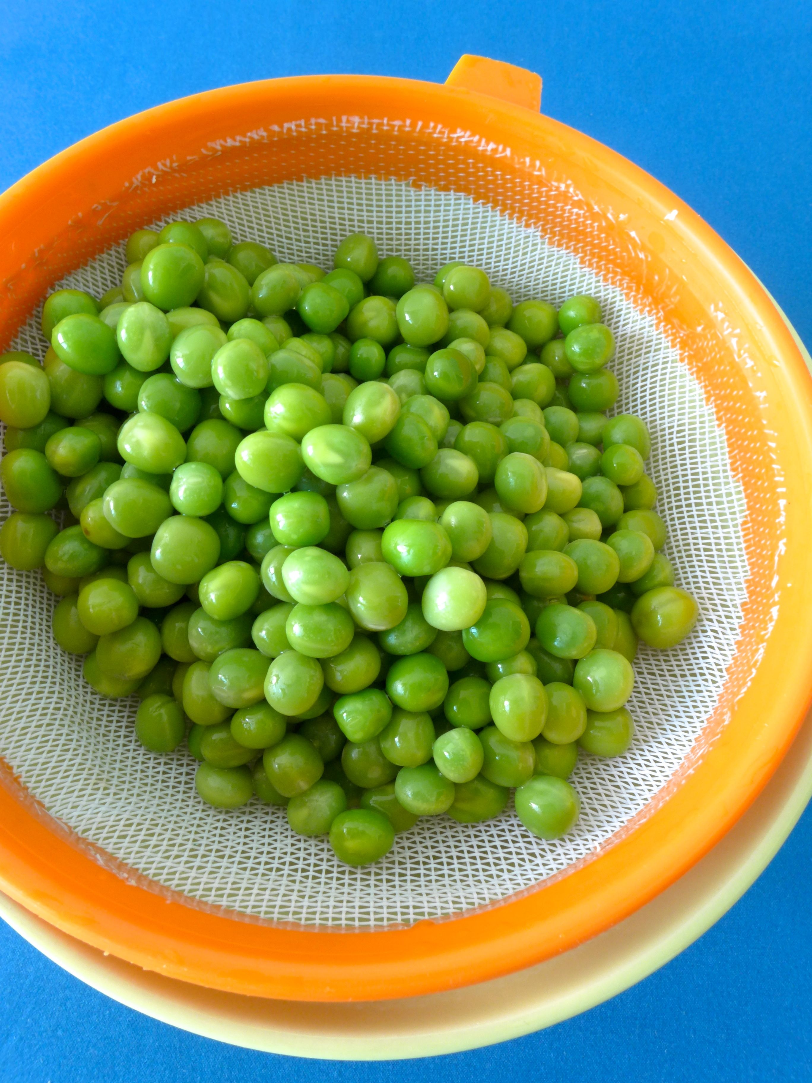 Cuando los guisantes están blandos, los escurro (reservando el agua de la cocción) y los pongo inmediatamente en agua fría para que no pierdan color.