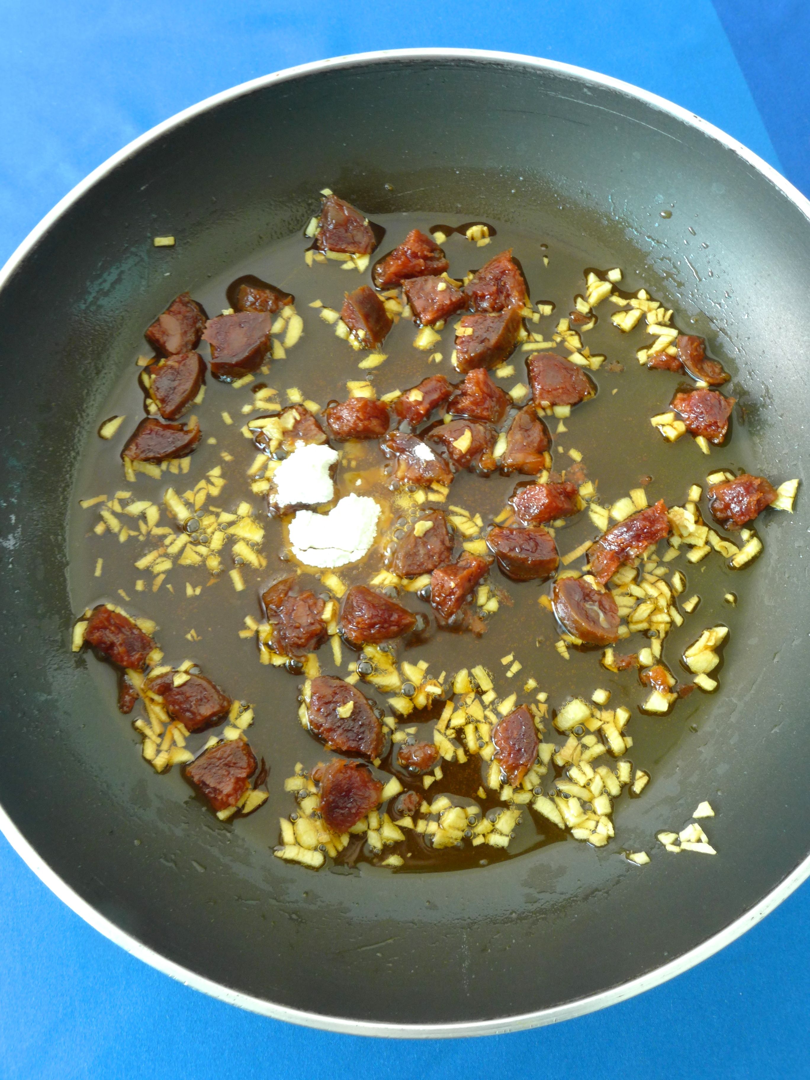 Rehogo el ajo y, cuando empieza a dorarse, añado el chorizo. Remuevo unos minutos y añado la harina, le doy vueltas durante un par de minutos más y echo un poco del agua de cocción de los guisantes (como medio vaso).