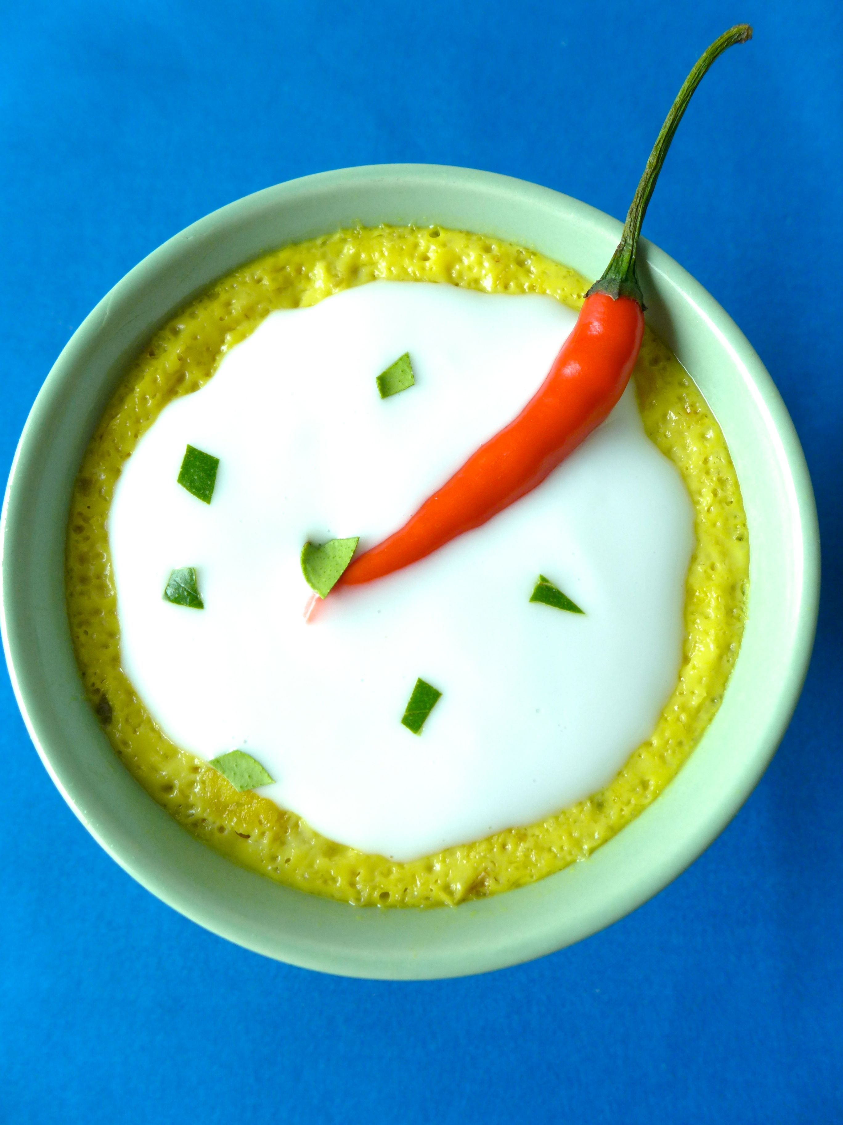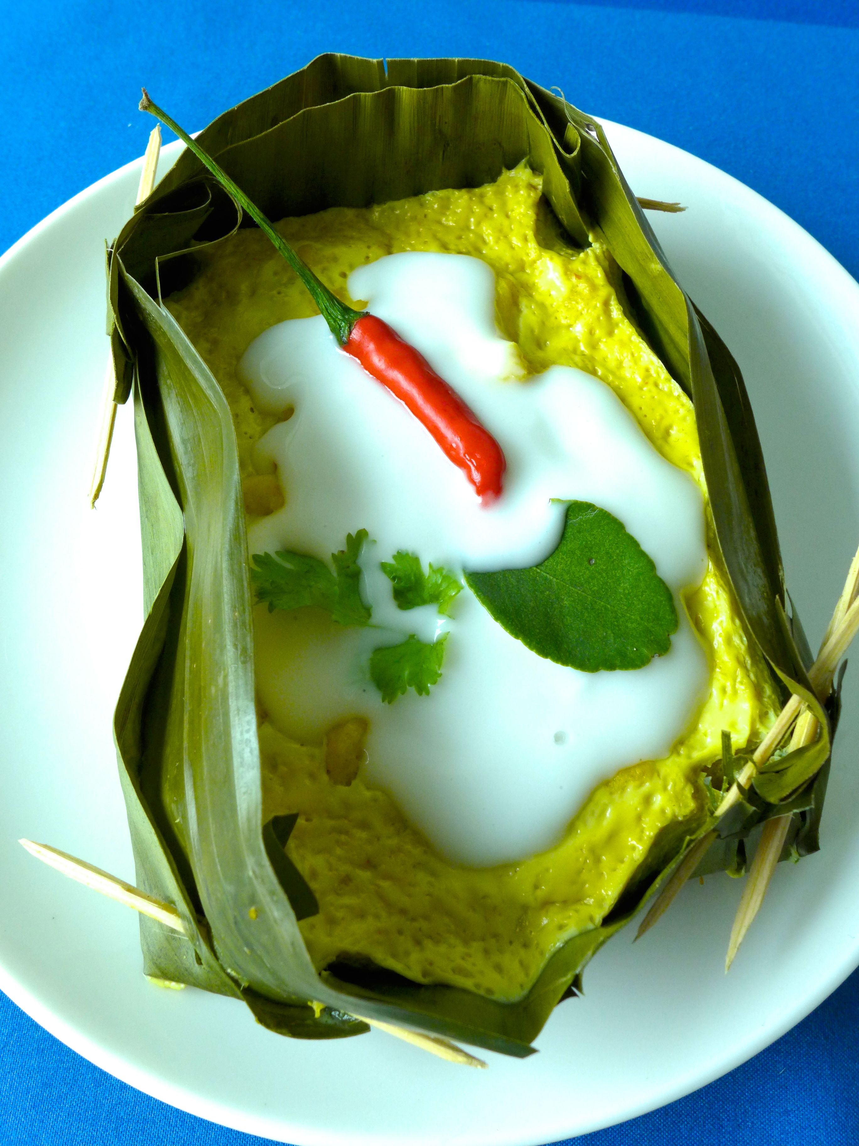 Decoro el amok con la crema de coco, una hoja de lima, un chili rojo y un poco de cilantro.