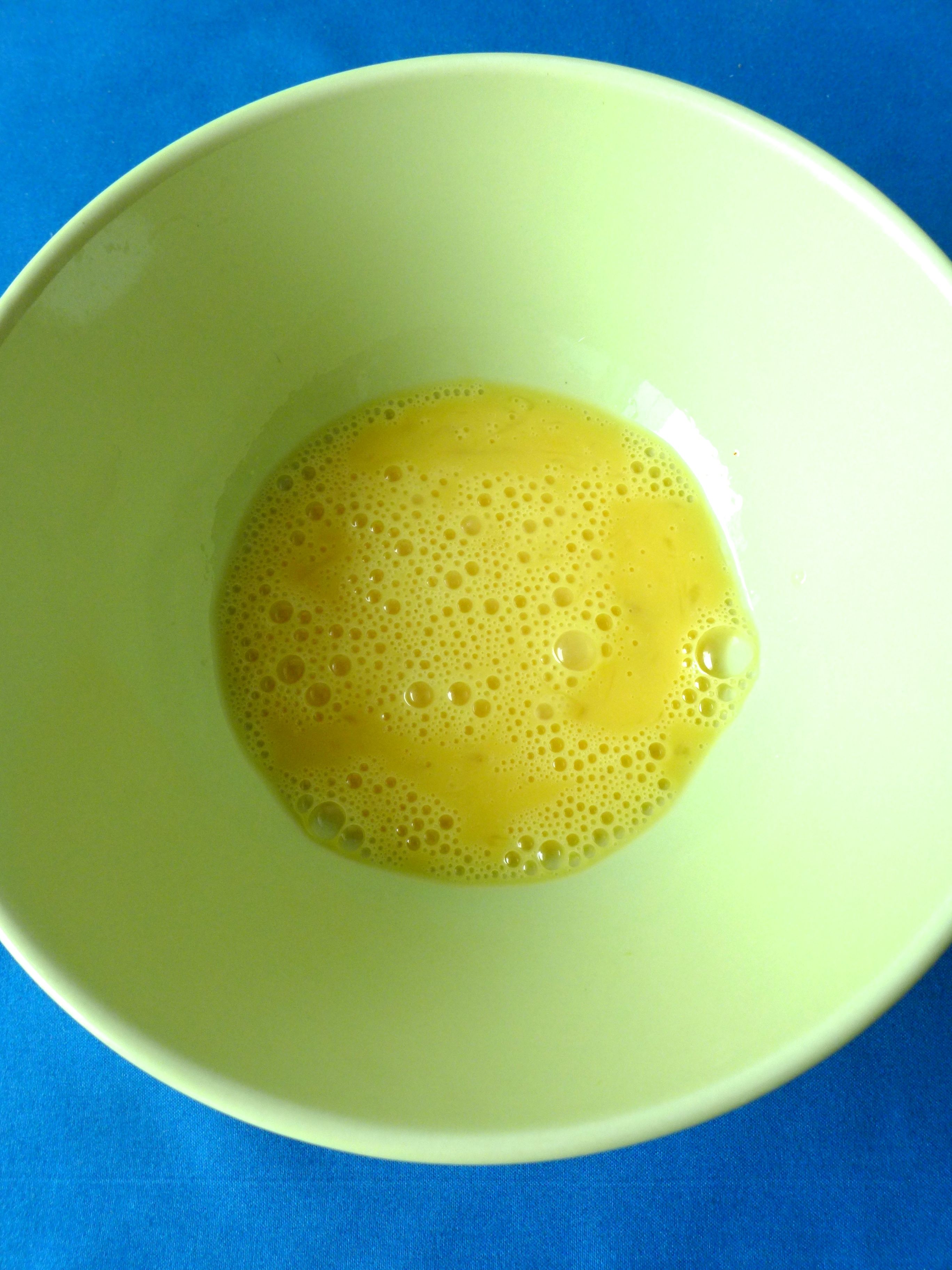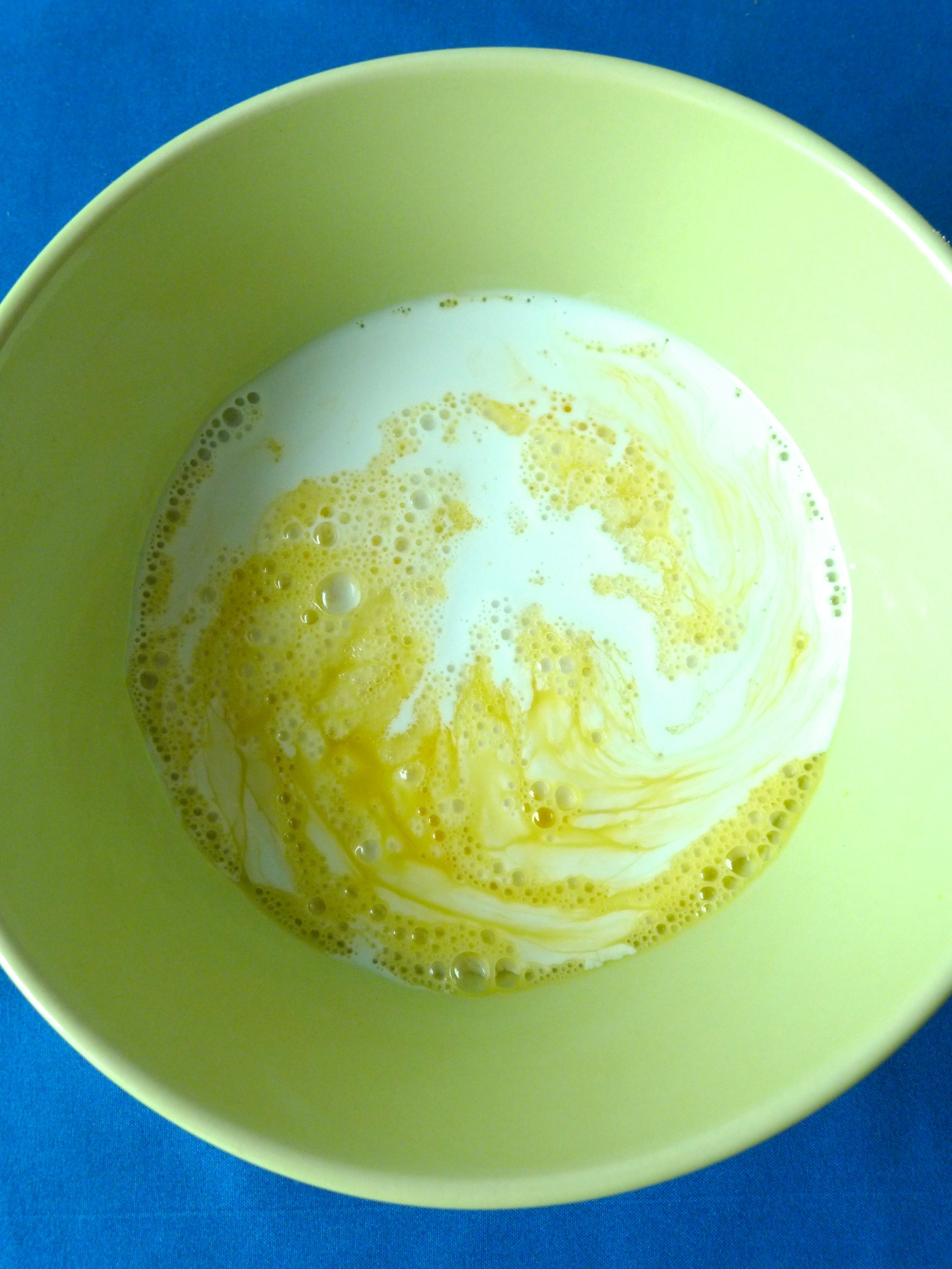 Bato los huevos y los mezclo con el resto de la crema de coco (200 ml), la salsa de pescado y el azúcar. Echo esta mezcla al pescado y remuevo.
