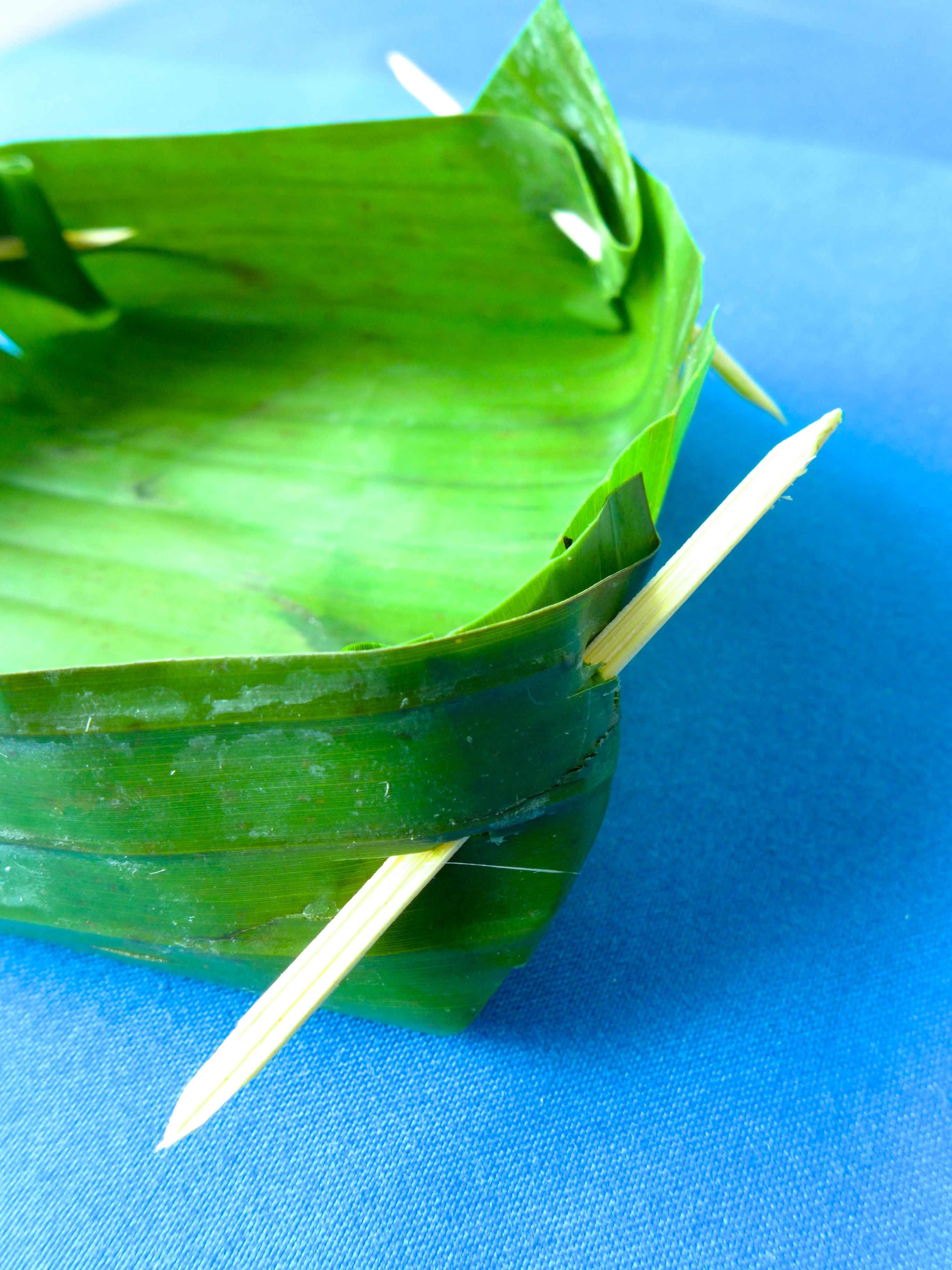 Mientras, formo las cajitas con las hojas de plátano. Primero, las escaldo para limpiarlas y ablandarlas. Luego, las uno las esquinas con palillos.