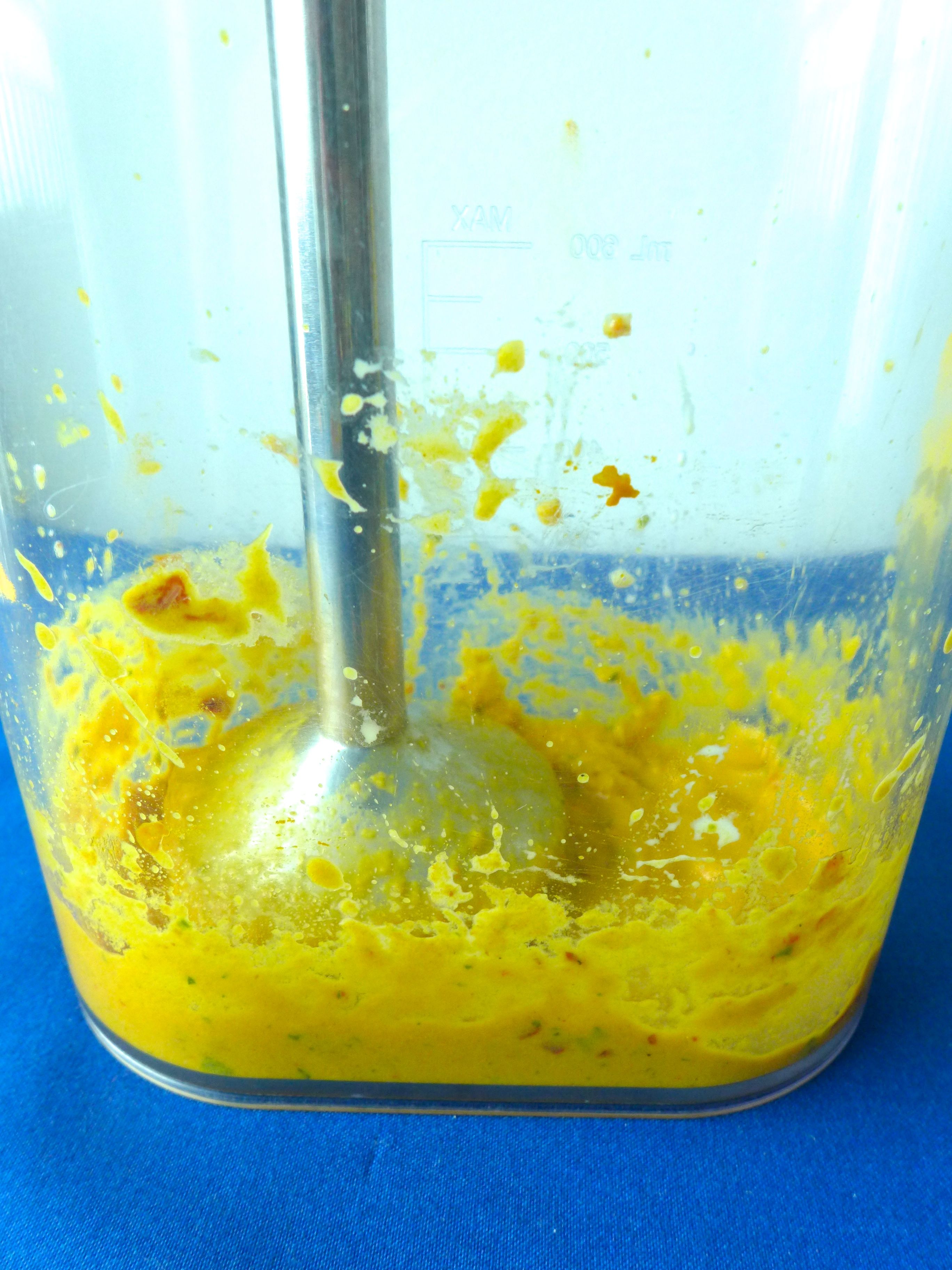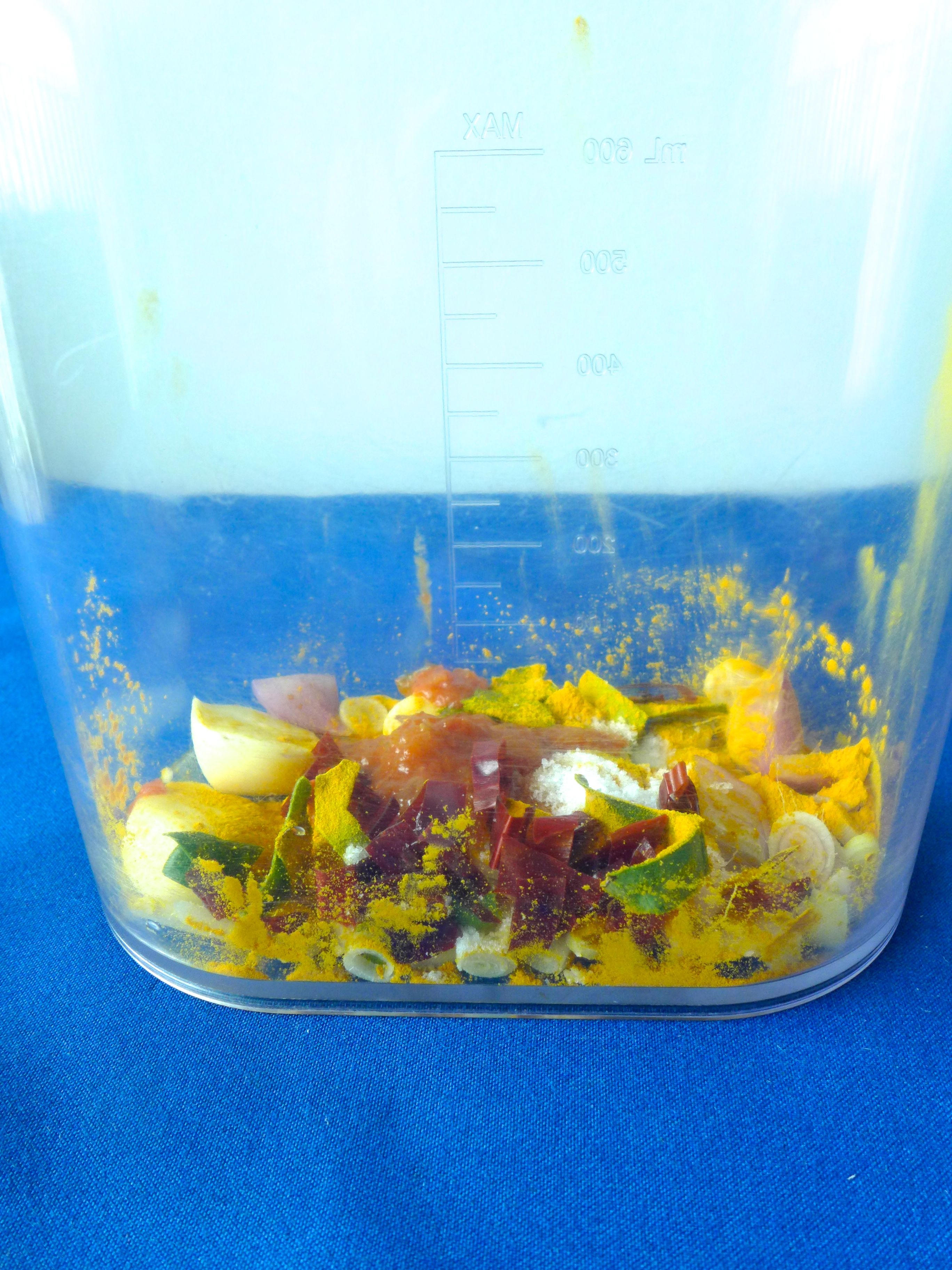 Preparo la pasta kroeung. Para ello, pico los ajos, los chalotes, la hierbalimón, las hojas de lima, la galanga y las guindillas. Añado la cúrcuma, la salsa picante, la sal y 50 ml de crema de coco, y lo bato.