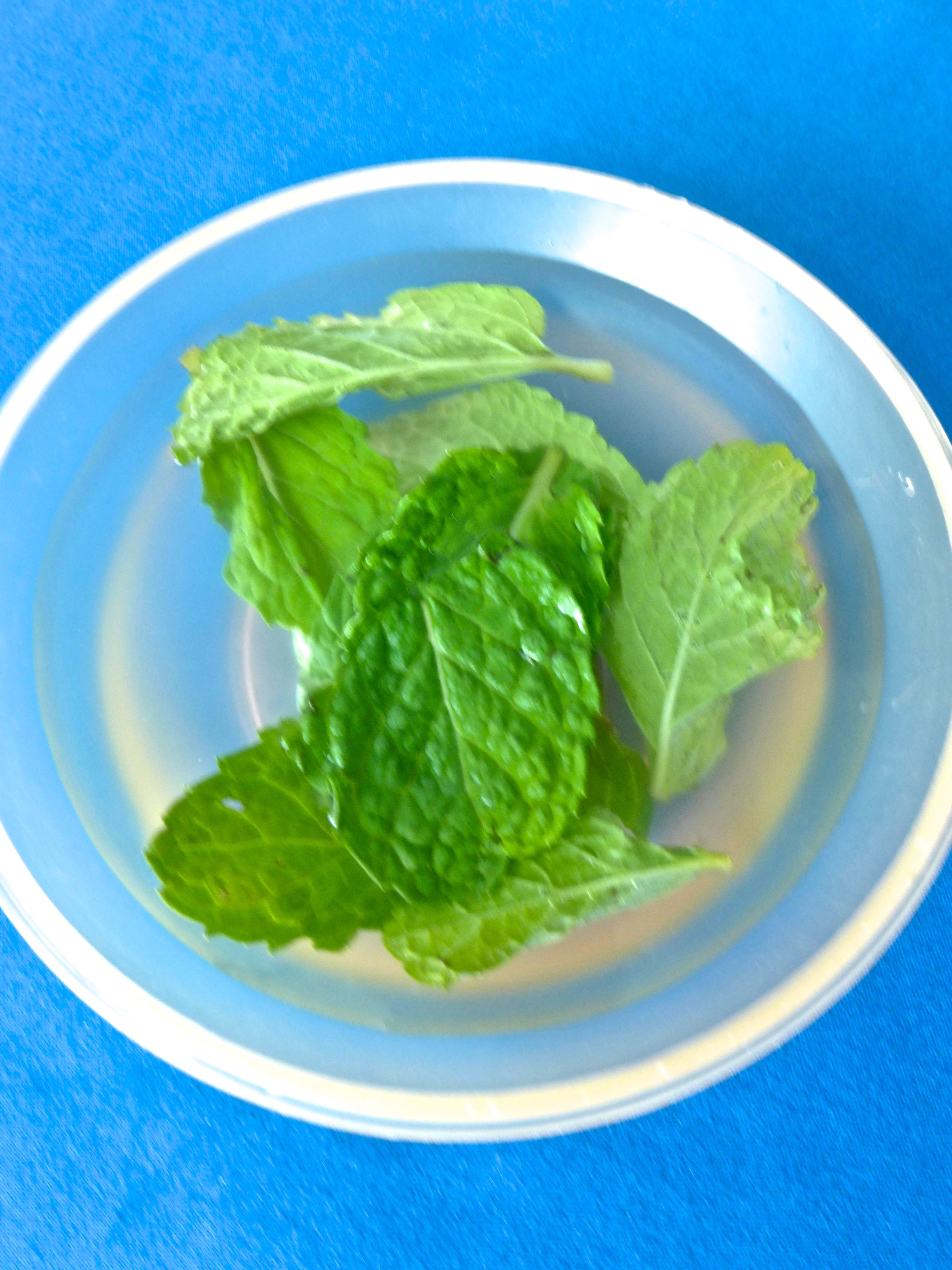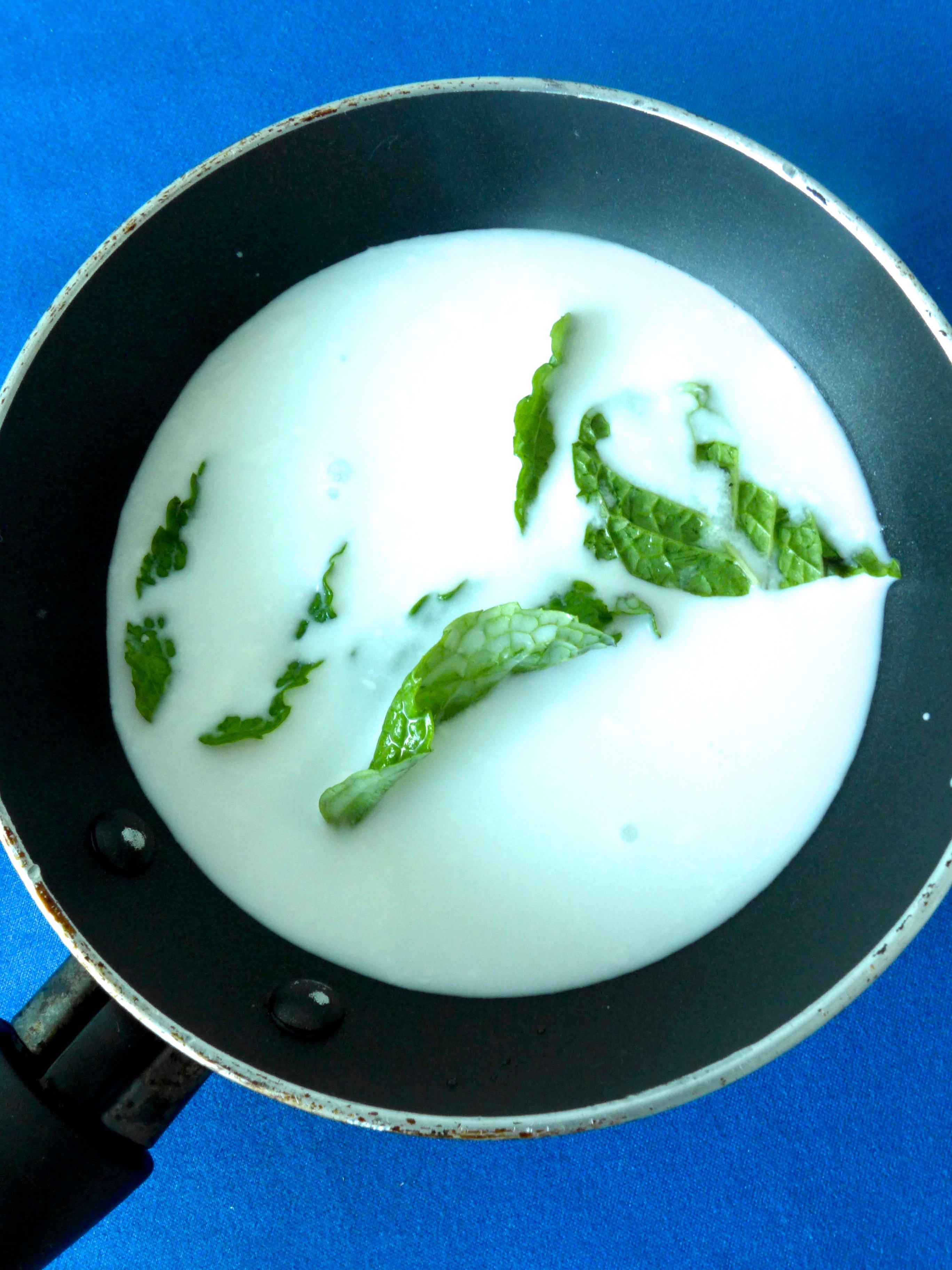Mientras, caliento la crema de coco con las hojas de menta, el azúcar blanca y la maicena a fuego bajo (para que la crema no hierva) y remuevo.