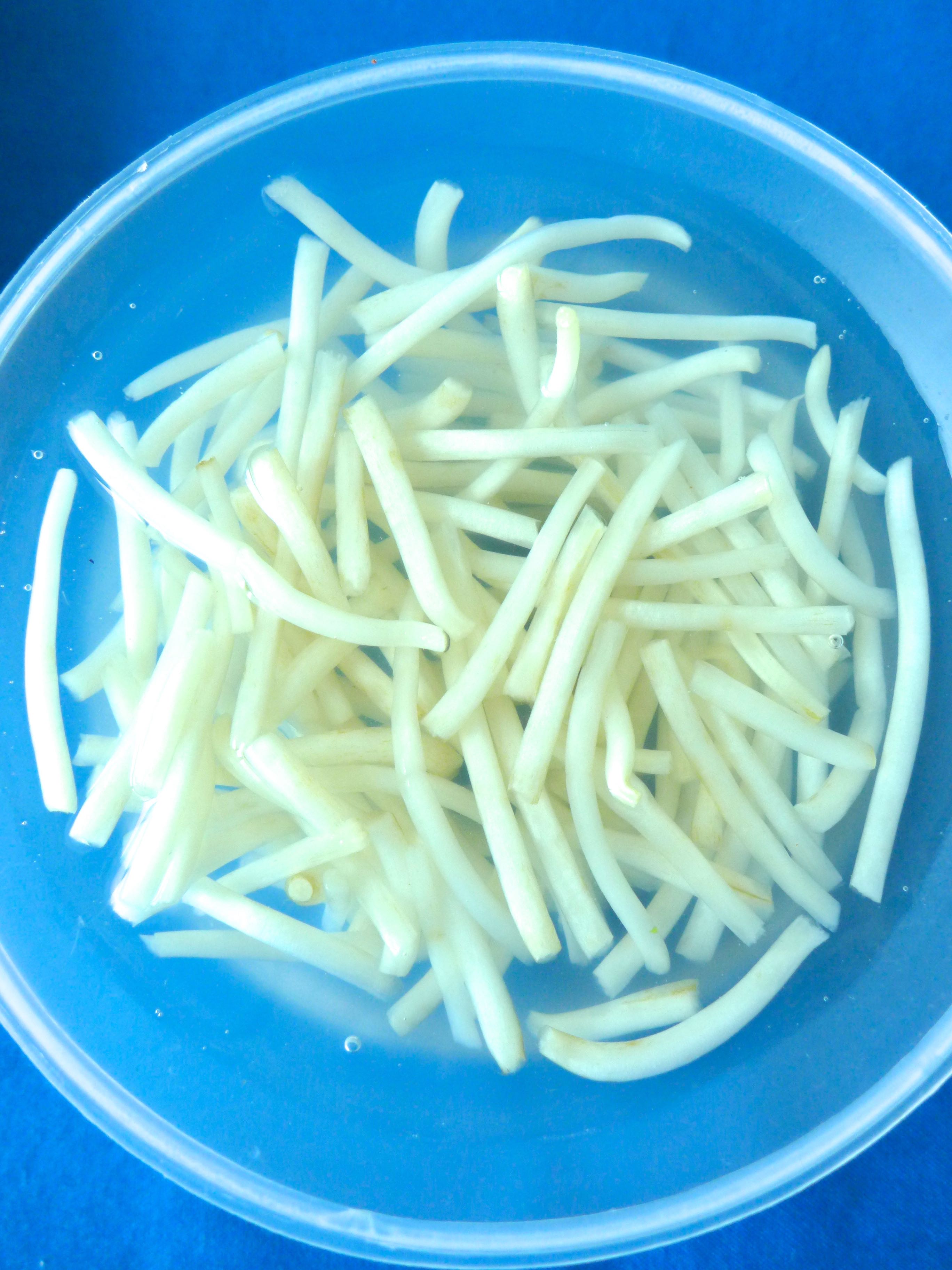 Pongo una cazuela con agua a fuego medio-alto. Cuando rompe a hervir, echo los vermicelli y los dejo cociendo un par de minutos. Entonces, los retiro del fuego y los pongo en un recipiente con agua fría. Luego, los escurro.