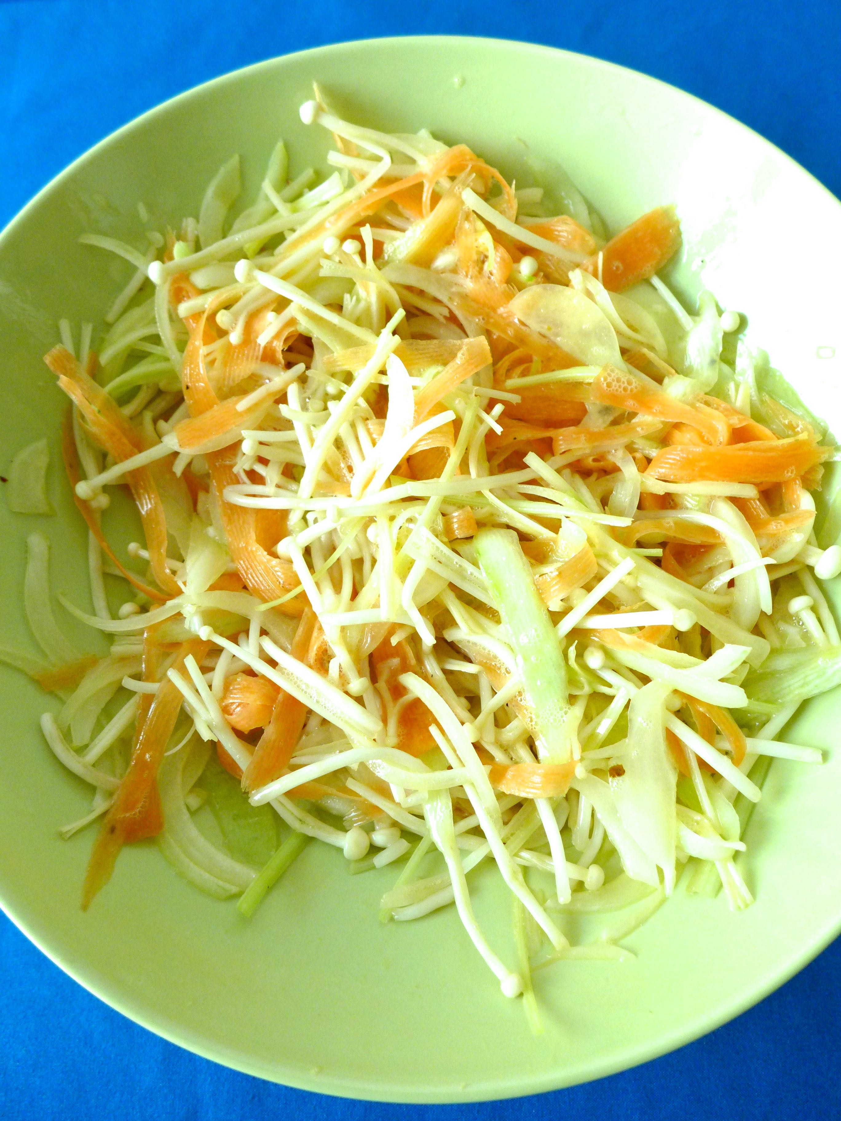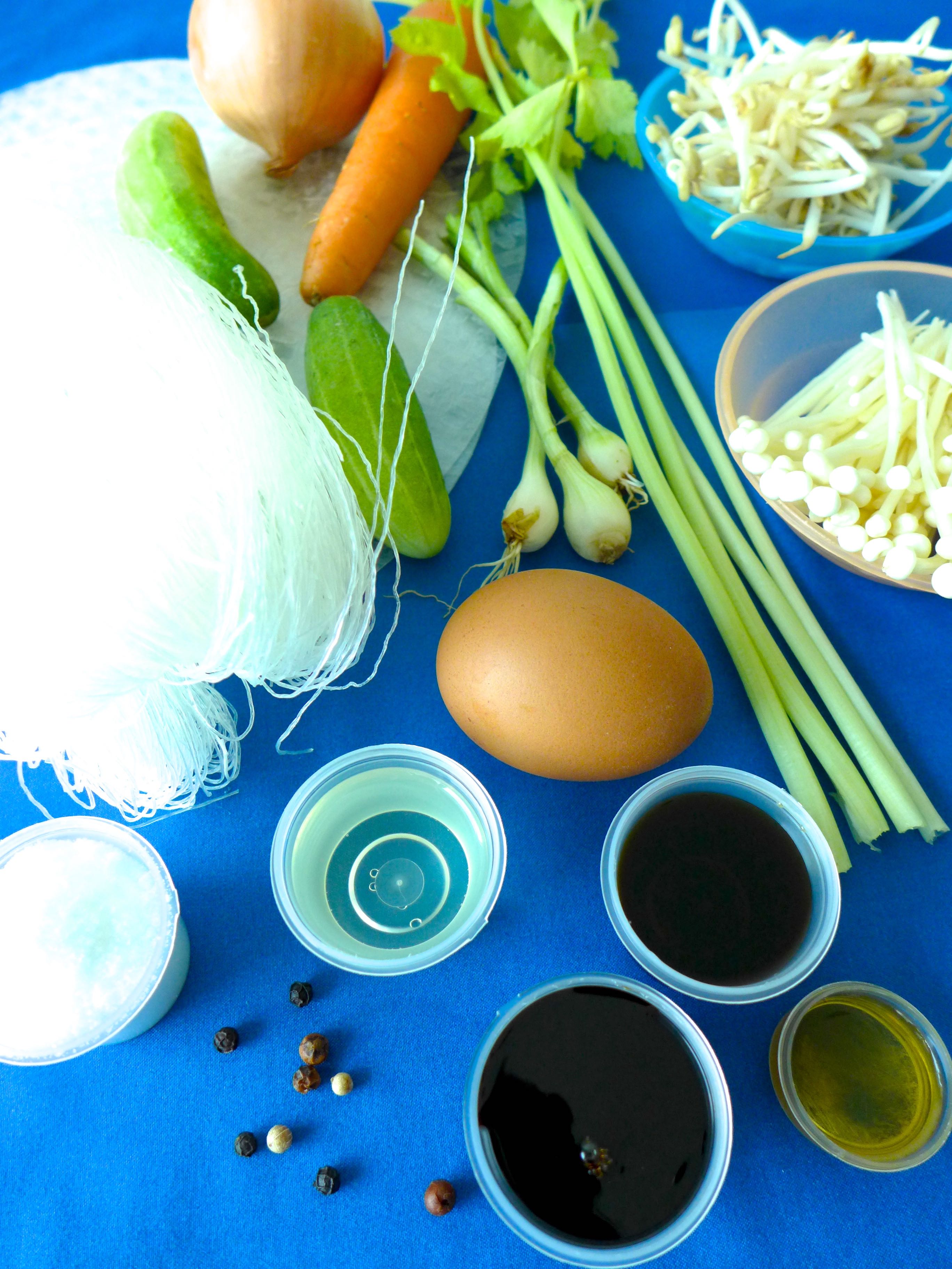 Limpio los brotes de soja. Lamino la zanahoria, el pepino y el apio. Pico la cebolla y las cebolletas.