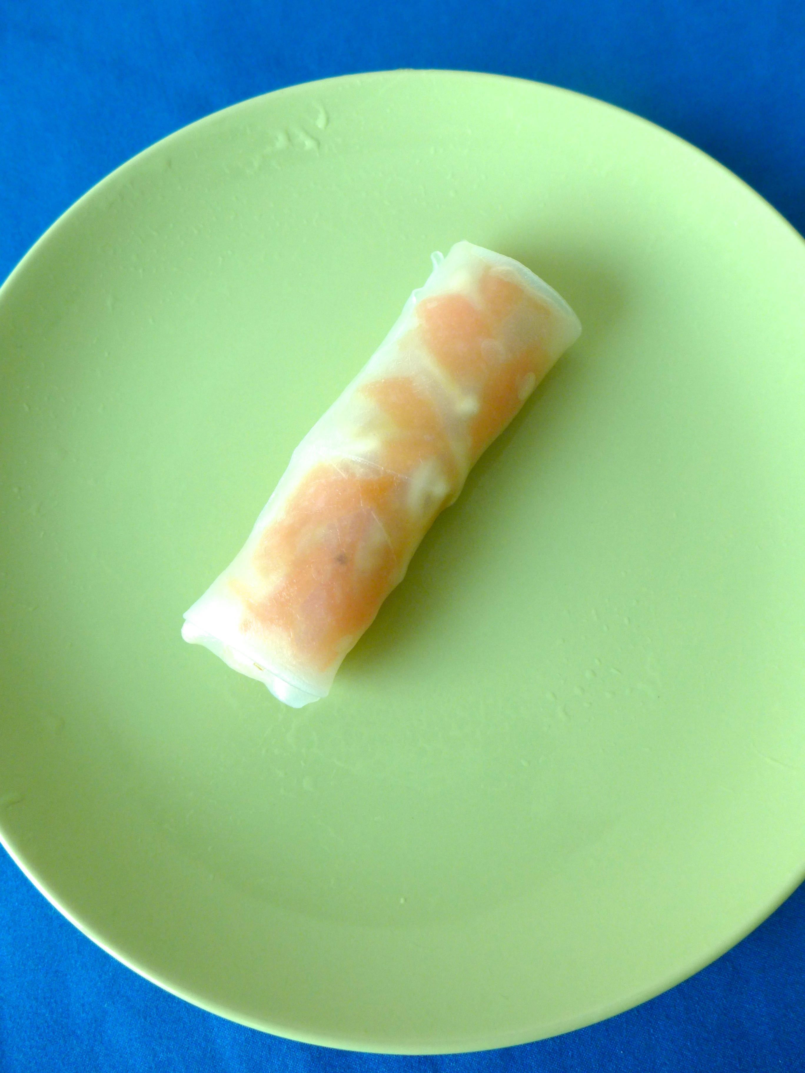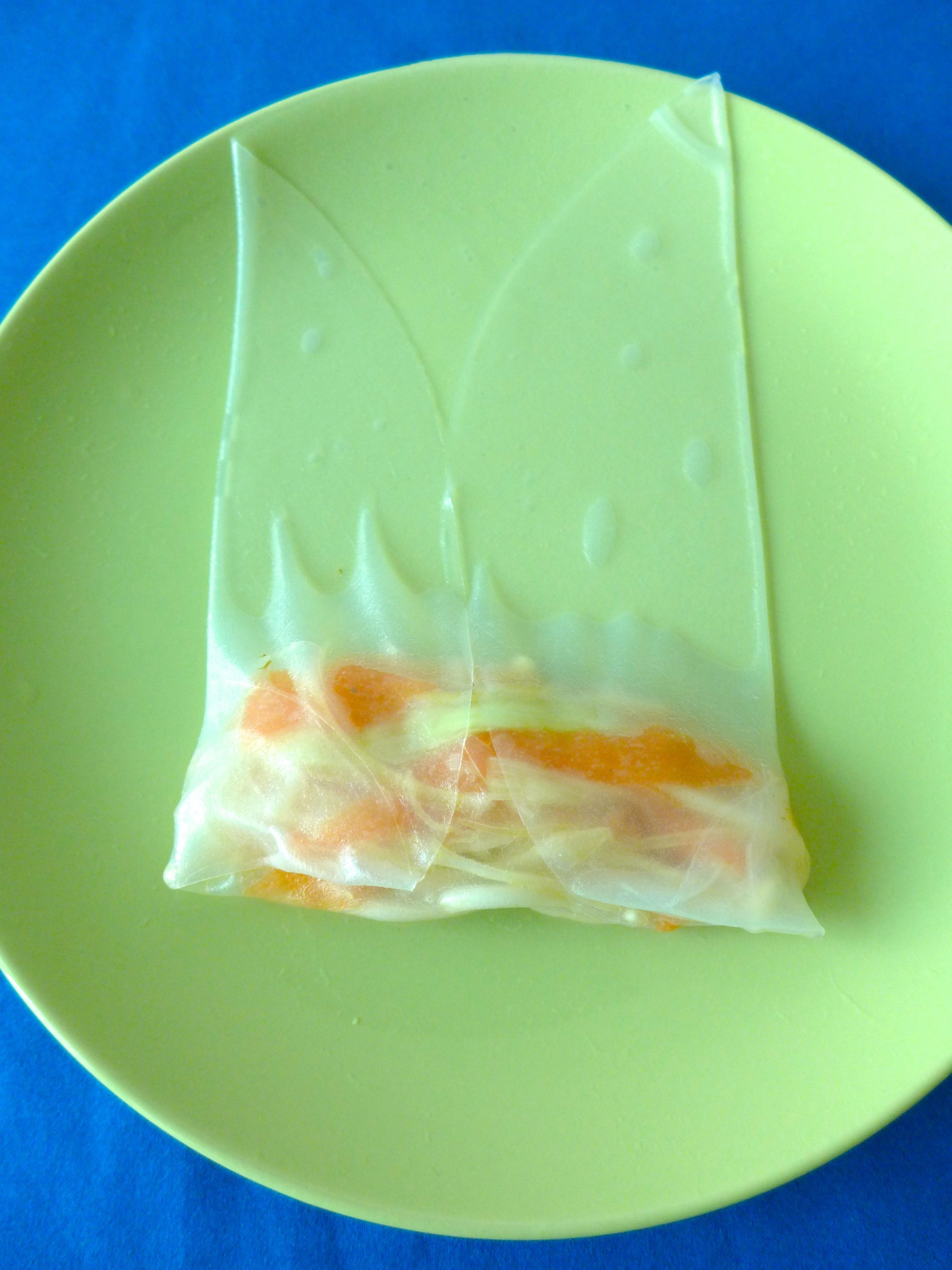 Pongo, uno por uno, los papeles de arroz en agua hasta que se ablandan (menos de un minuto).
