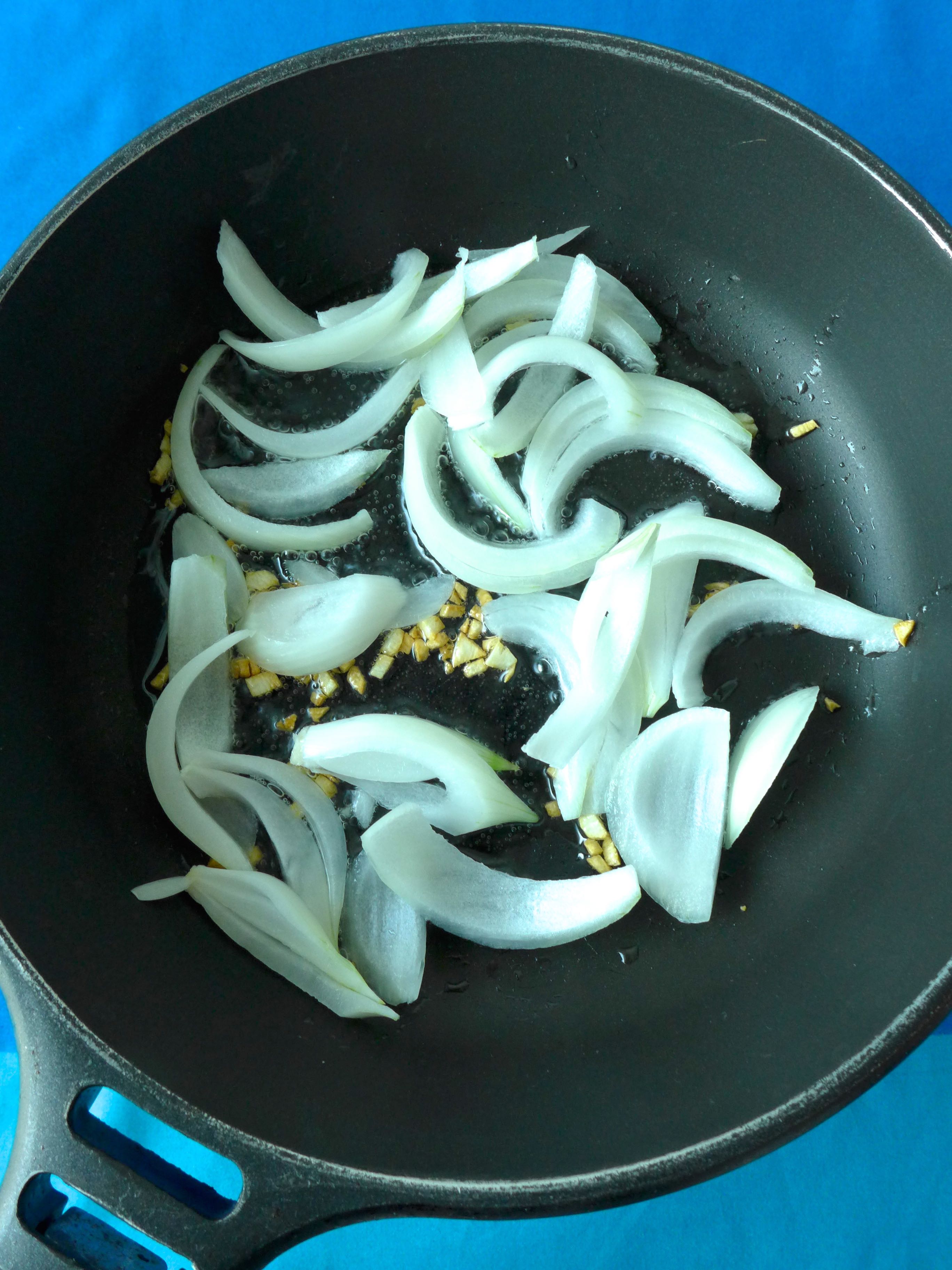 Rehogo el ajo en una sartén a fuego medio. Cuando empieza a dorarse, añado la cebolla, los champiñones, la ternera, la salsa de soja, la maicena y el agua. Lo dejo cocinar unos 5 minutos.