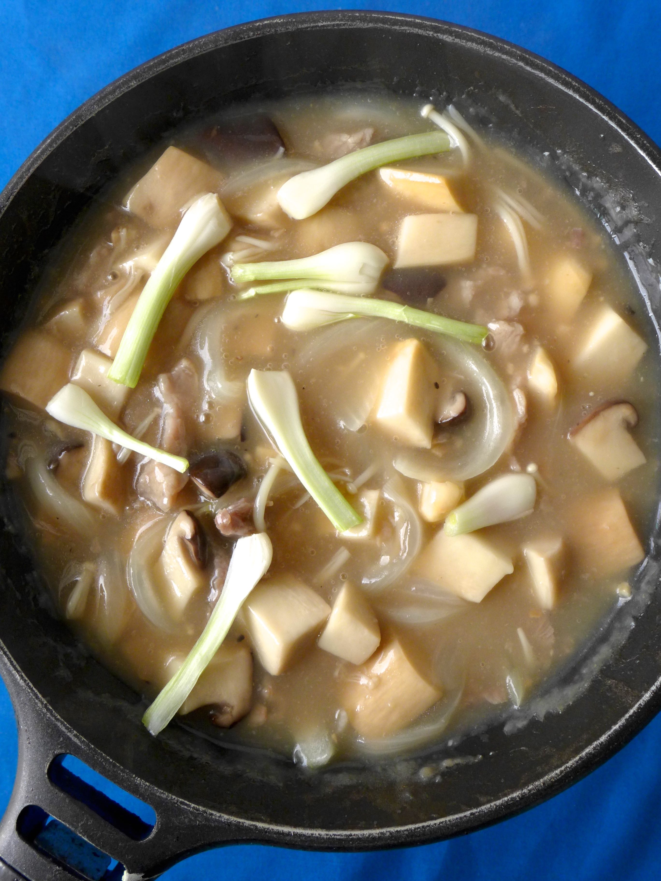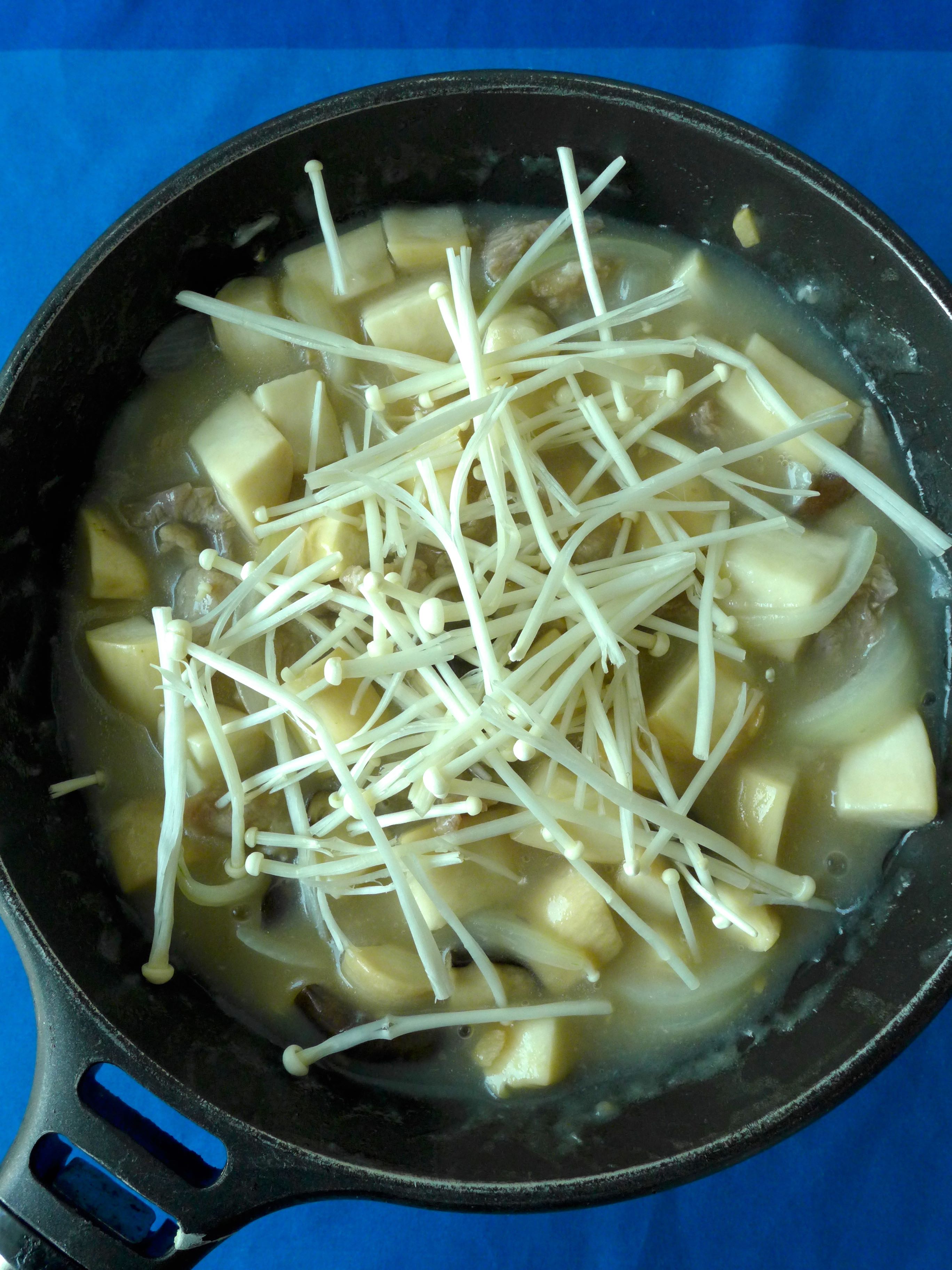 Entonces, añado las setas alargadas, la salsa de ostras, la salsa de pescado y el azúcar. Remuevo.