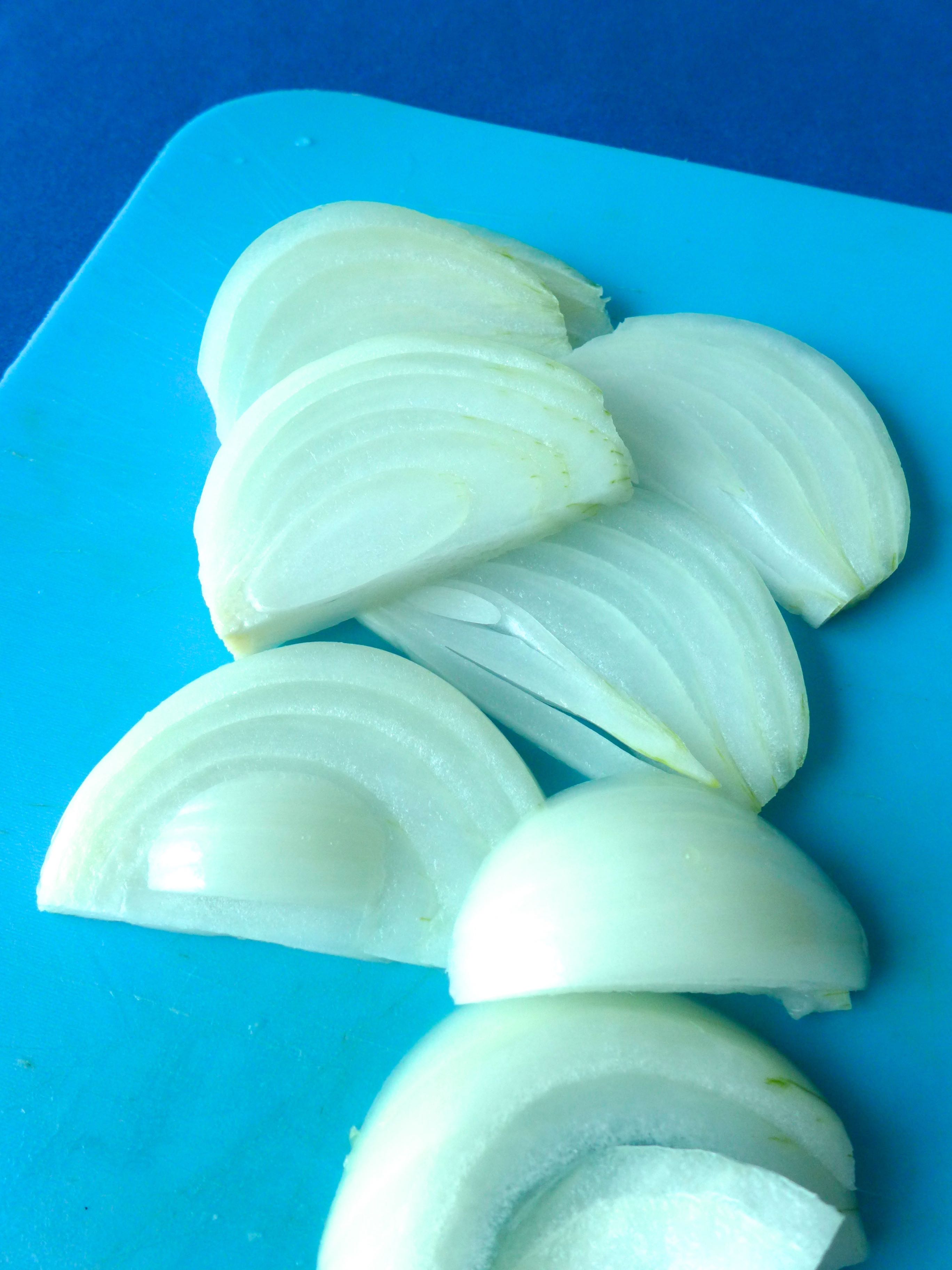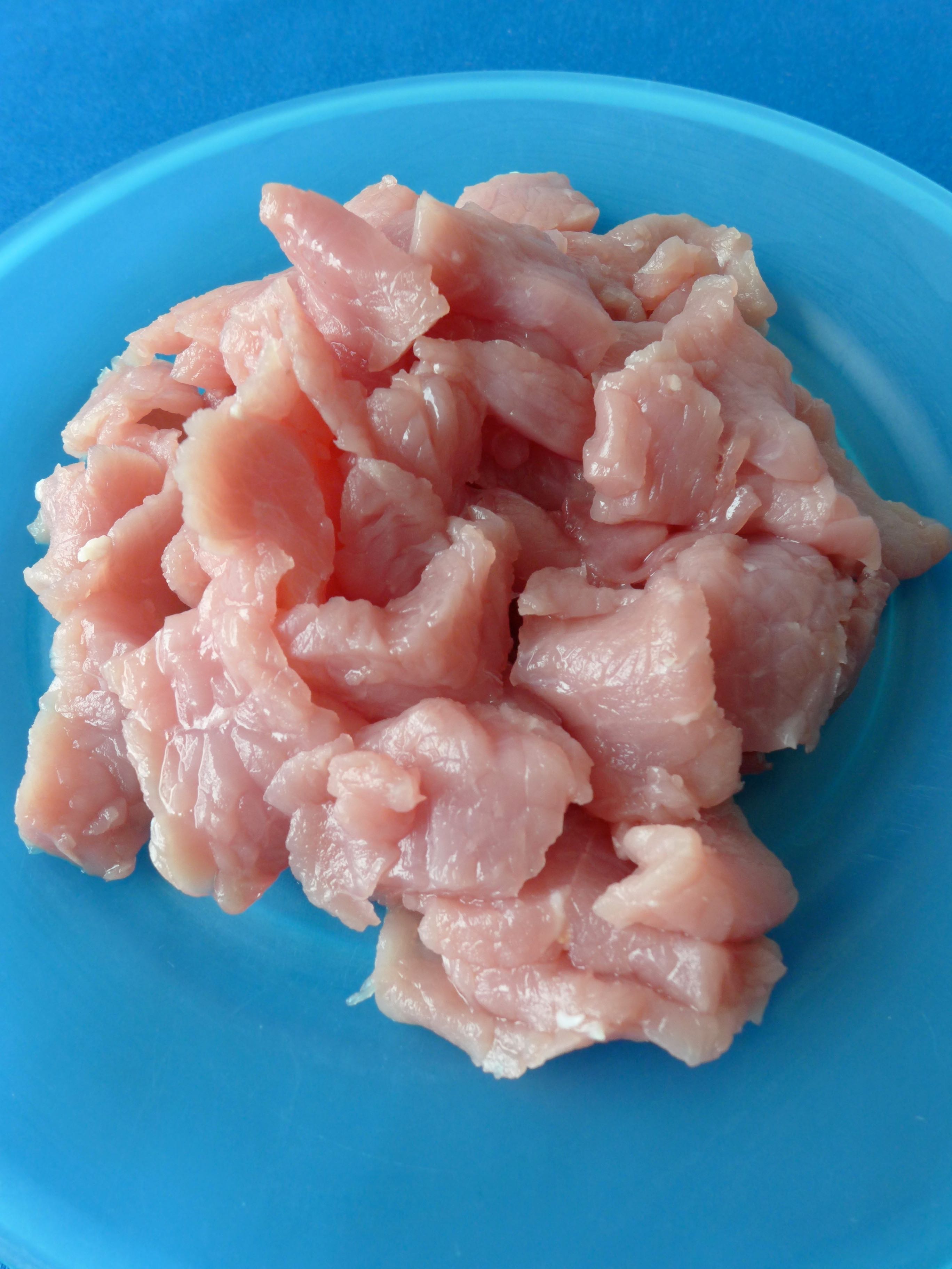 Pico el ajo. Corto la ternera en trozos pequeños y finos. Troceo los champiñones. Corto la cebolla en trozos grandes. Limpio las cebolletas.