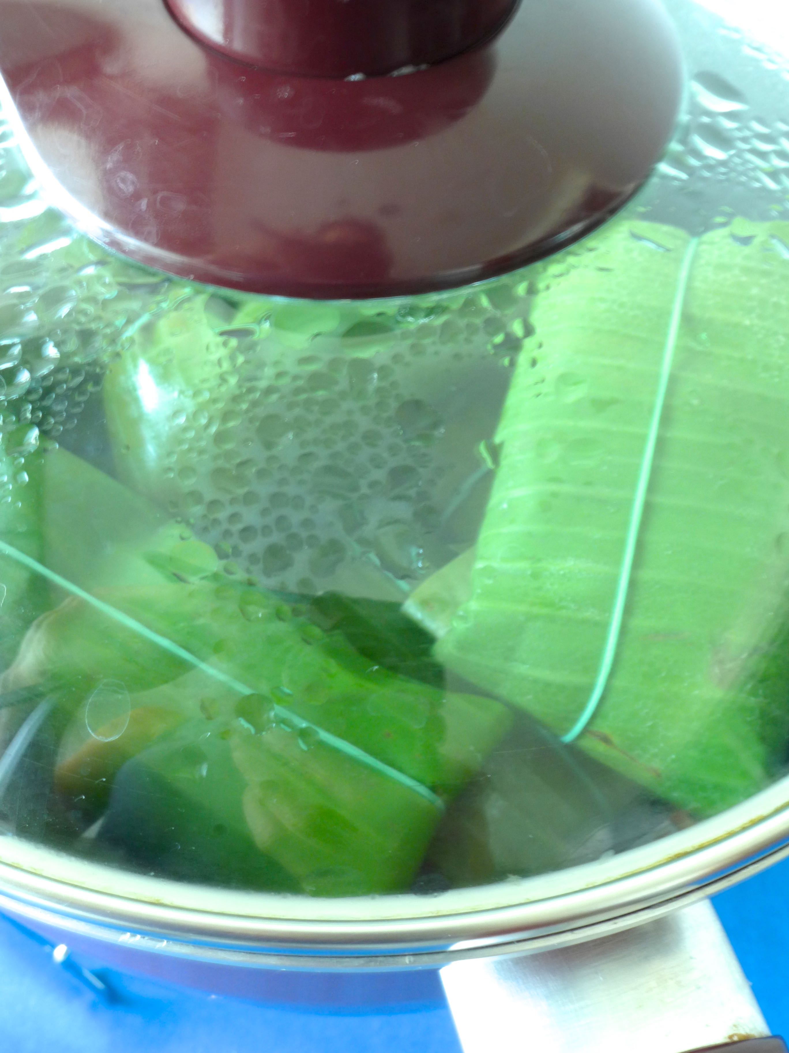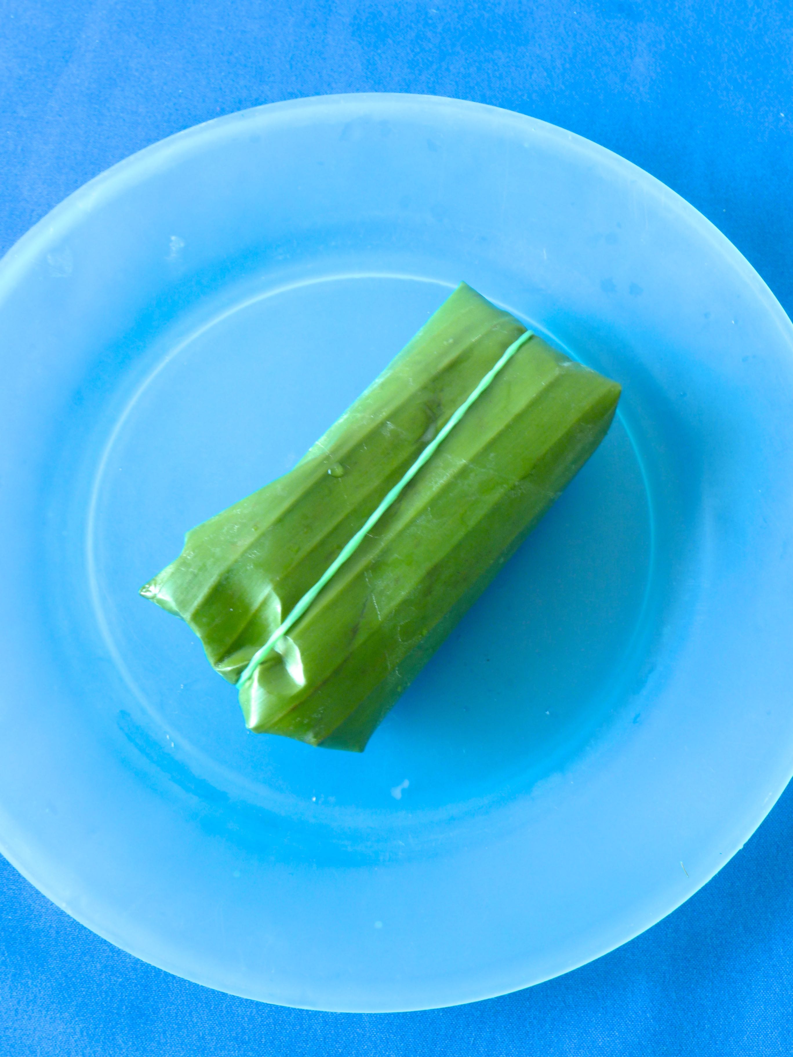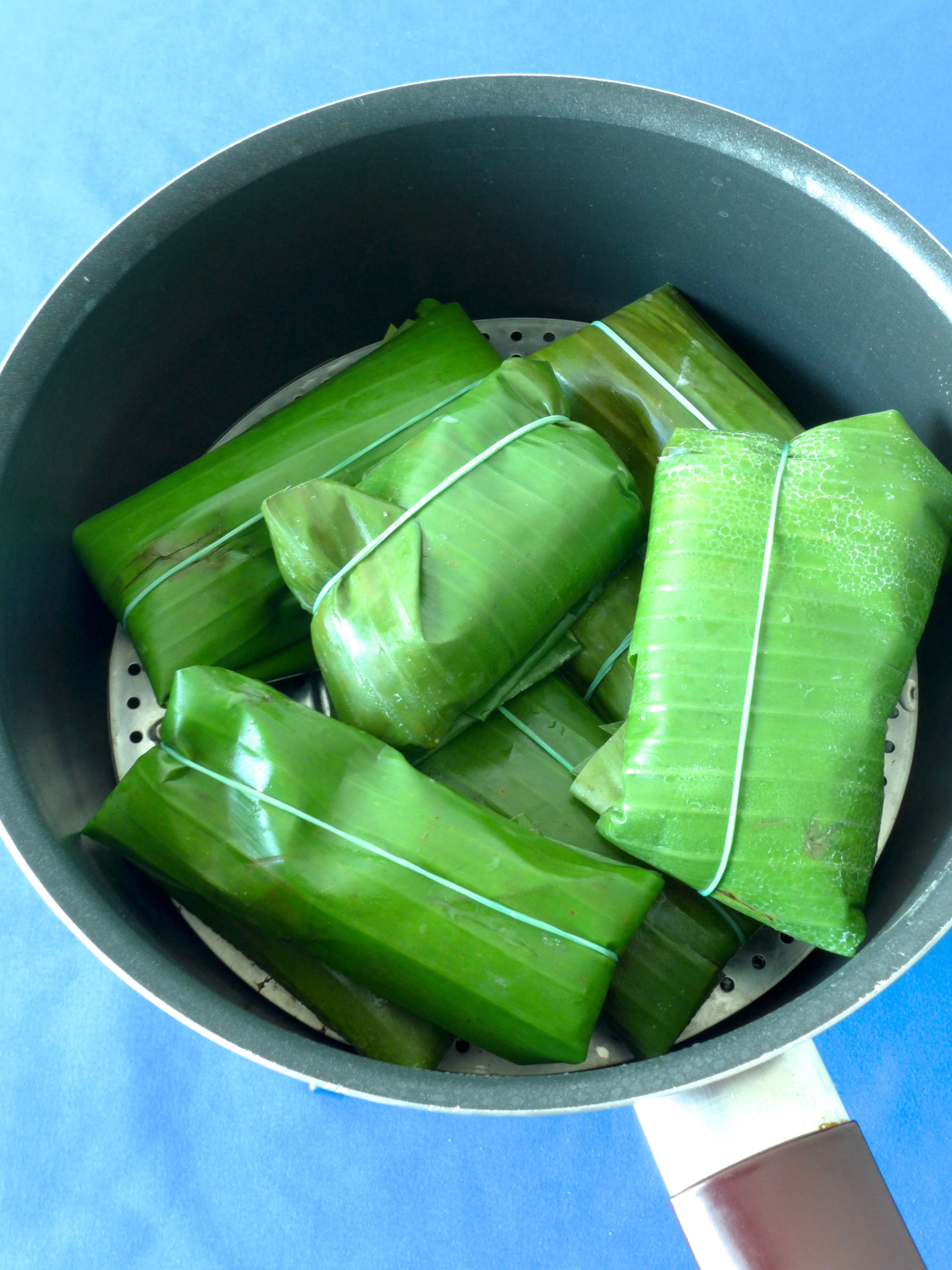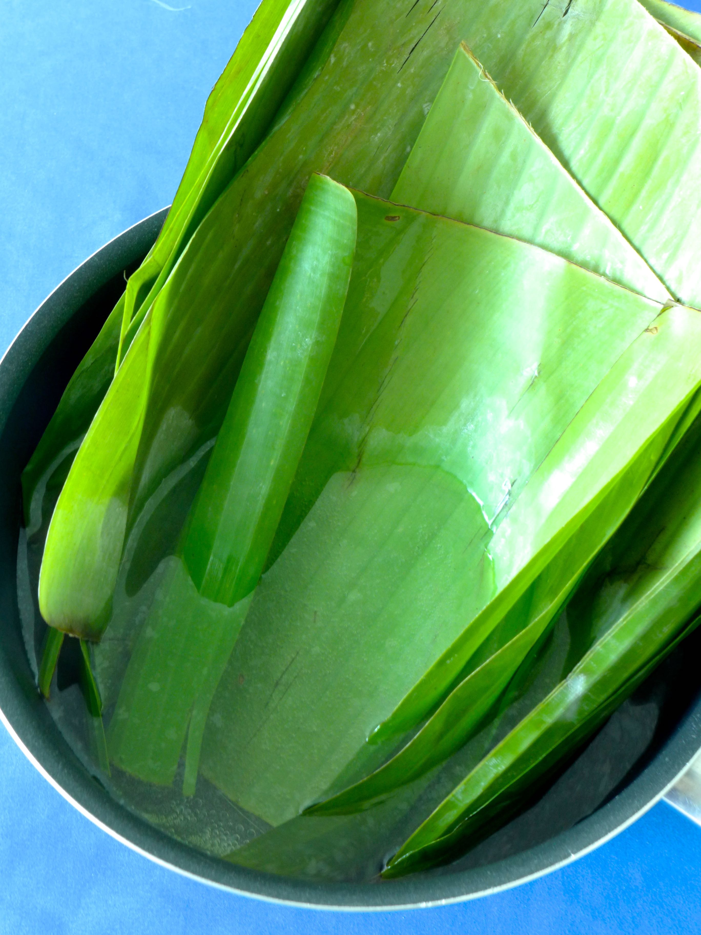 Caliento agua en una cazuela, la retiro del fuego y escaldo las hojas de plátano un par de minutos para que se ablanden.
