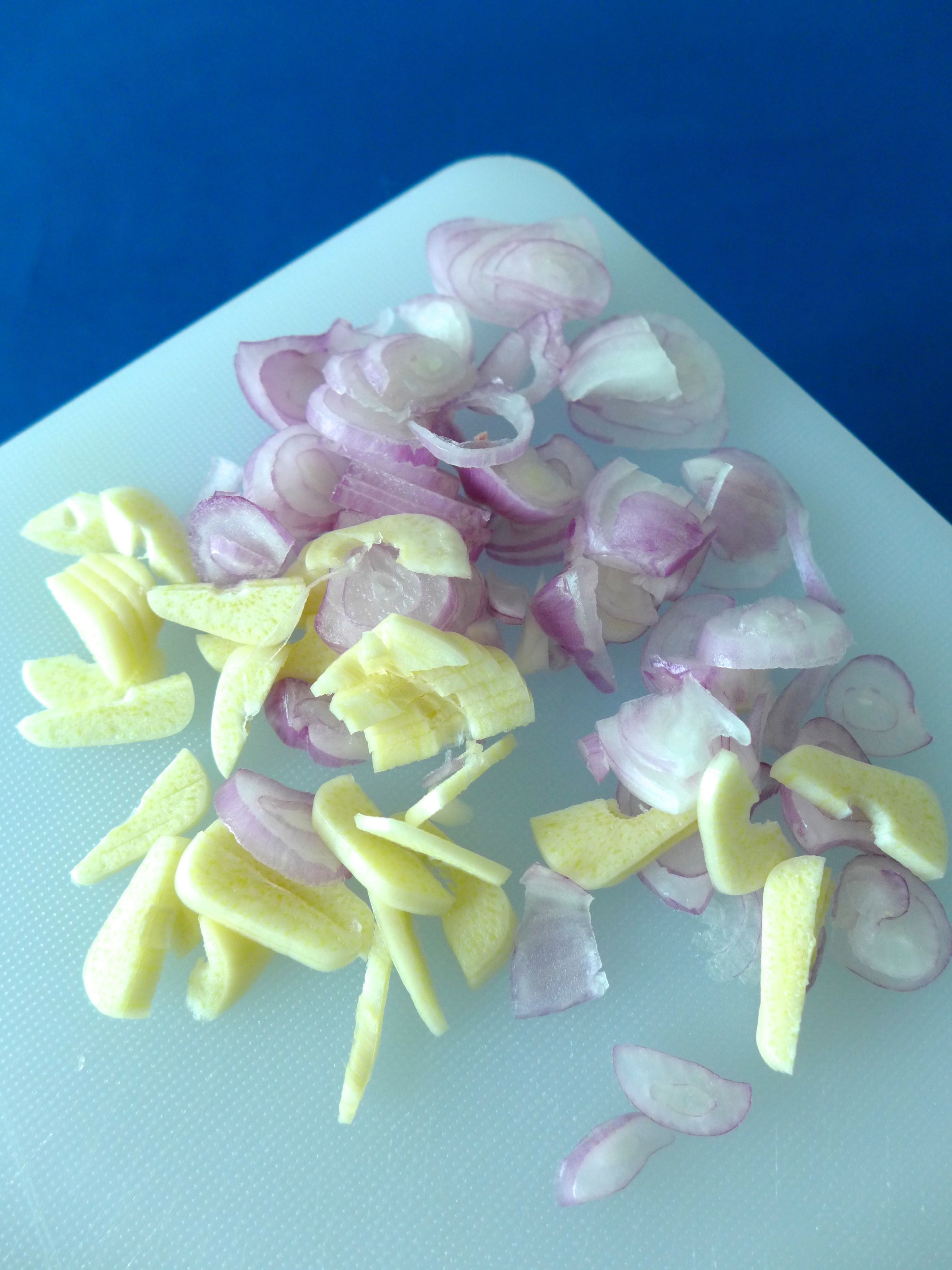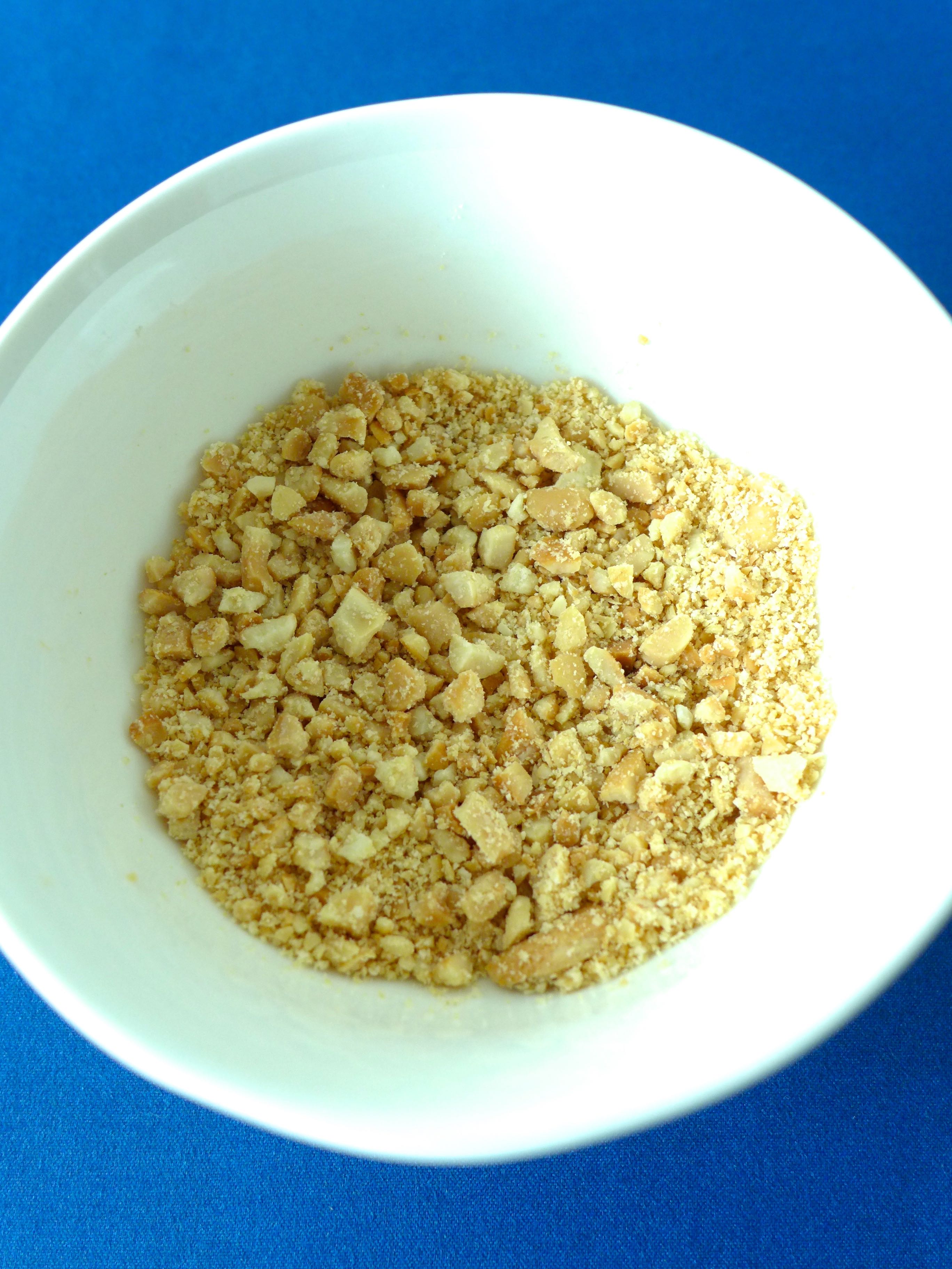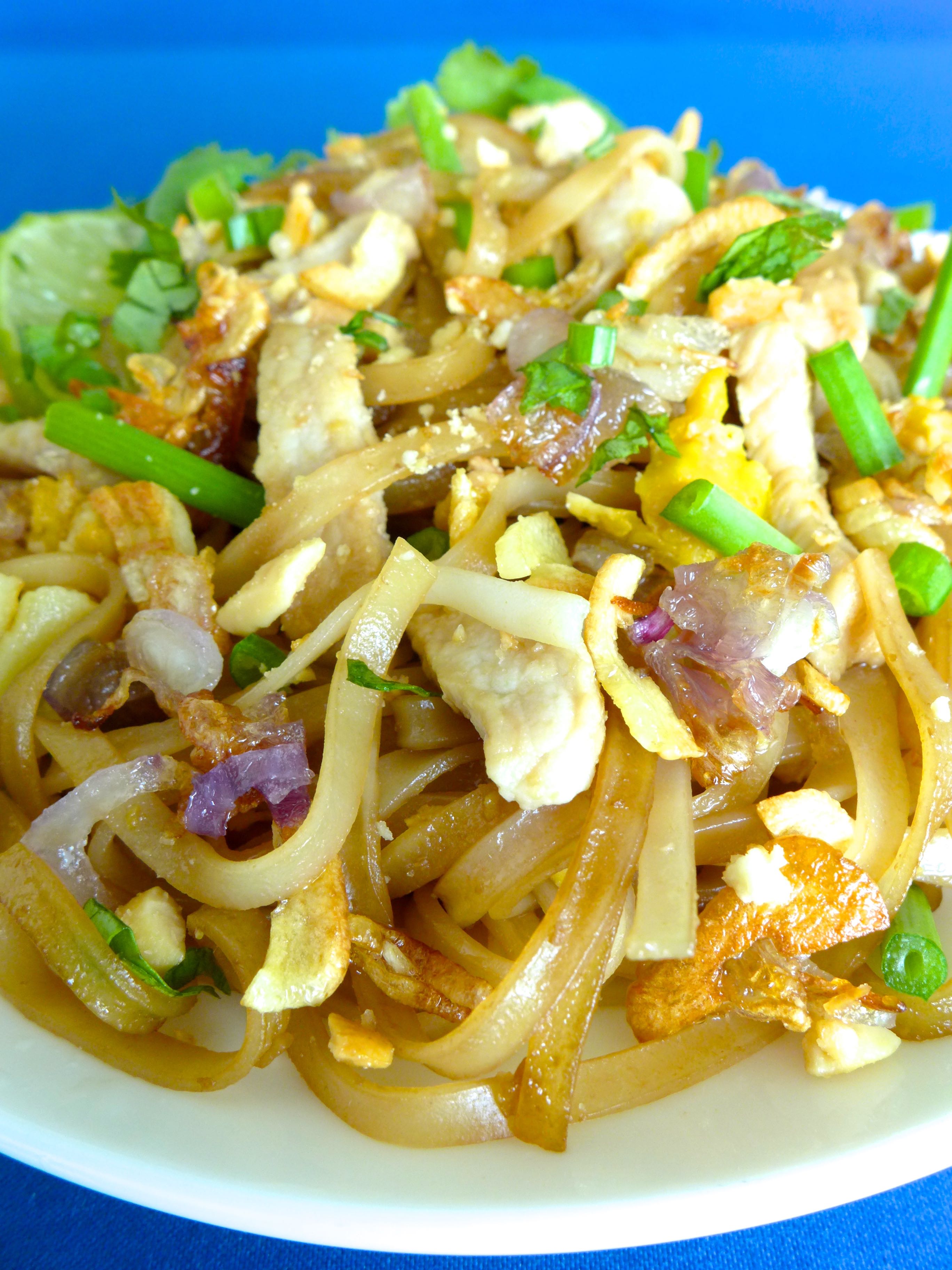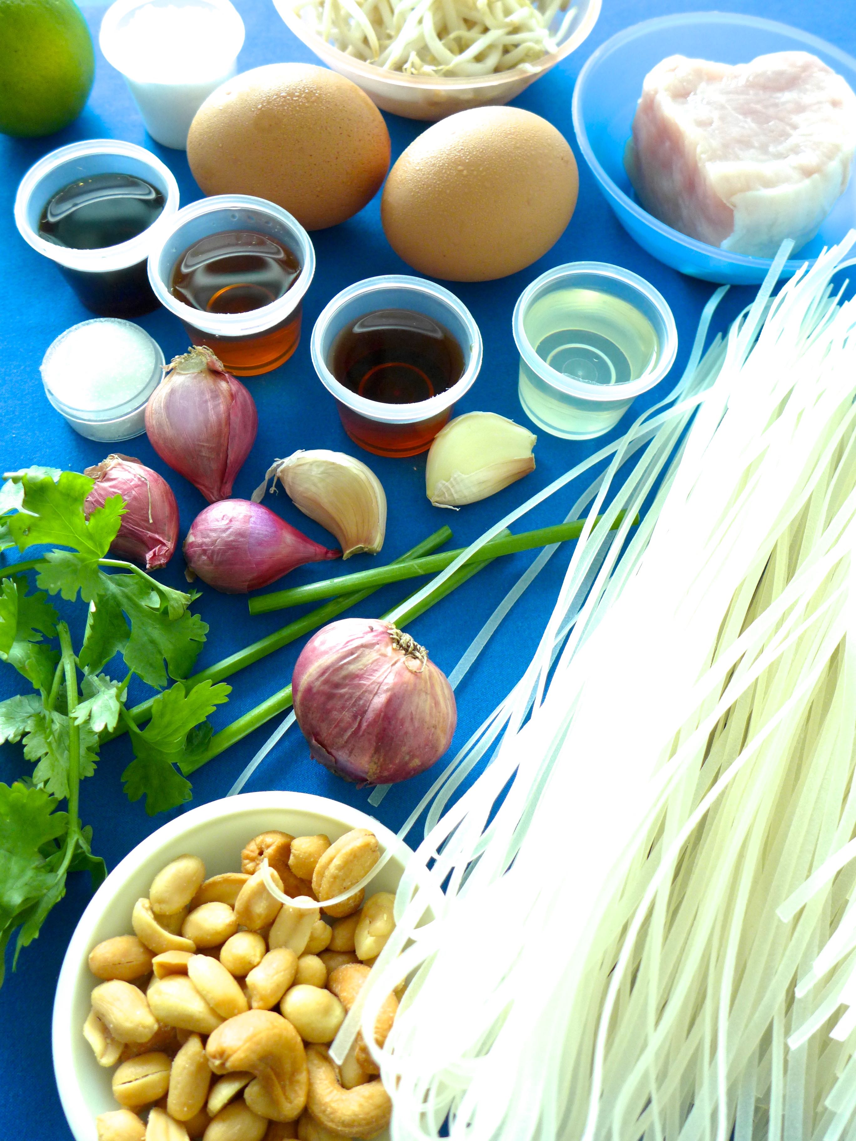Sirvo los noodles con cacahuetes y anacardos picados, cebollino, gajos de lima, cilantro, y chalotes y ajo fritos.