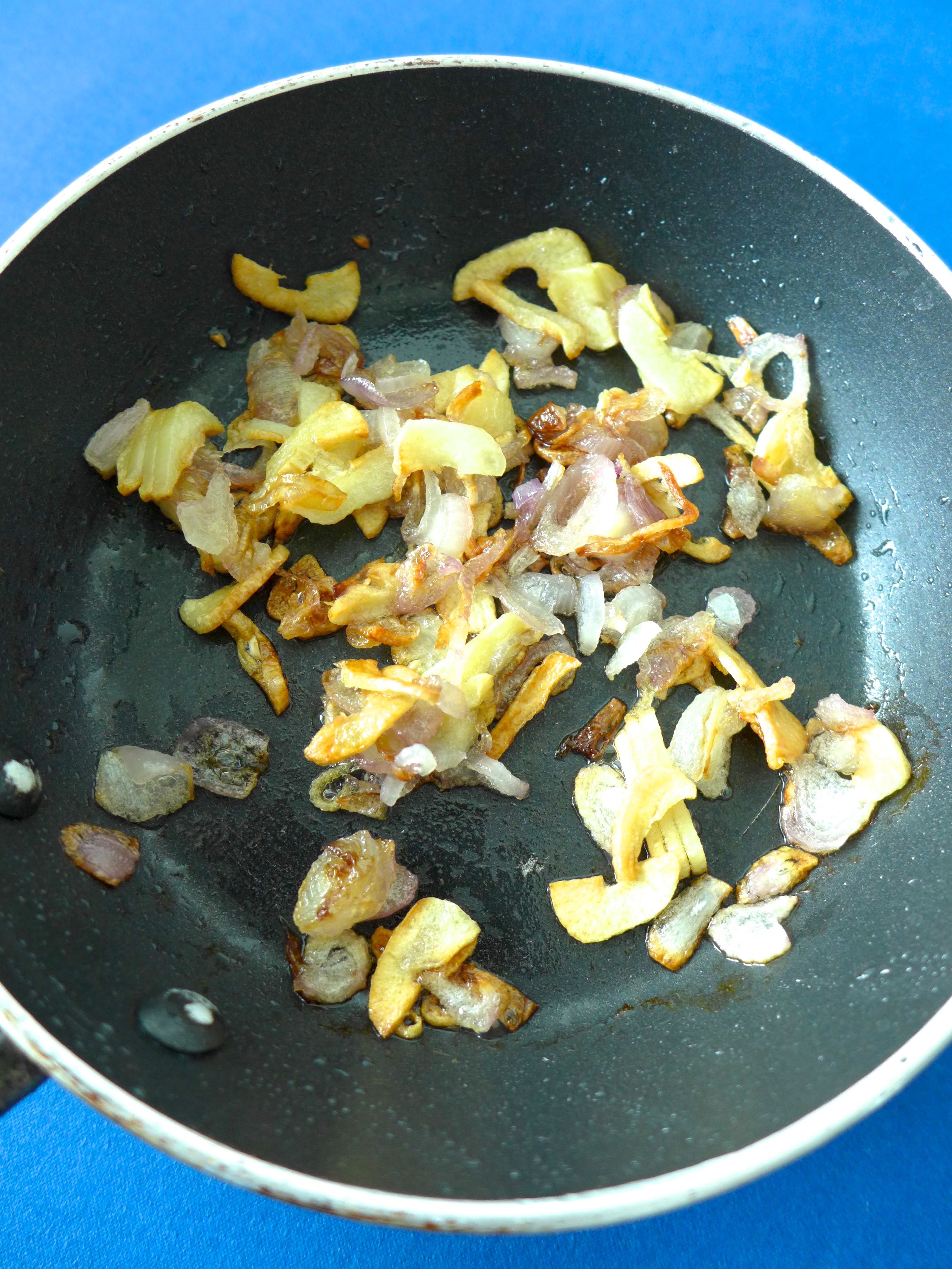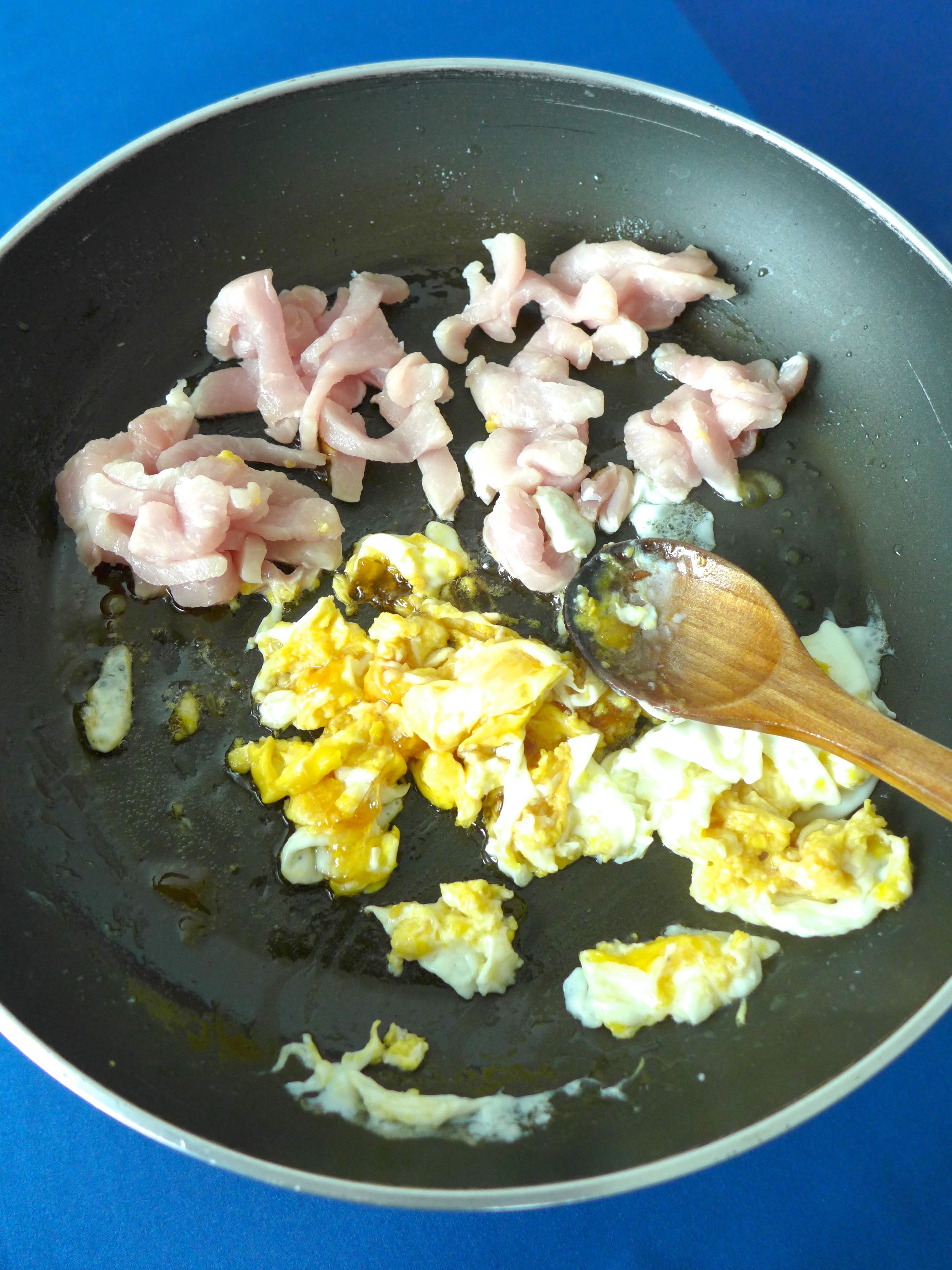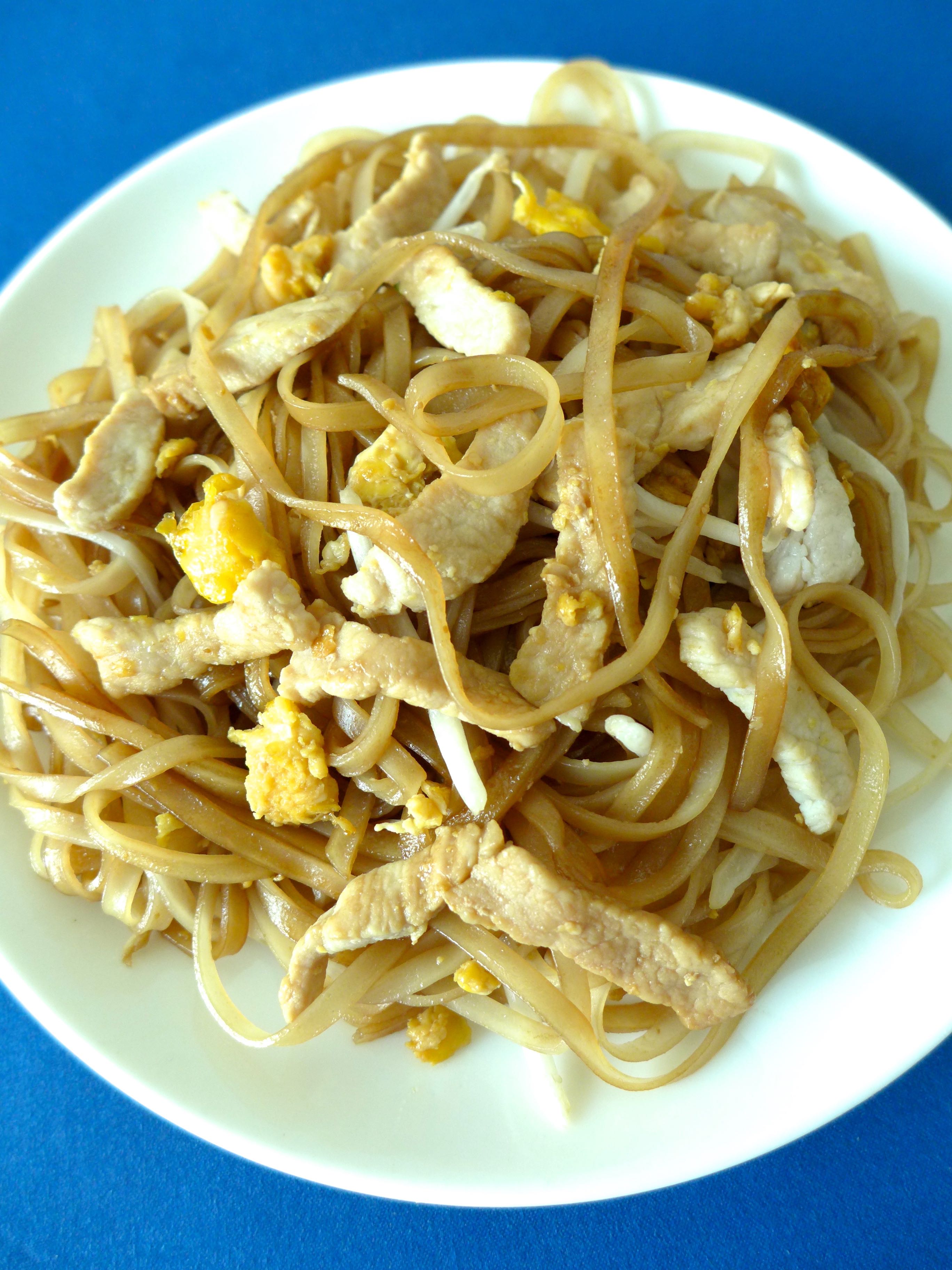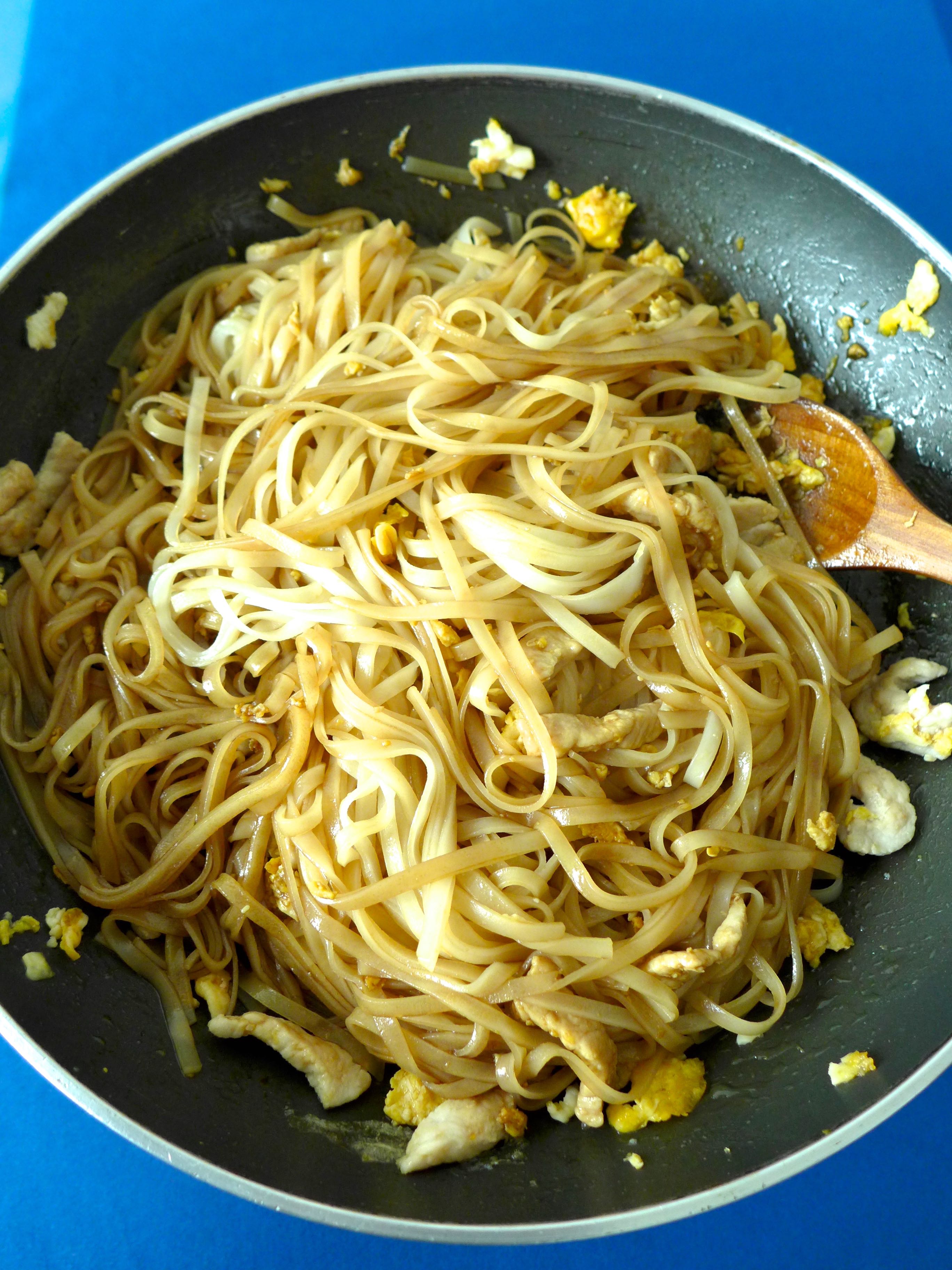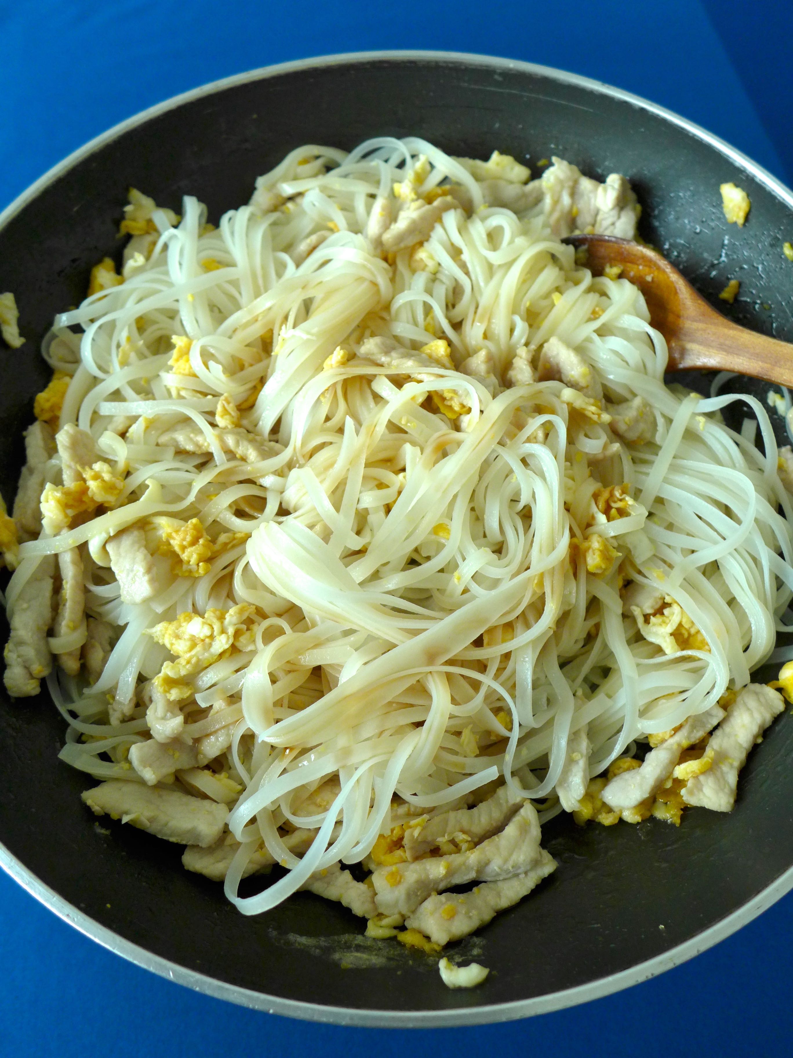 Derrito, sin remover, el azúcar en una sartén con un poco de aceite a fuego alto. Cuando el azúcar empieza a caramelizarse, rompo los huevos en un lado de la sartén. Cuando empiezan a cuajar, los remuevo un poco y añado las tiras de cerdo, la salsa de ostras y la sal en el otro lado de la sartén. Remuevo y, cuando el cerdo está hecho, lo mezclo todo y añado los noodles . Lo mezclo a fuego bajo. Luego, echo la salsa de soja y la salsa de soja dulce. Remuevo y añado los brotes de soja.