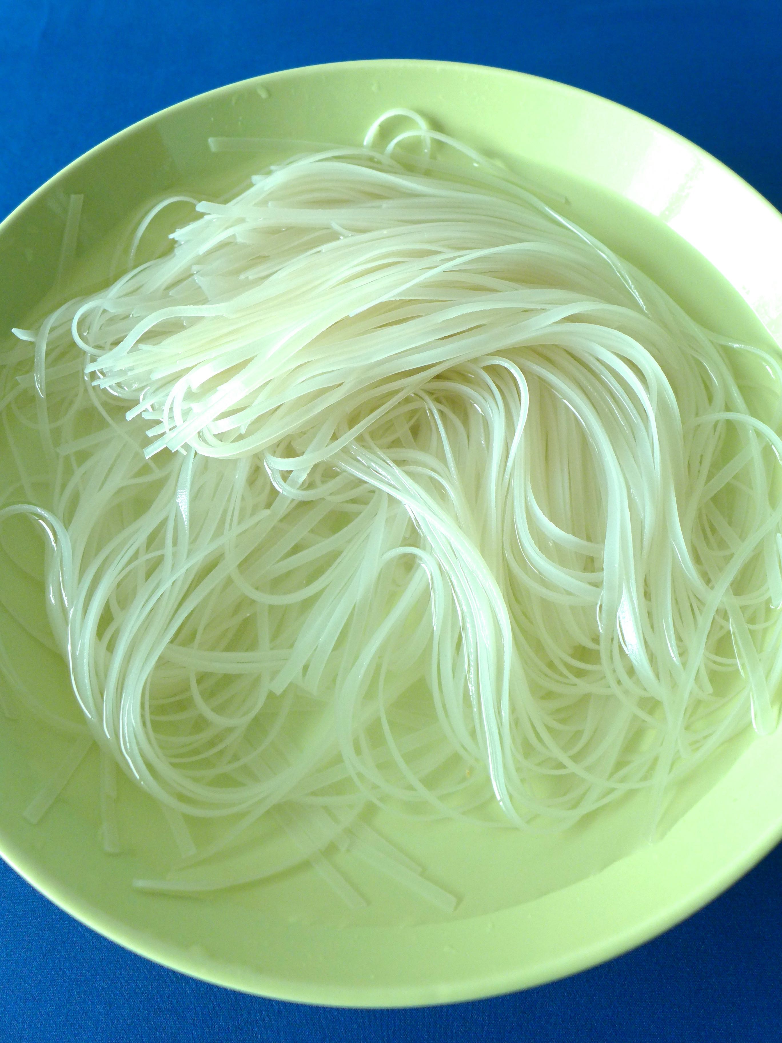 Pongo los noodles a remojo en agua templada durante 15 minutos. Luego, los cuelo y reservo.