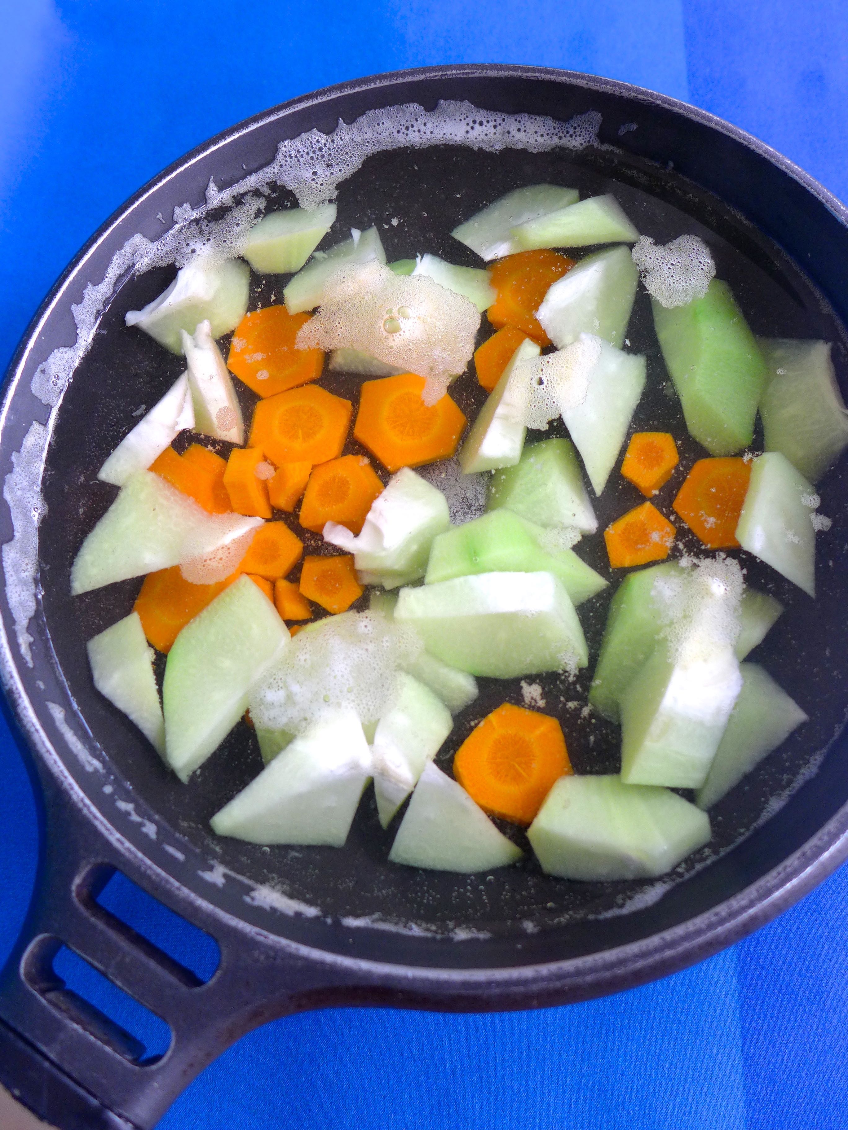 Pelo, troceo y cuezo la zanahoria y el sayote a fuego medio-alto hasta ablandar, de 10 a 15 minutos. Entonces, escurro las verduras.
