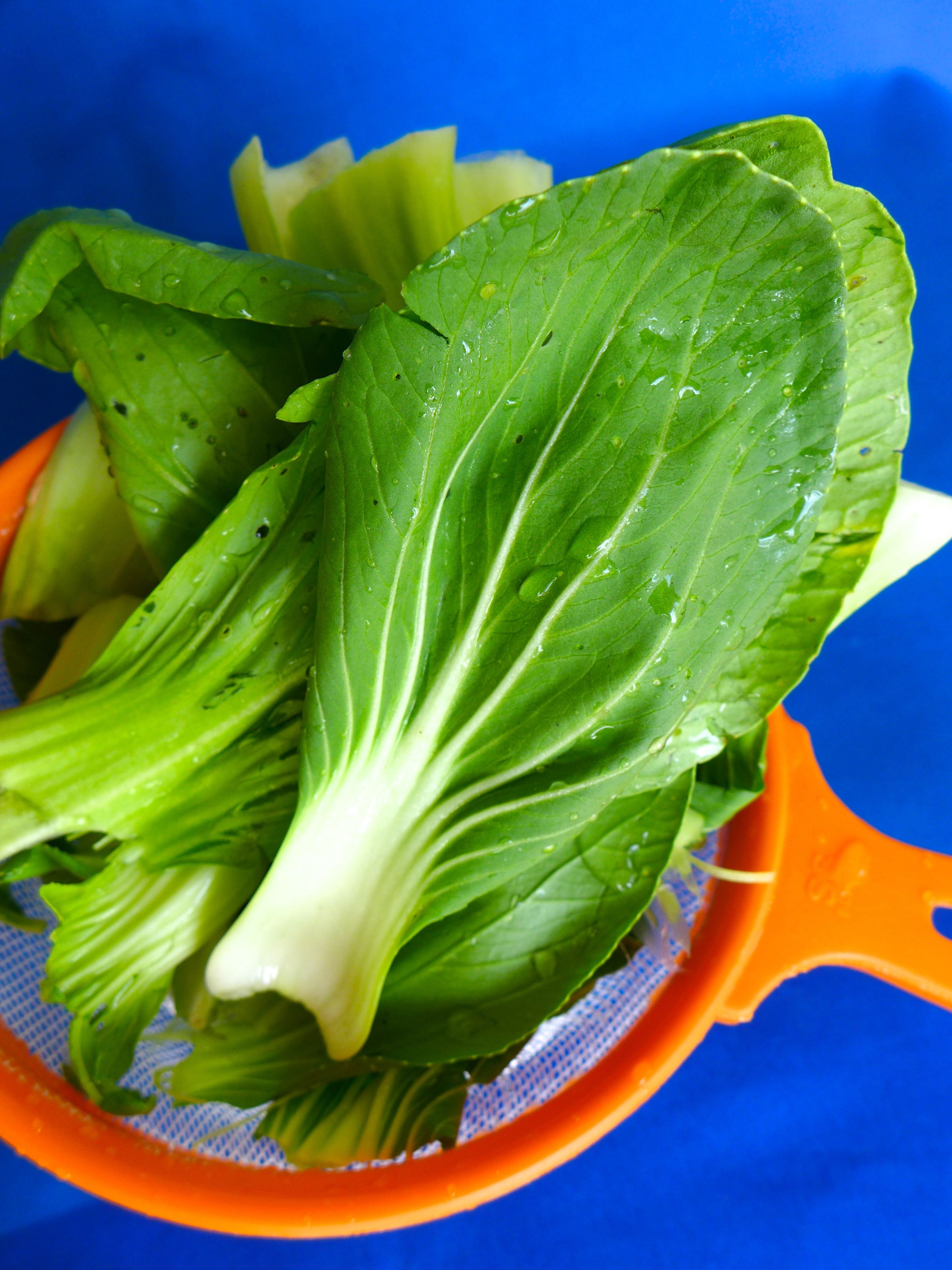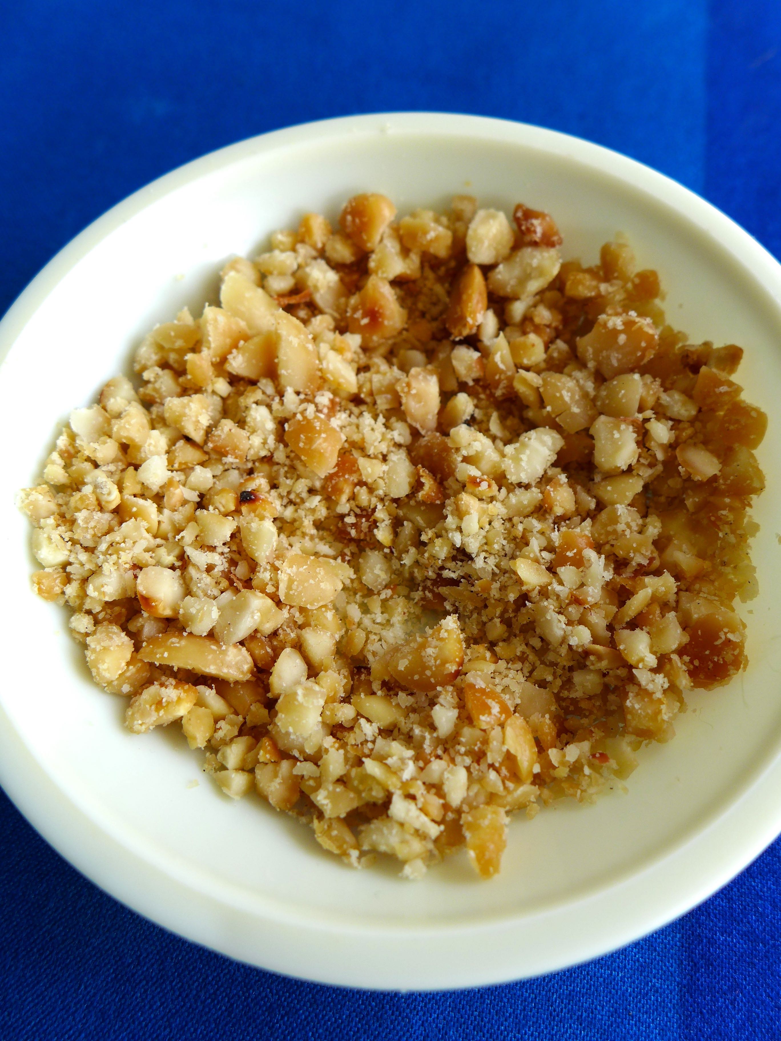 Mientras, trituro los cacahuetes. Lavo el pechay.