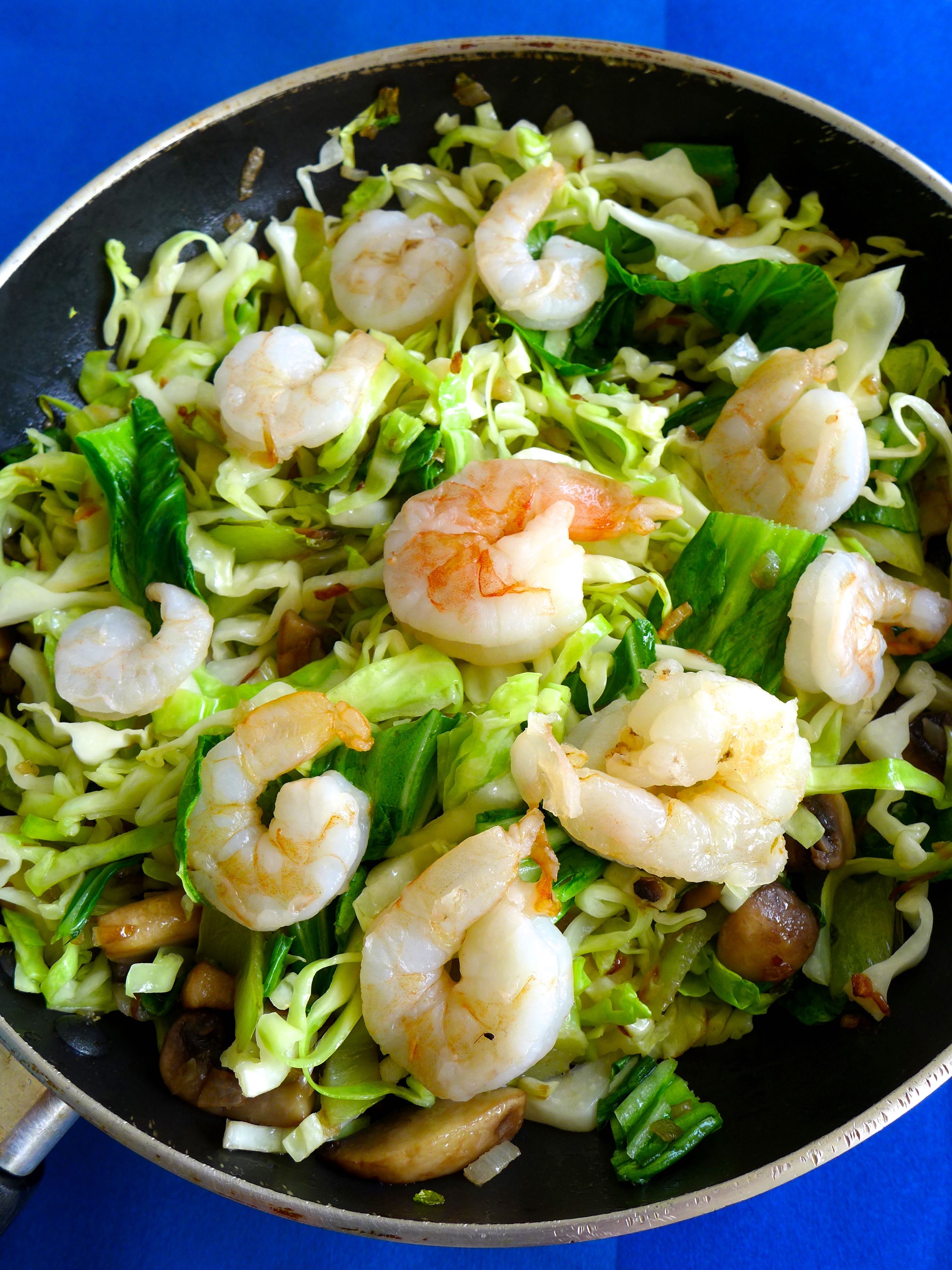 Luego añado las hojas de pechay y el repollo cortado en juliana.