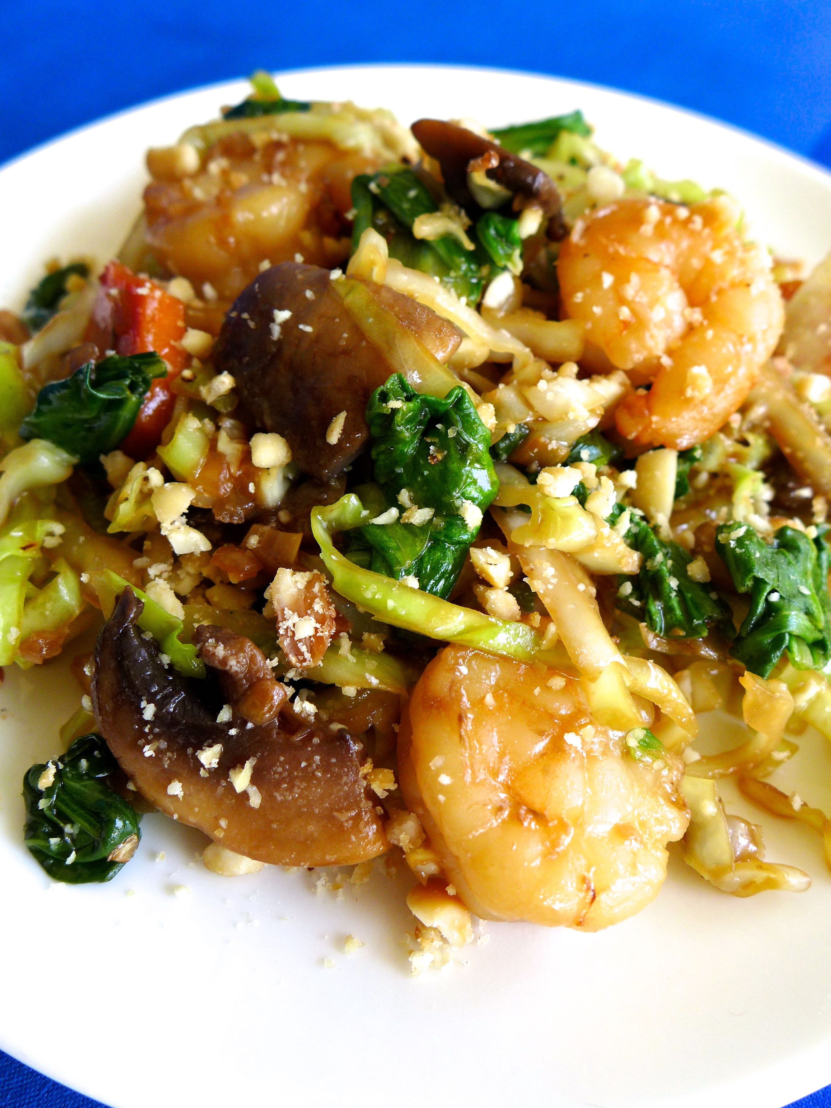 Lo mezclo y emplato el chopsuey. Espolvoreo cacahuetes triturados y lo sirvo caliente.