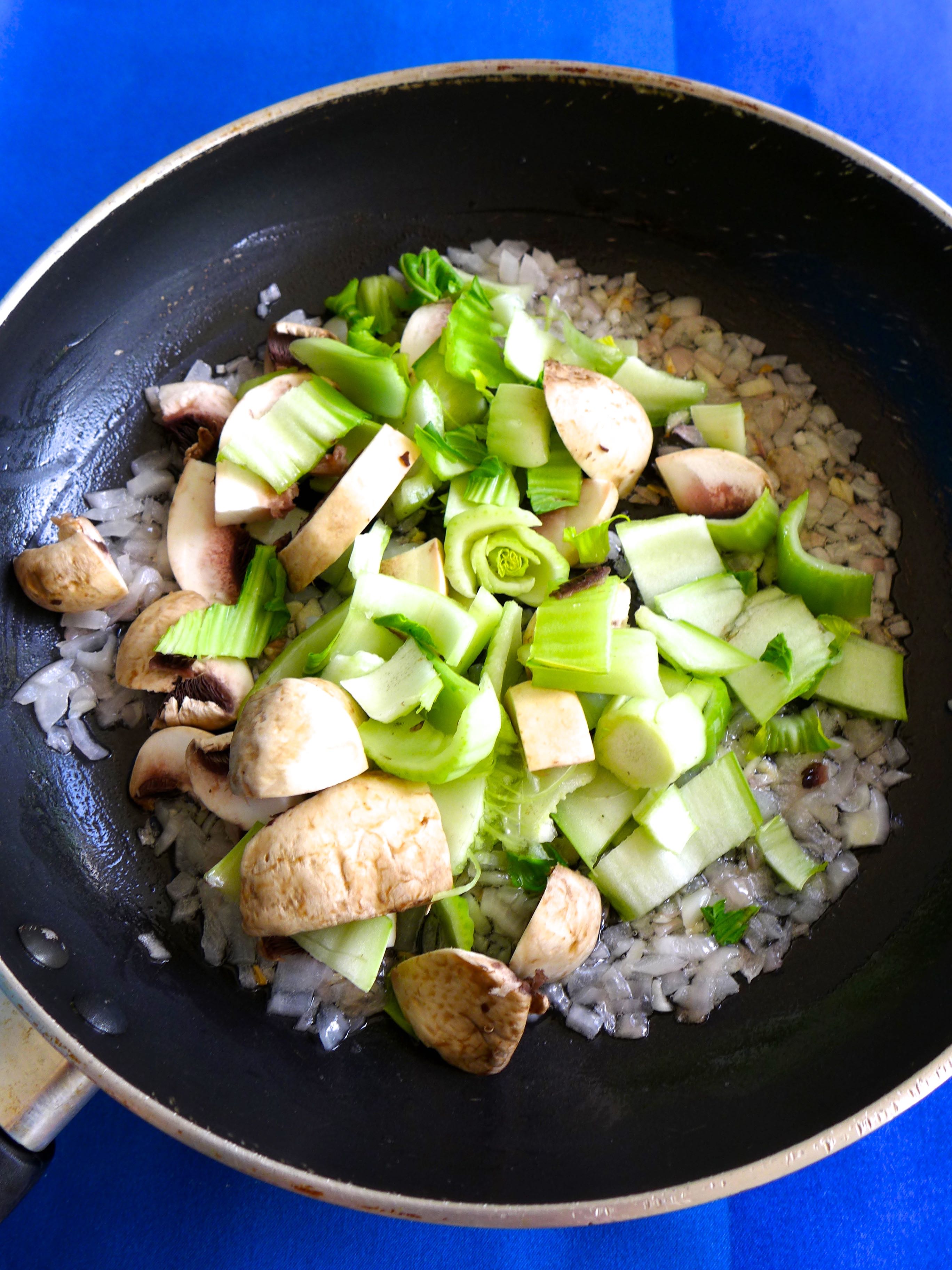 Troceo los champiñones y las pencas del pechay y las añado a la sartén. Los rehogo durante unos 5 minutos.