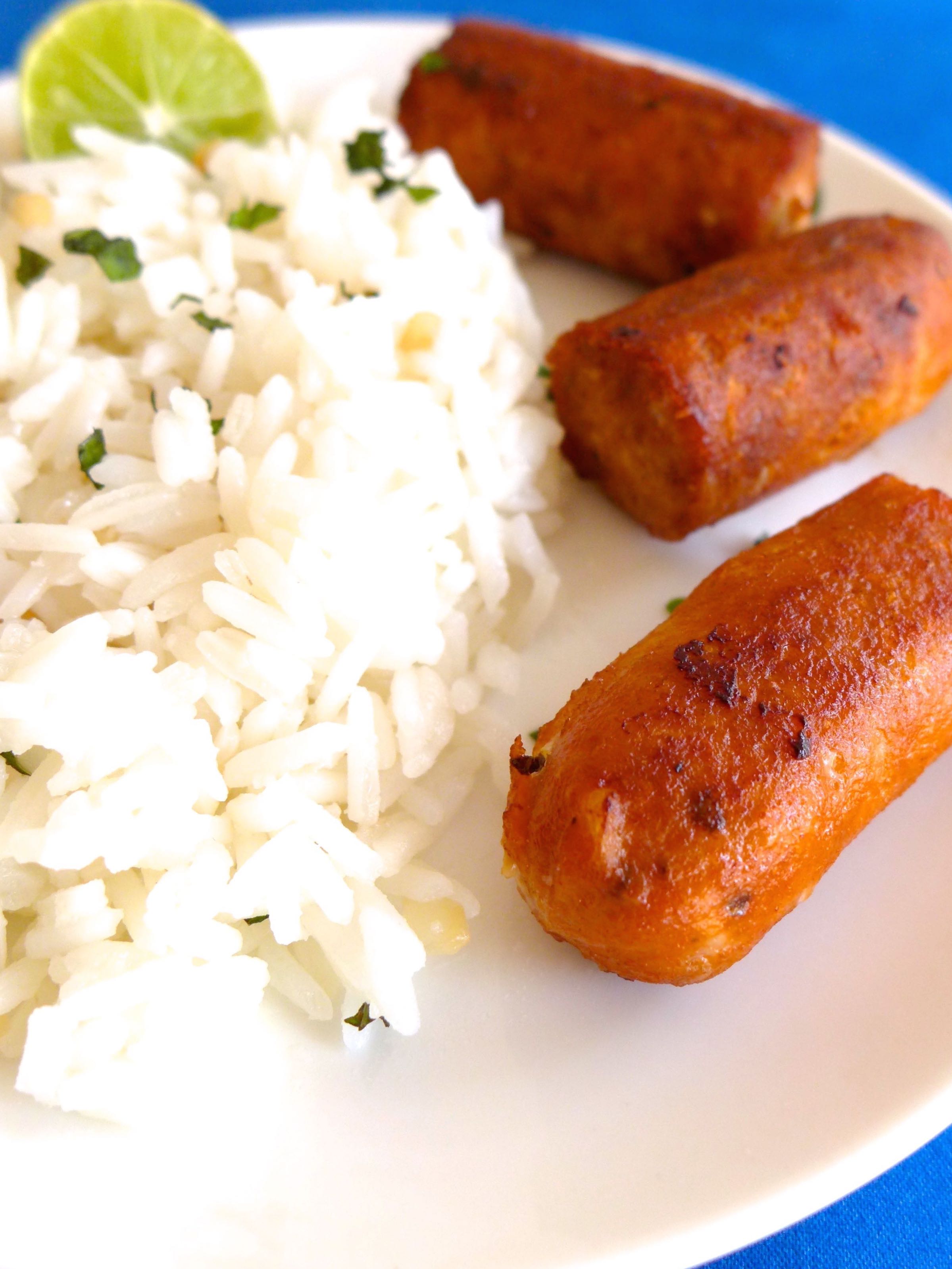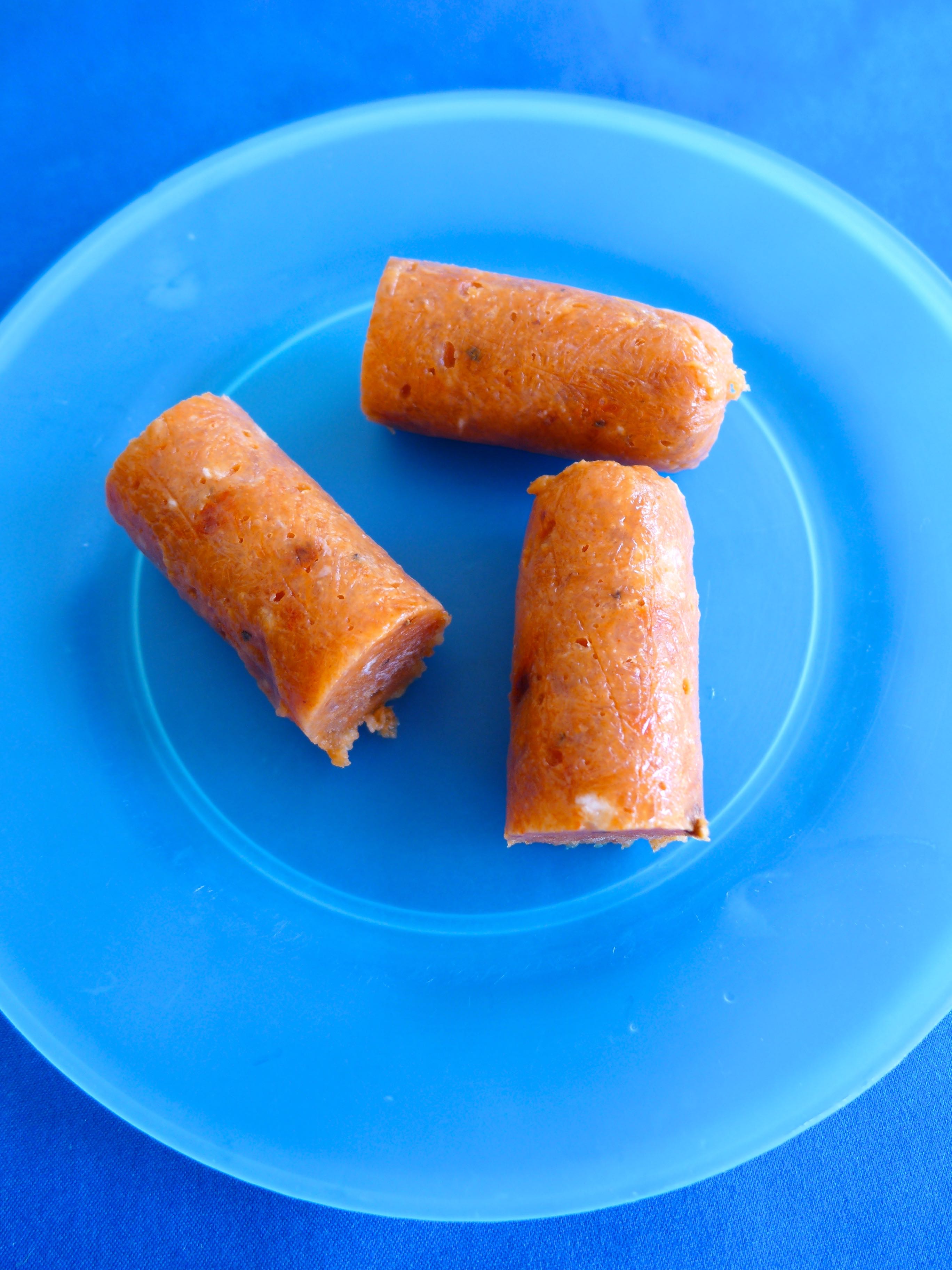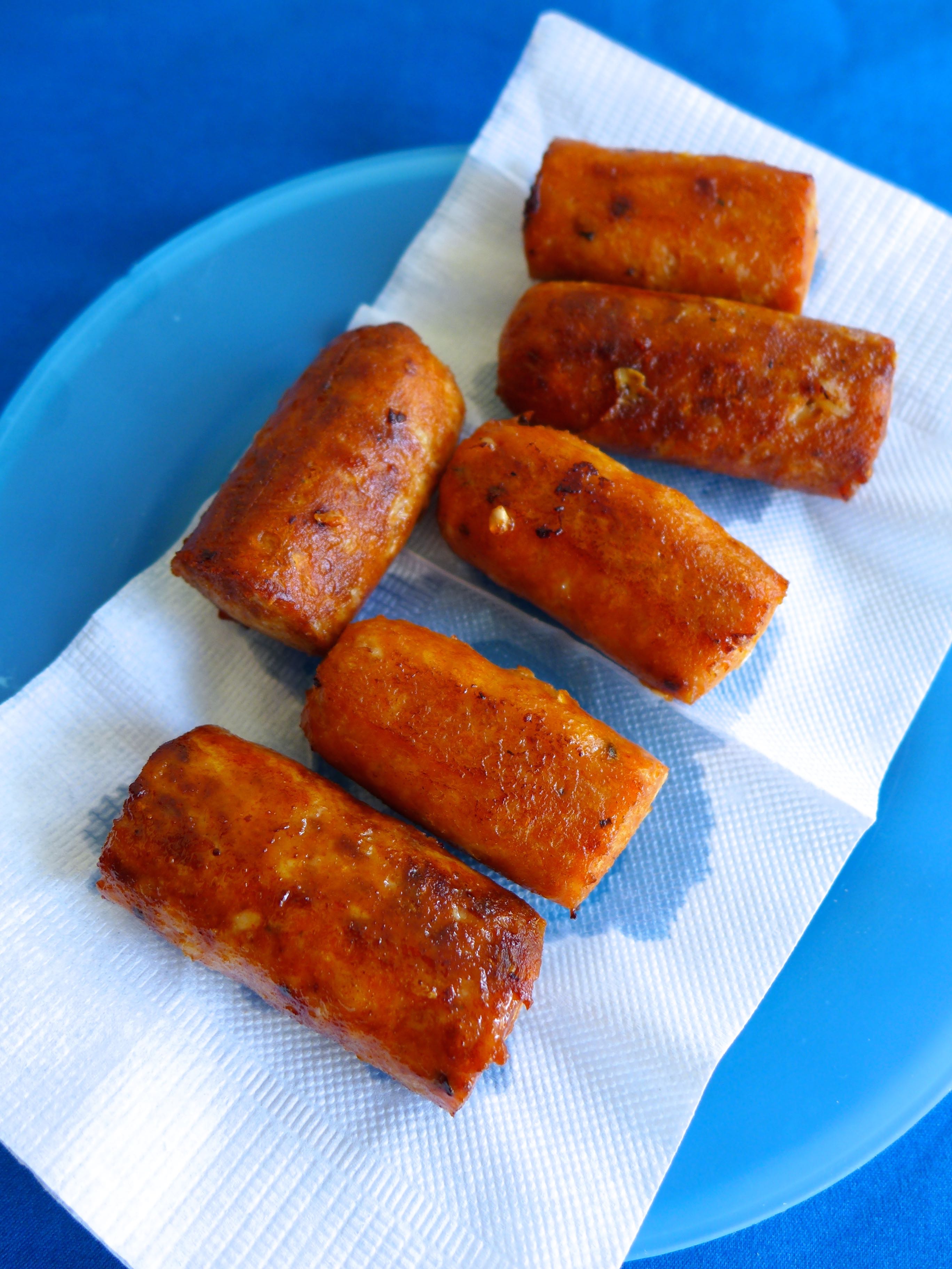 Quito el film. Troceo (opcional) la longanisa, la frío durante 5 minutos y la pongo en papel absorbente.