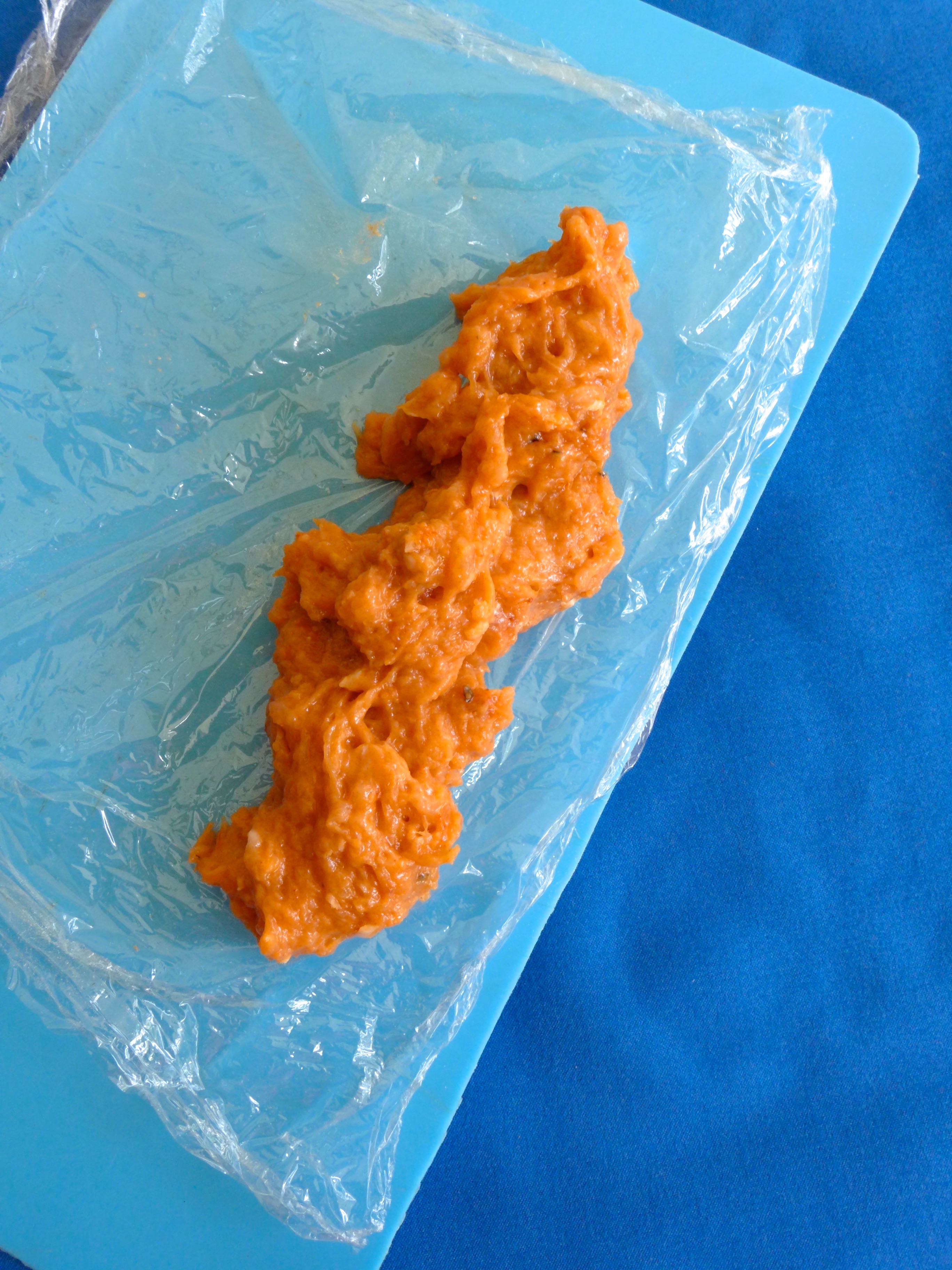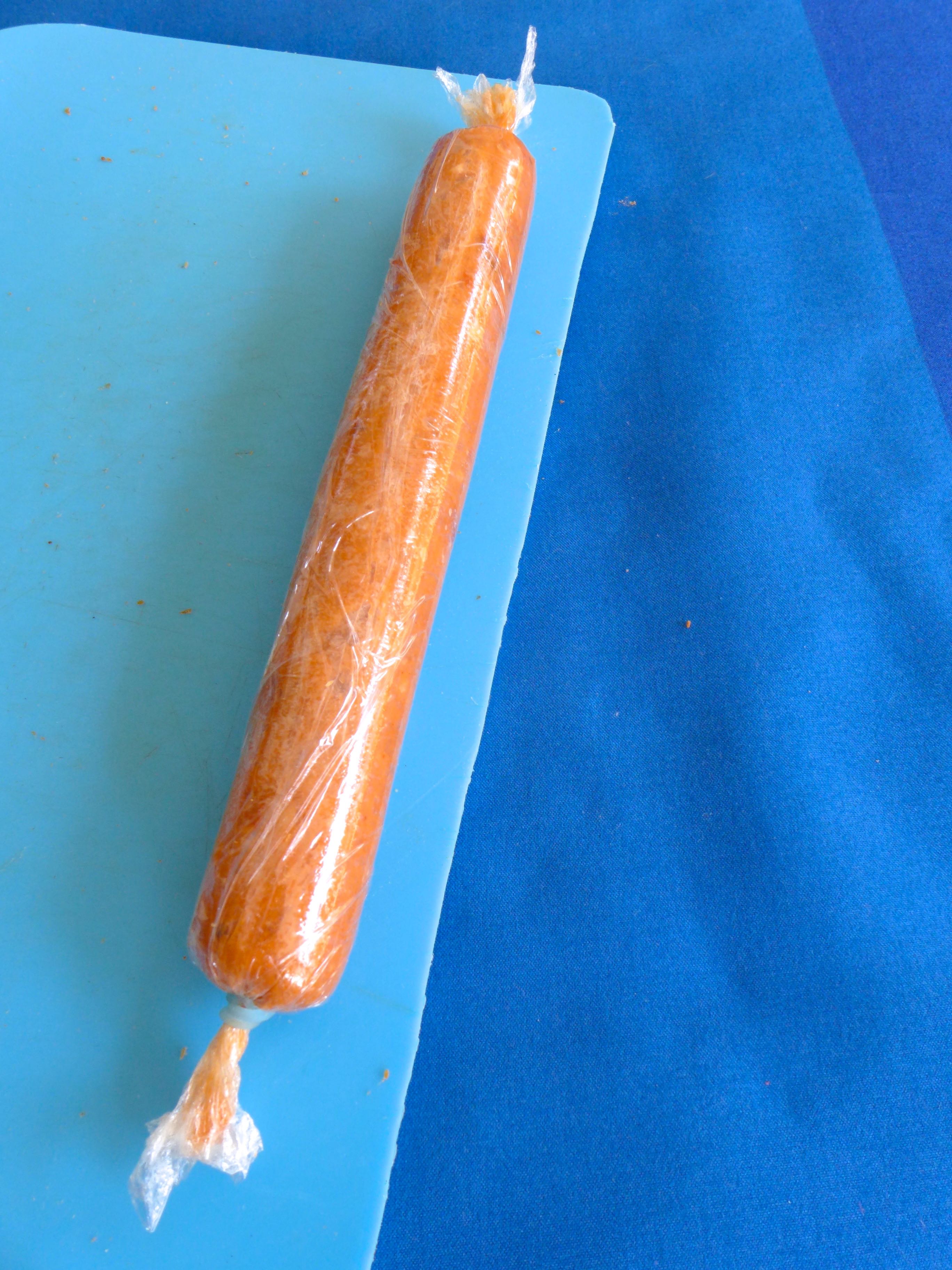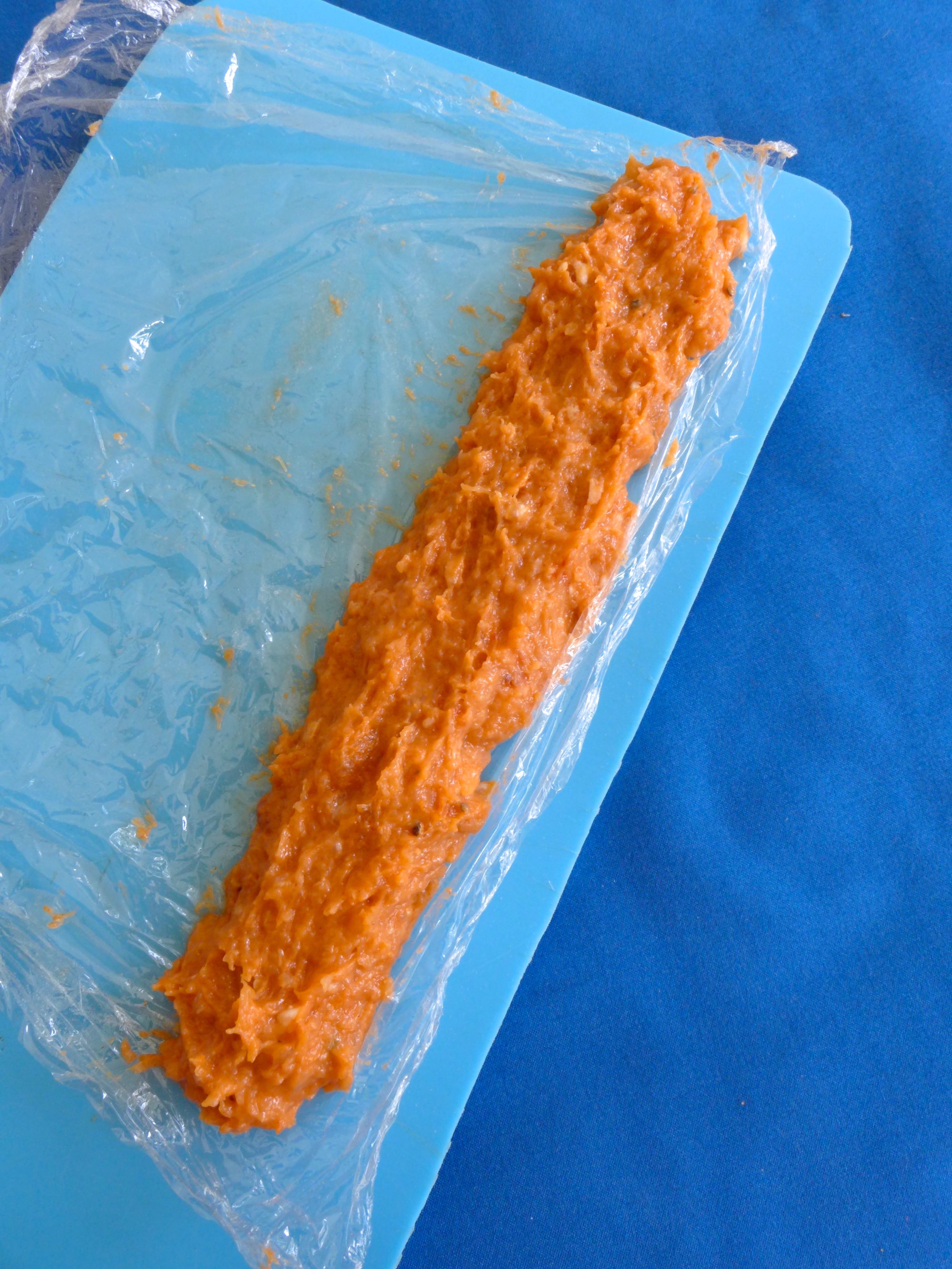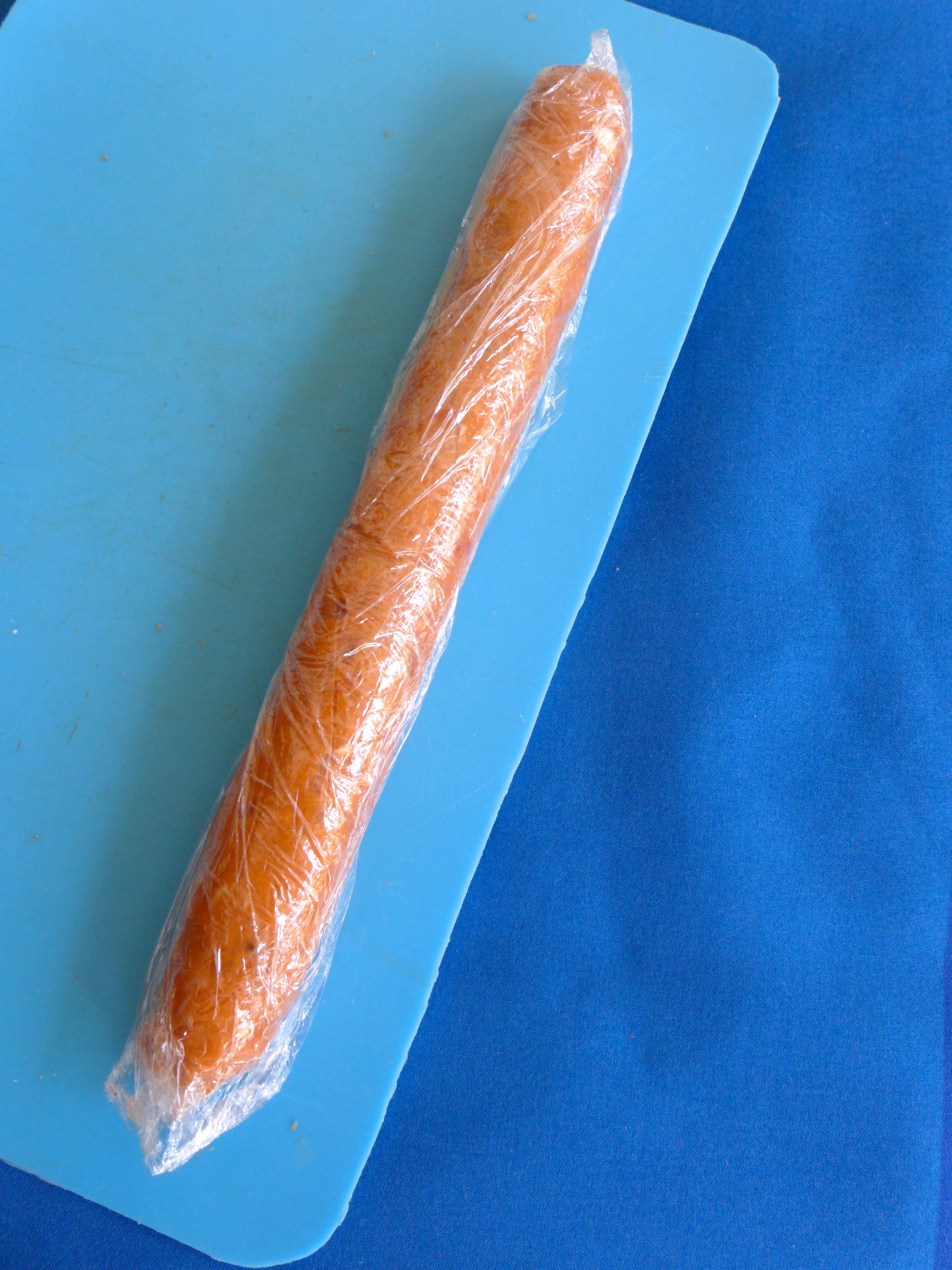 Lo divido en 6 ó 8 partes. Coloco cada parte sobre un extremo de film transparente. Extiendo la mezcla a lo largo, la enrollo y cierro los extremos. Lo dejo reposar en la nevera.