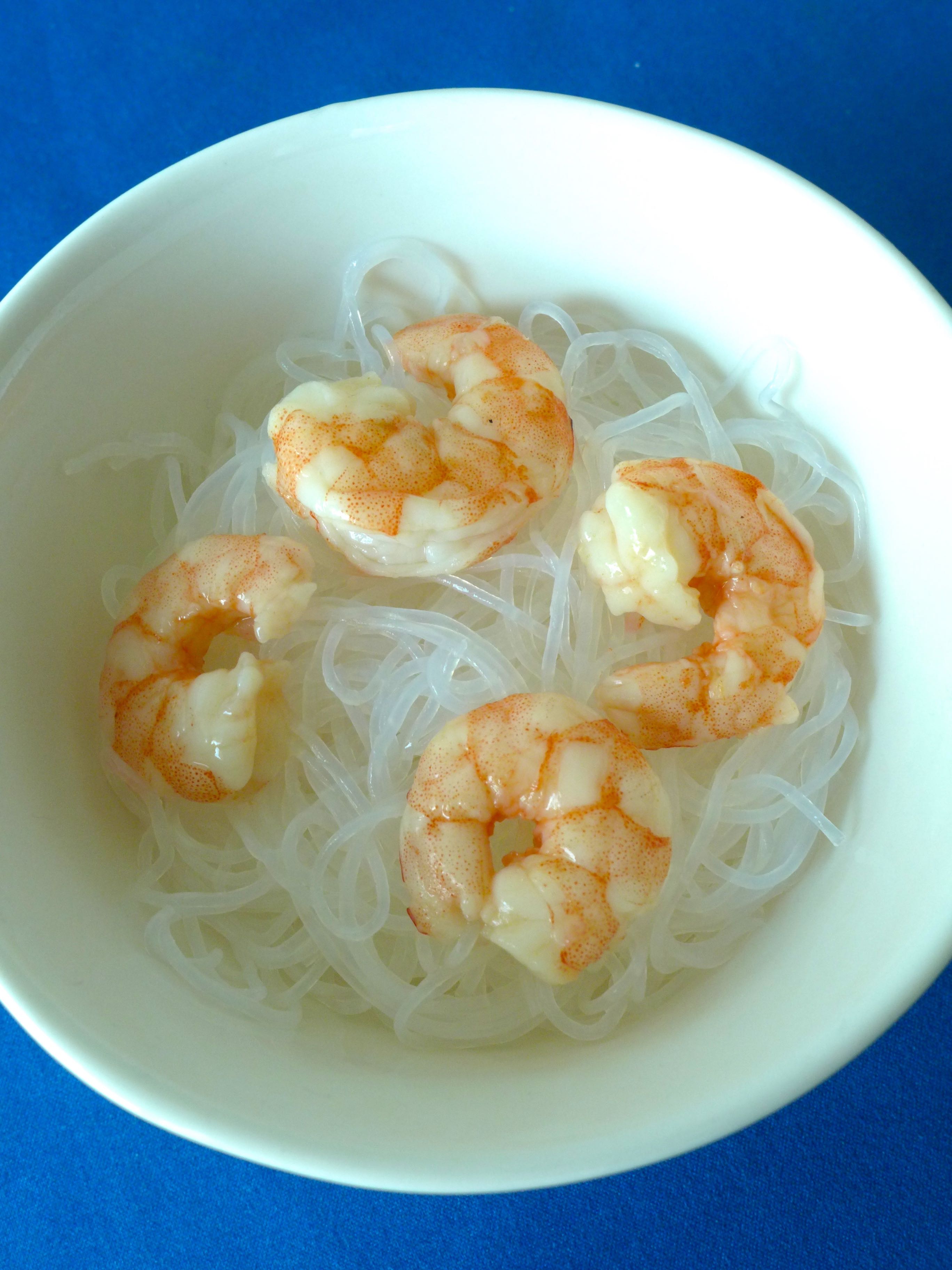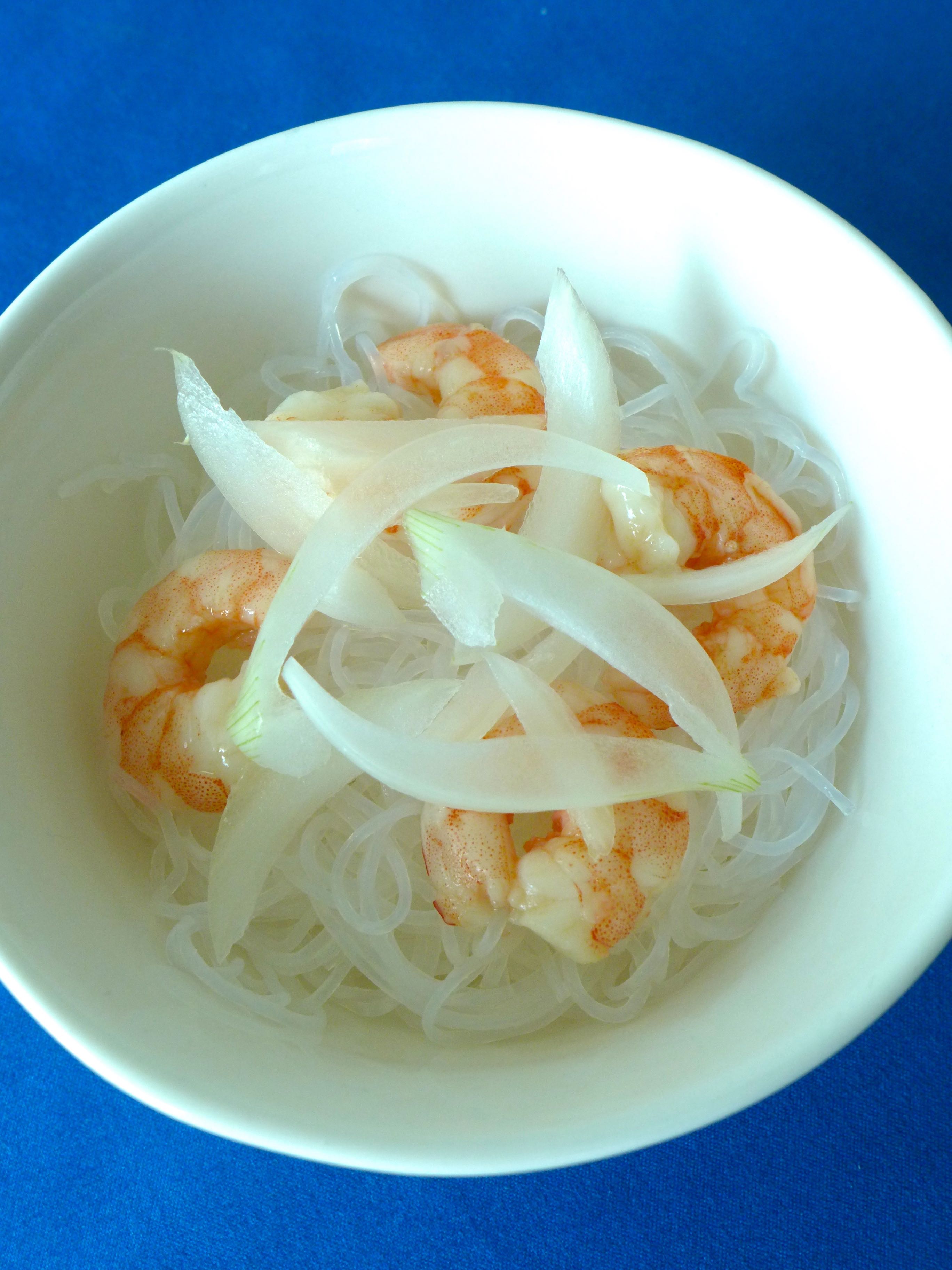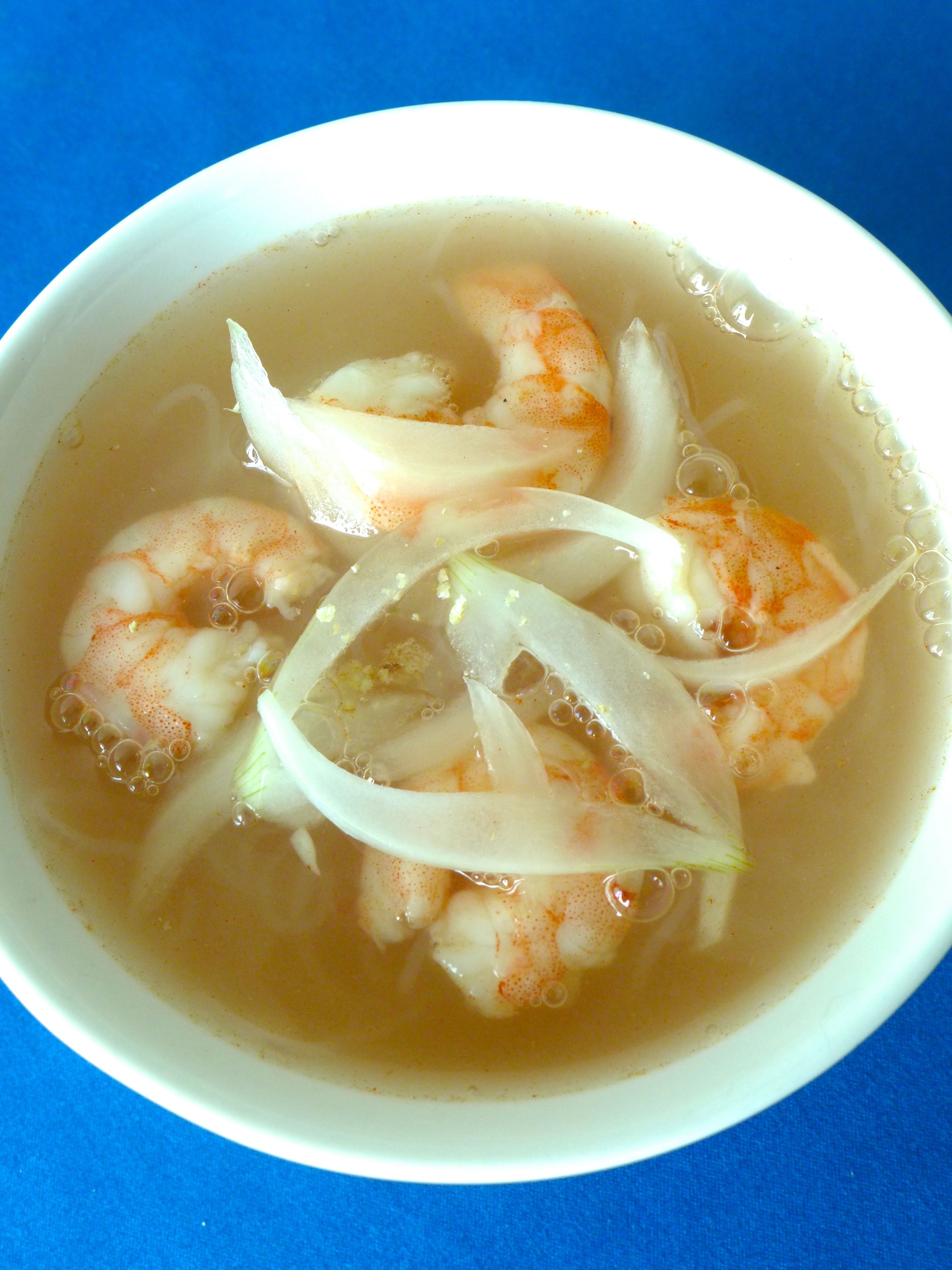 Coloco los fideos en boles. Luego las gambas y la cebolla en juliana. Vierto el caldo caliente en cada bol y añado pimienta molida, apio, hojas de lima y de albahaca, guindilla frita y una rodaja de lima.