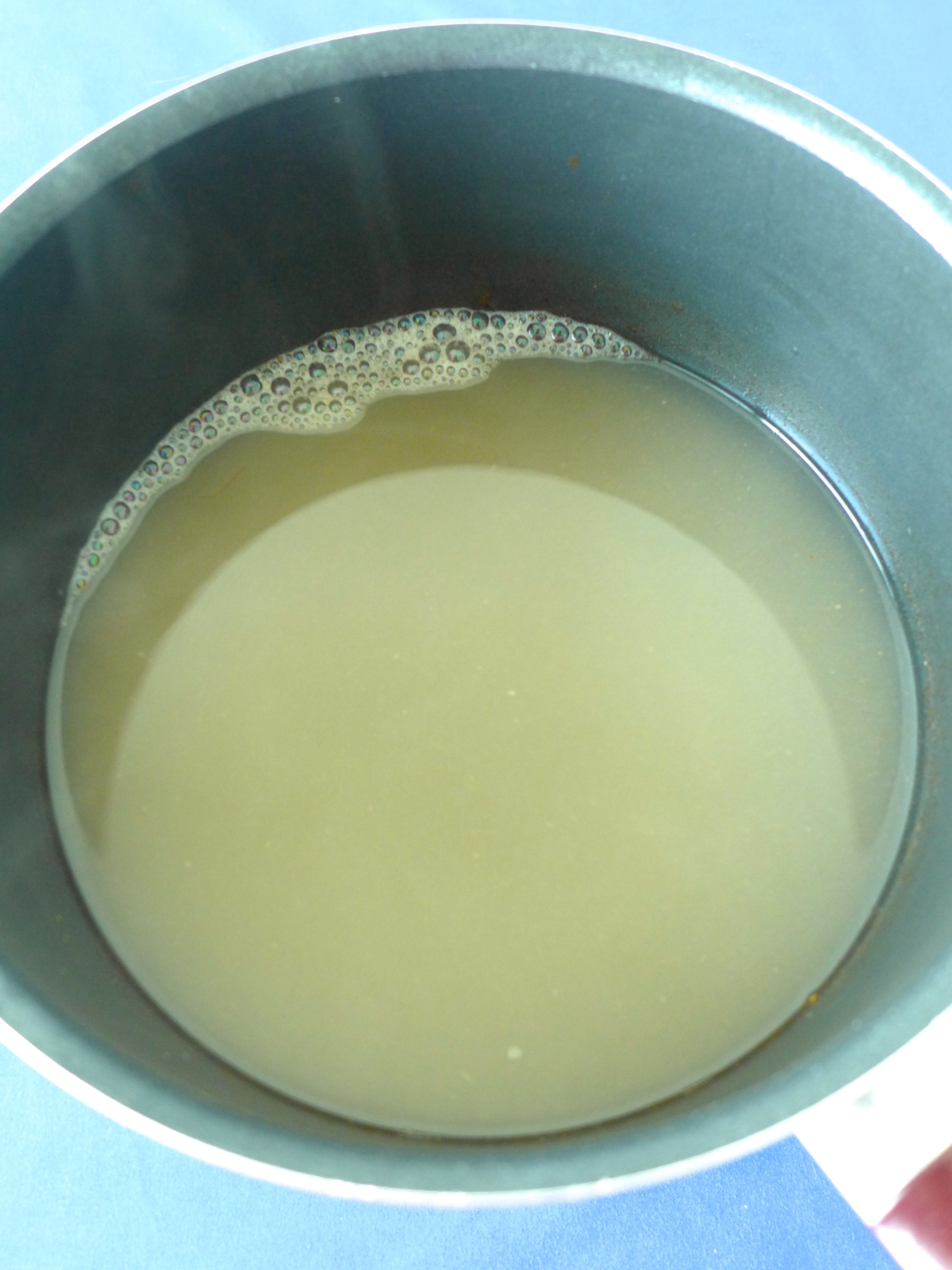 Cuelo el caldo y lo vierto en la cazuela. Lo dejo cocer a fuego bajo.